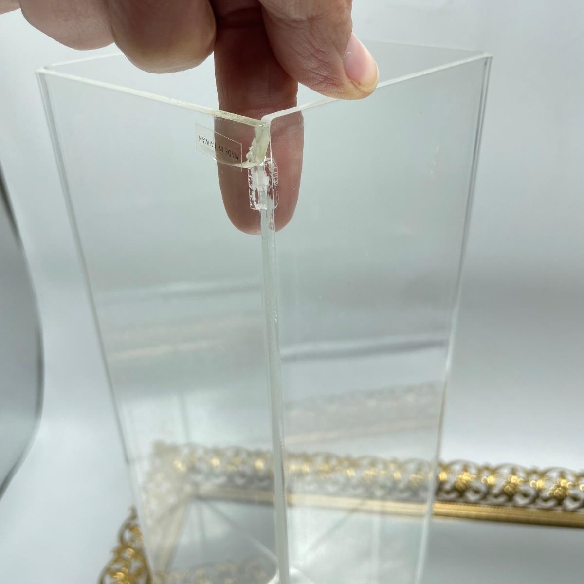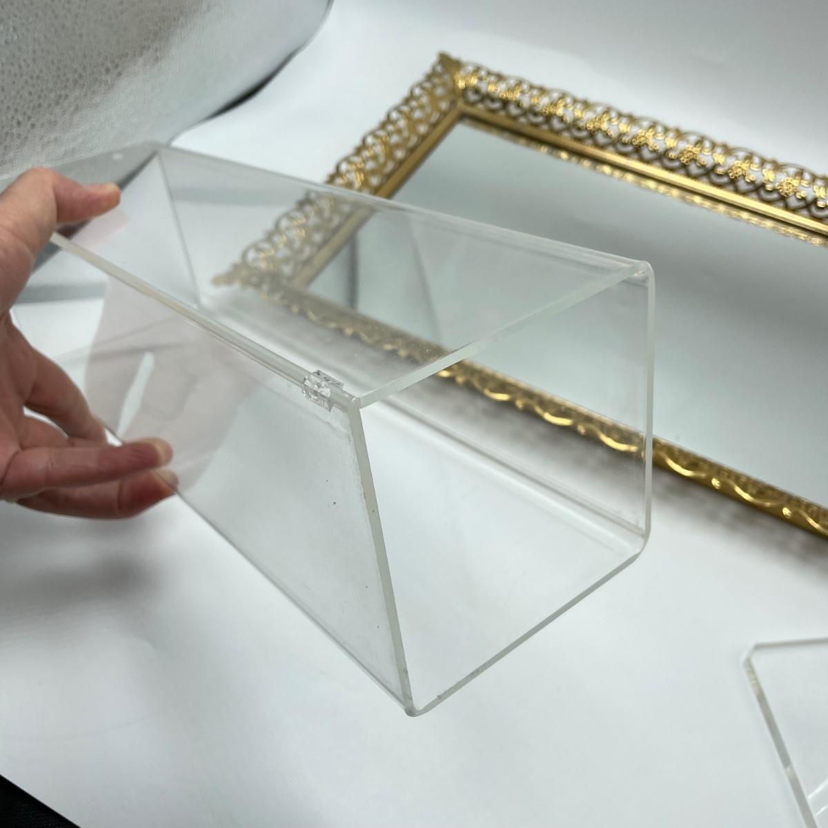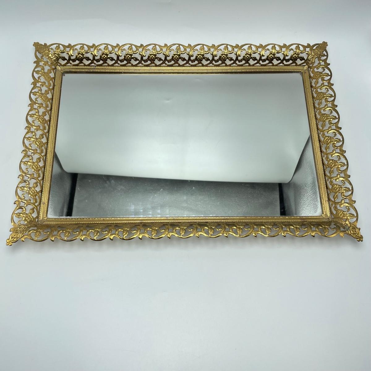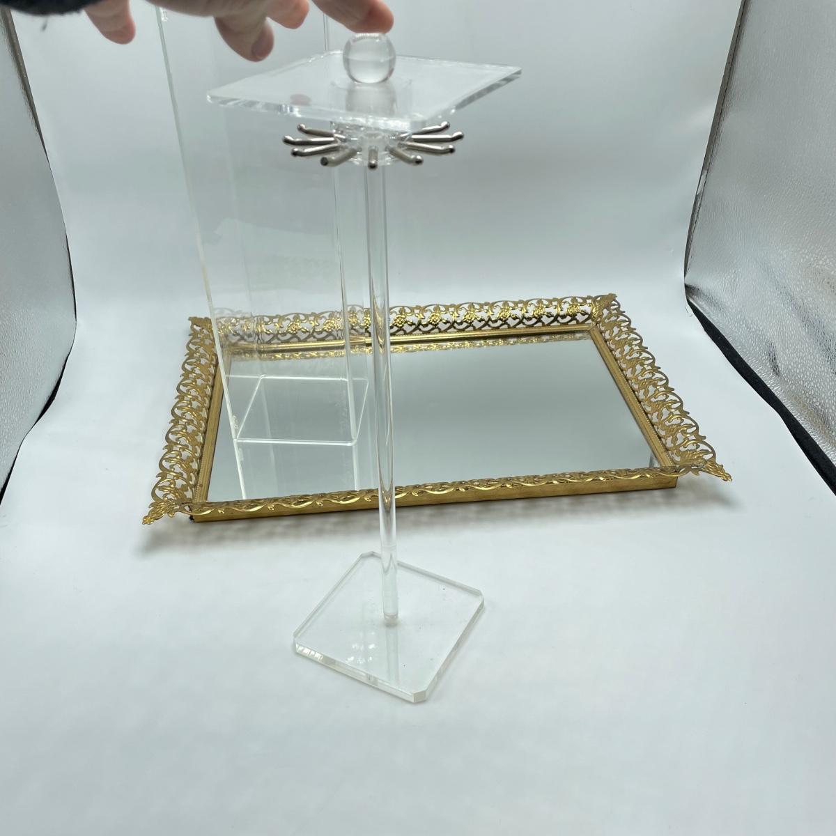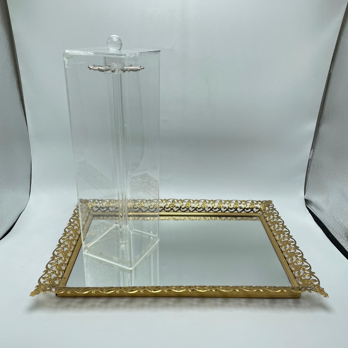 Mirrored tray with a golden flower metal frame. Tray measures 16” x 11” x 1.25”H. Mirror has some scratches on the surface. It is removable. Lot also features an acrylic clear necklace case measuring 4”SQ x 13.75”H. The top and bottom are connected and can be completely removed leaving the walls without a floor or ceiling. Please note cracks in the case. See images. Shipping available.