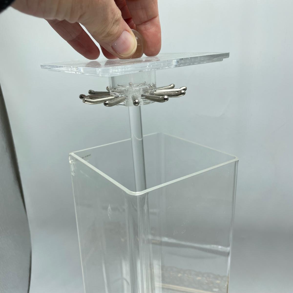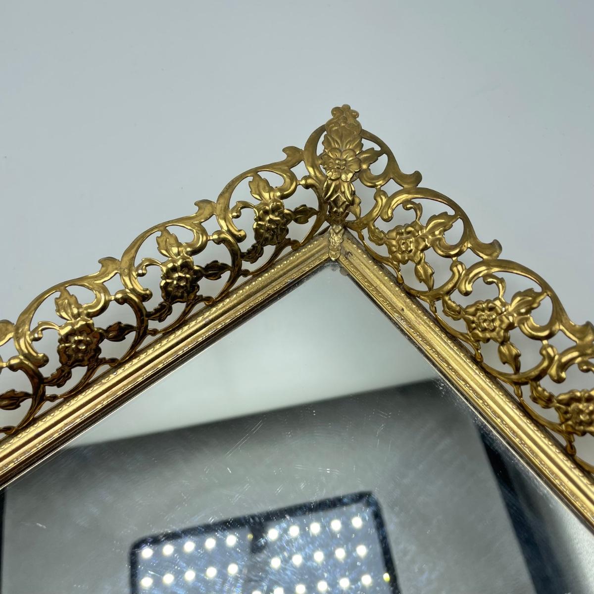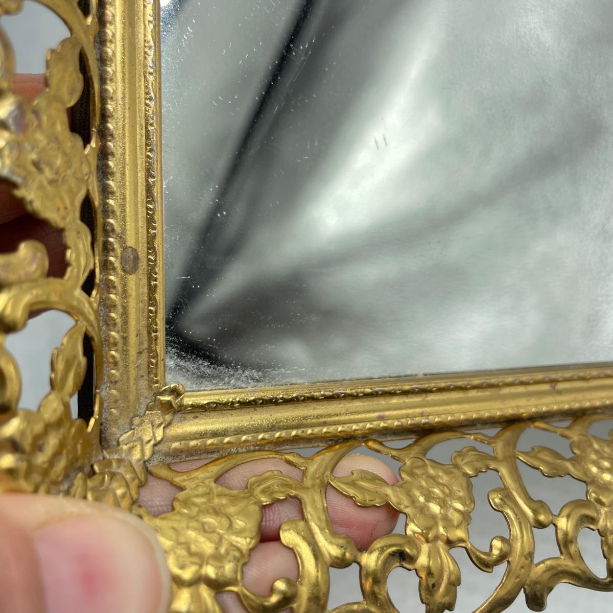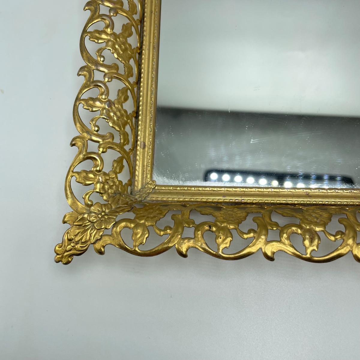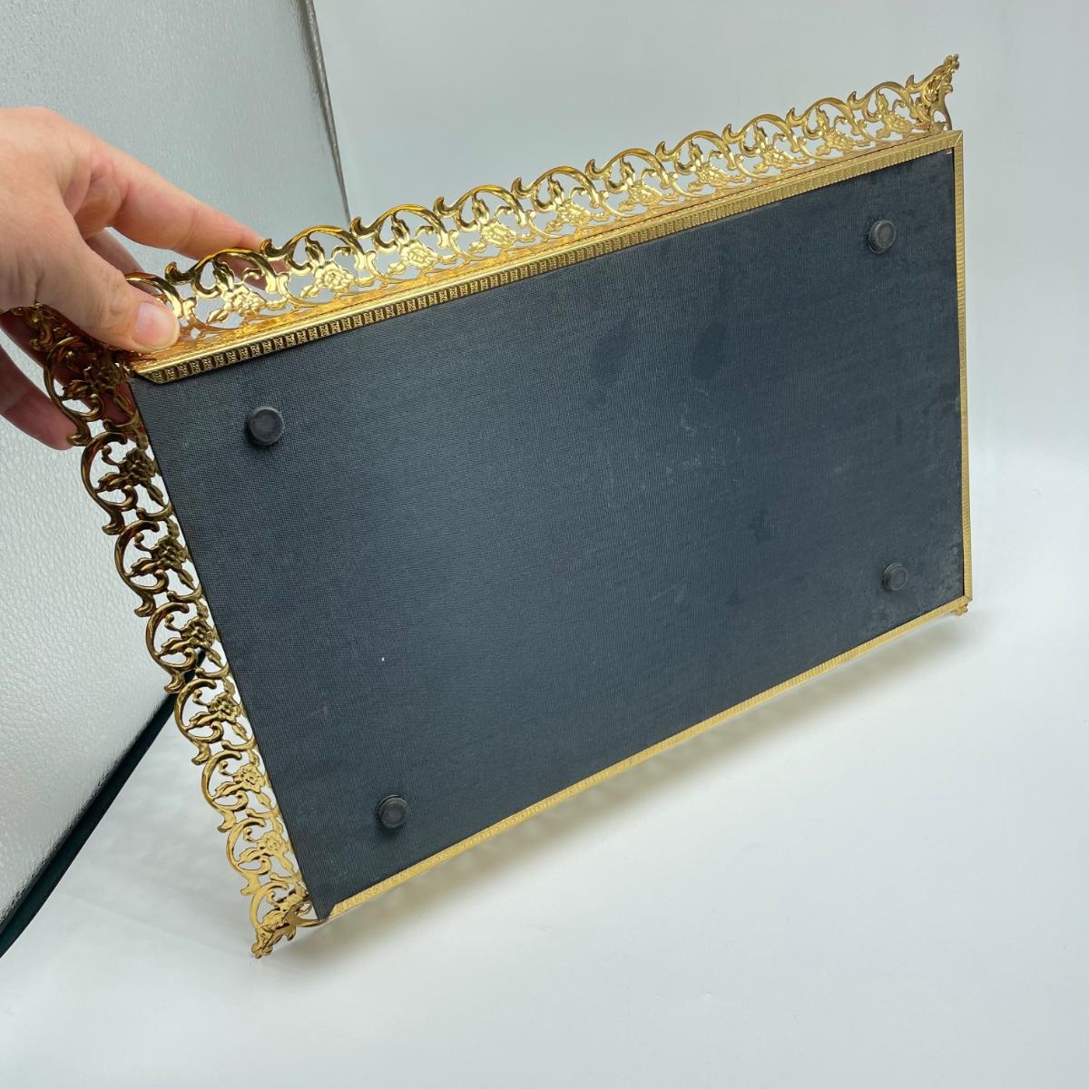 Mirrored tray with a golden flower metal frame. Tray measures 16” x 11” x 1.25”H. Mirror has some scratches on the surface. It is removable. Lot also features an acrylic clear necklace case measuring 4”SQ x 13.75”H. The top and bottom are connected and can be completely removed leaving the walls without a floor or ceiling. Please note cracks in the case. See images. Shipping available.