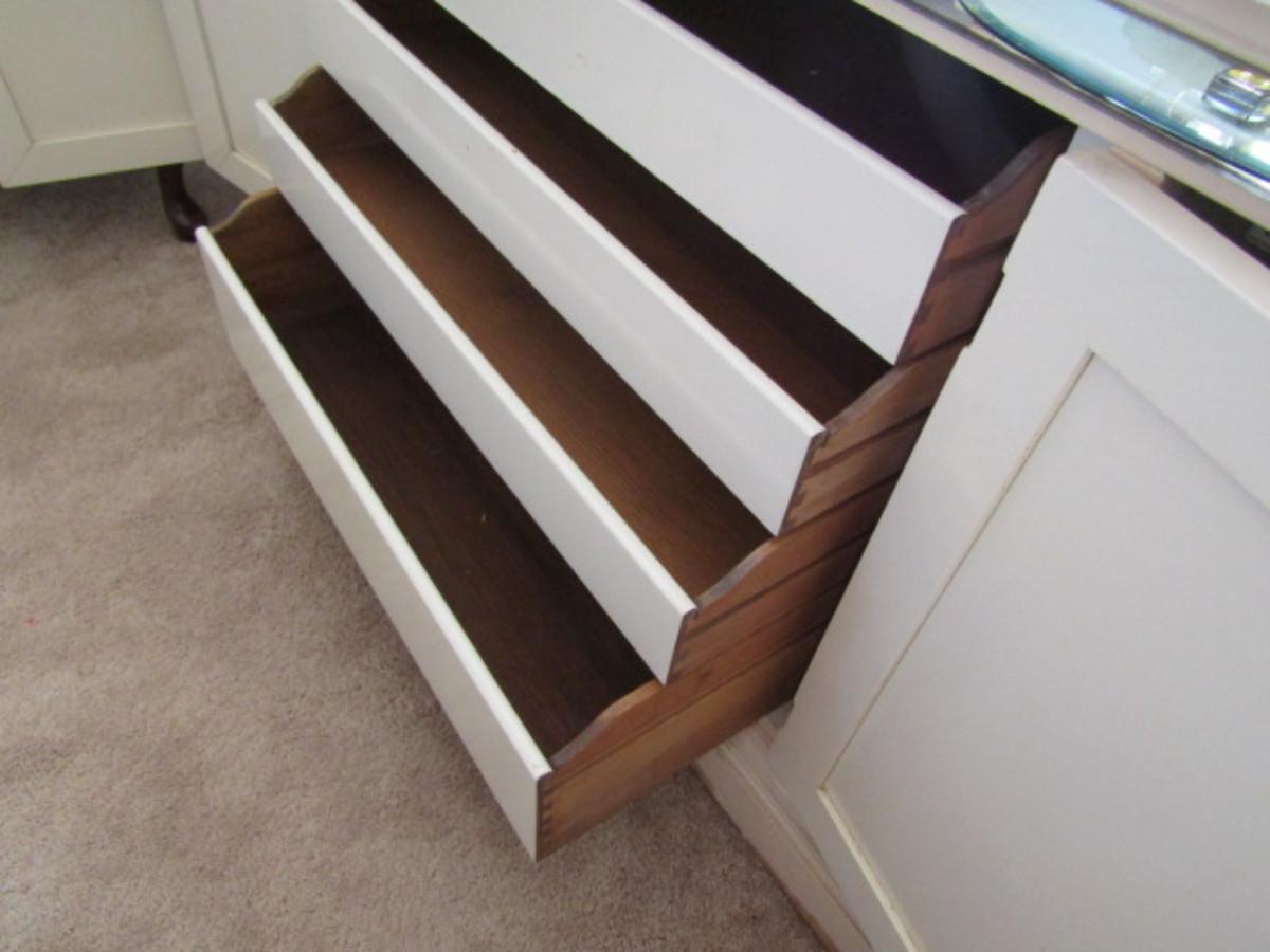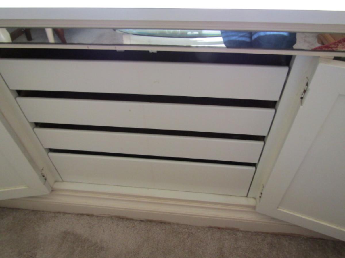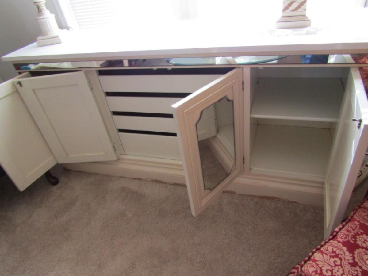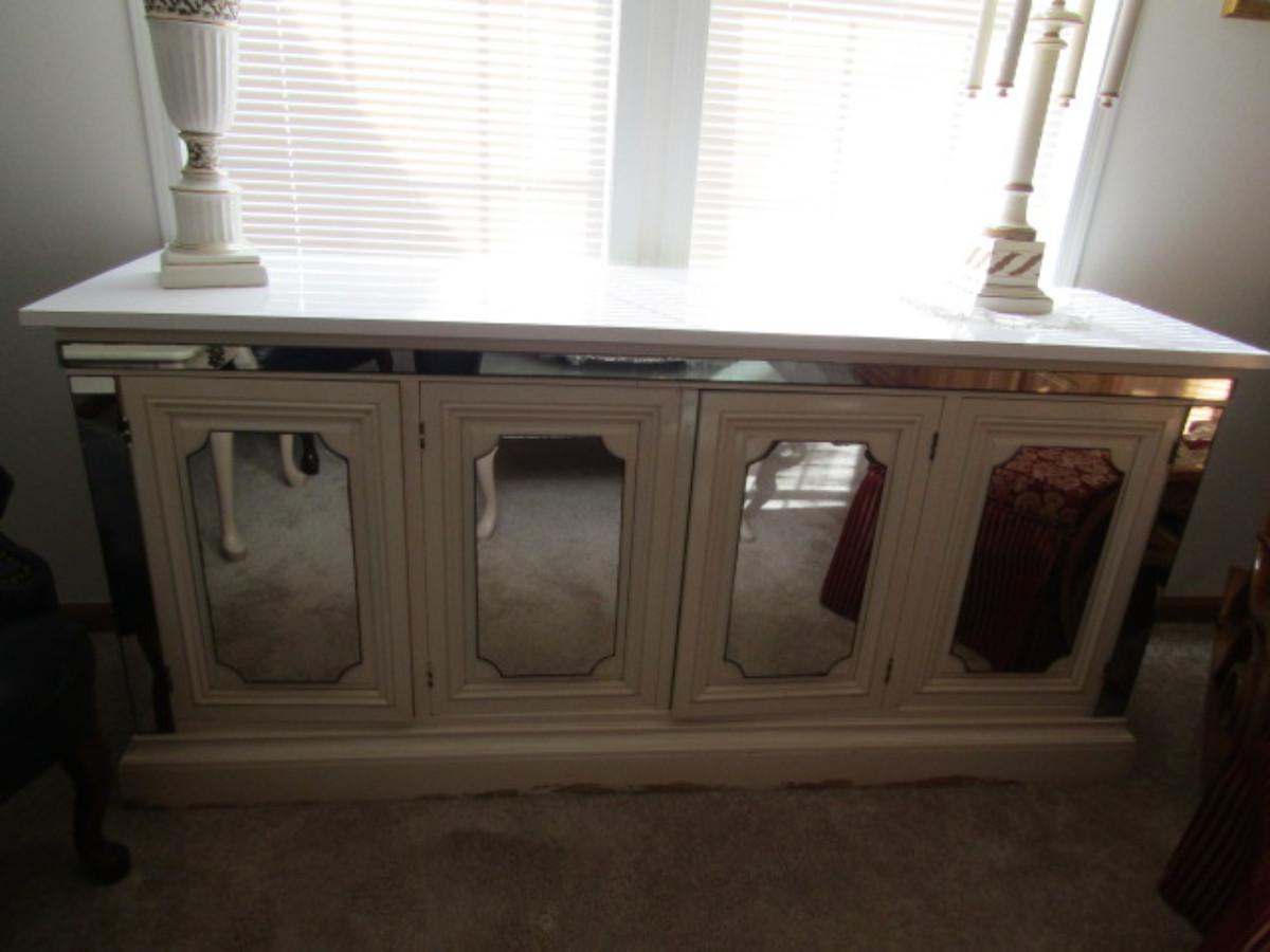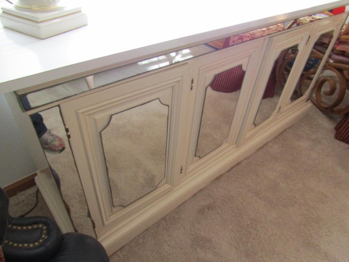 Mirrored Wood Finish Sideboard by Kindel. Cabinet on each end, drawers in center.