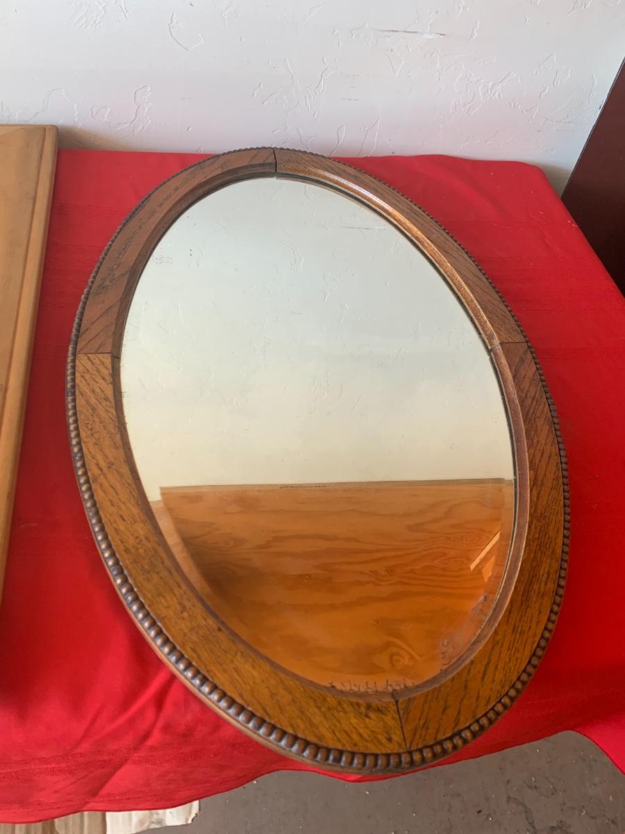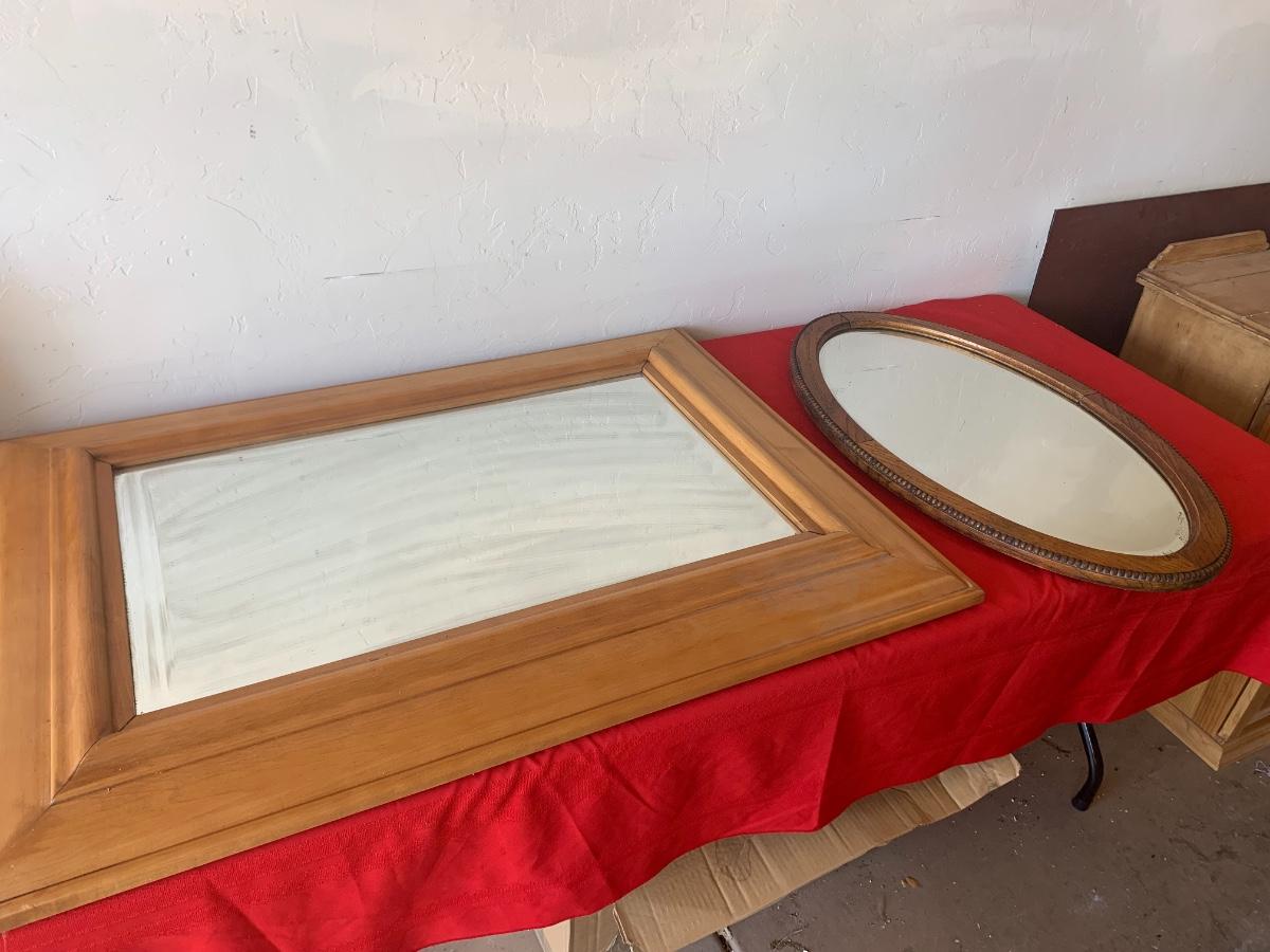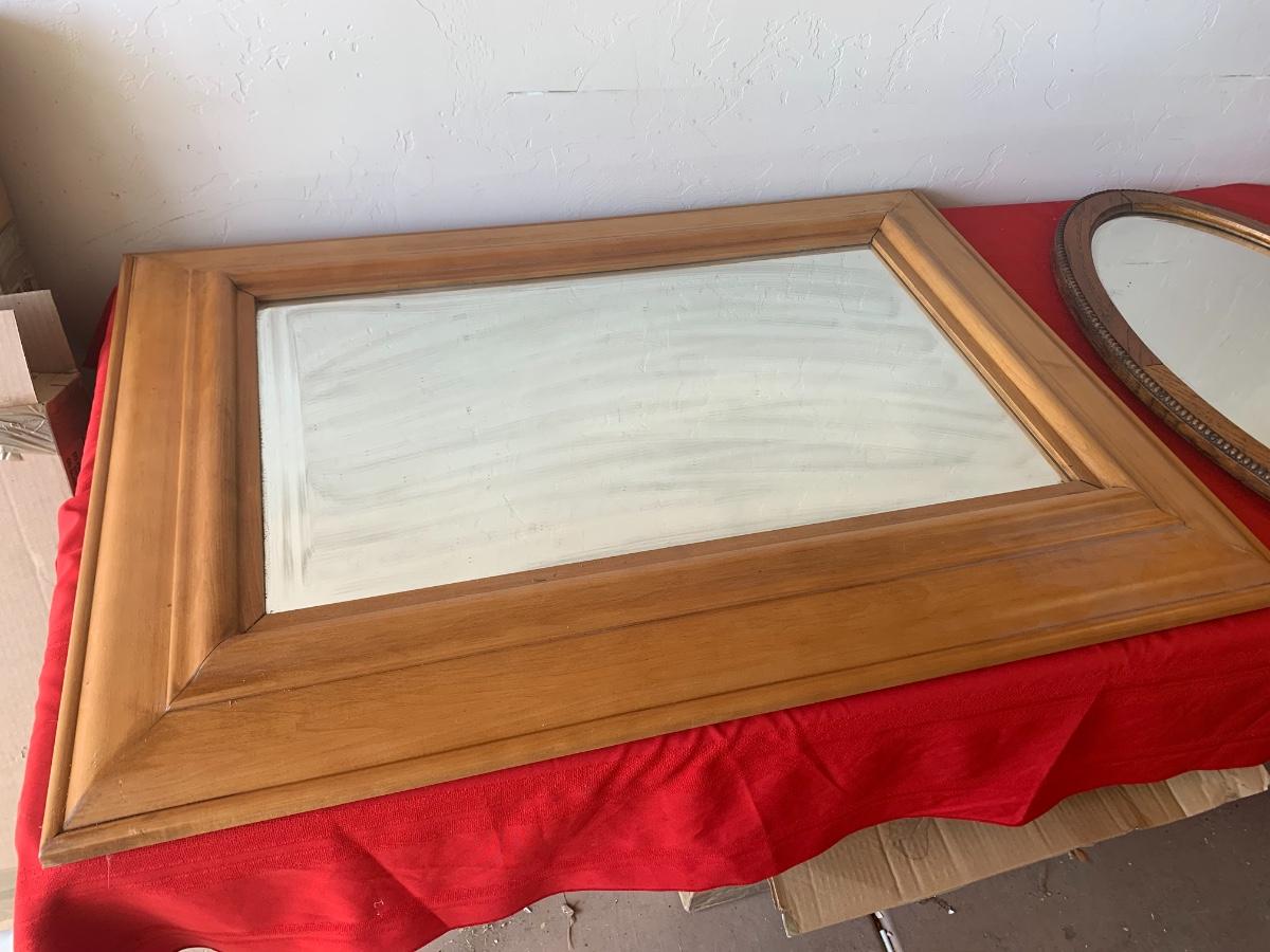 One antique oval wood frame mirror with wooden edging, (31 inches X 20 inches), One rectangular pine mirror with beveled edge (42 inches X 30 inches)