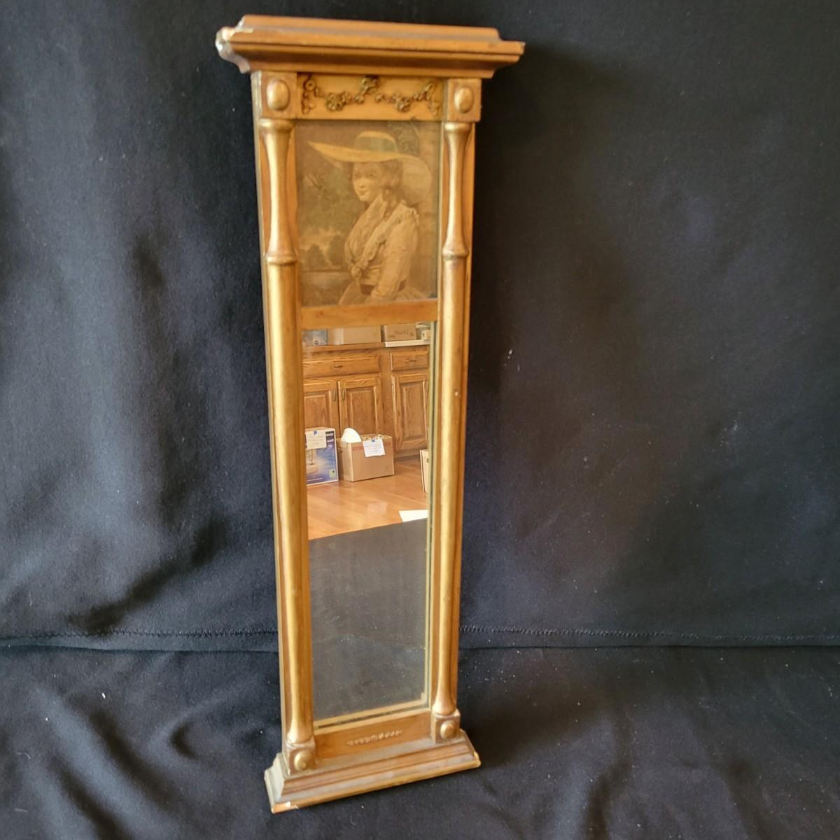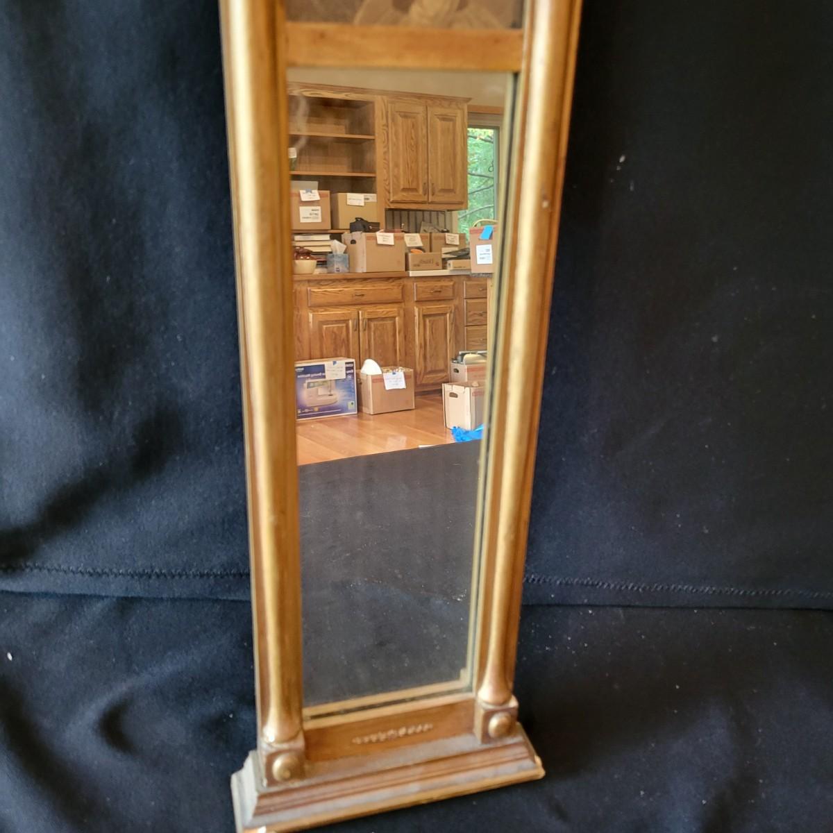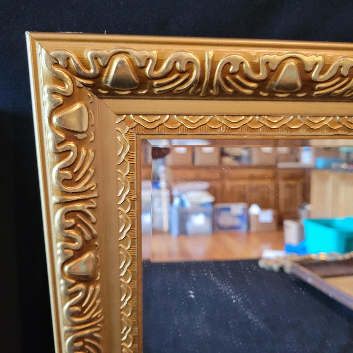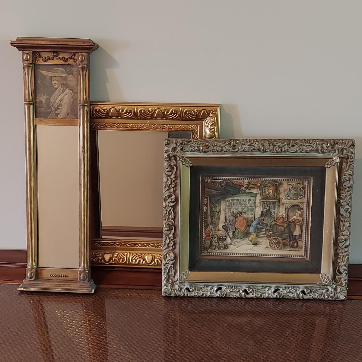 An assortment of three mirrors and two pieces of art. Included is a small odd shaped mirror in an ornate wooden frame with a gold finish, a beveled mirror in a wooden ornate gold frame and another mirror in a vintage wooden gold frame with a piece of vintage art. Also included is a vintage advertisement in a wooden frame and piece of layered paper art in an ornate wooden gold frame. The tall narrow mirror measures approximately 6.5" x 20"H. Shipping available. Shipping can be costly. We suggest contacting our preferred local shipping provider, Postage Express, with dimensions and getting an estimate before bidding: (828) 670-5501 or postageexpress@yahoo.com.