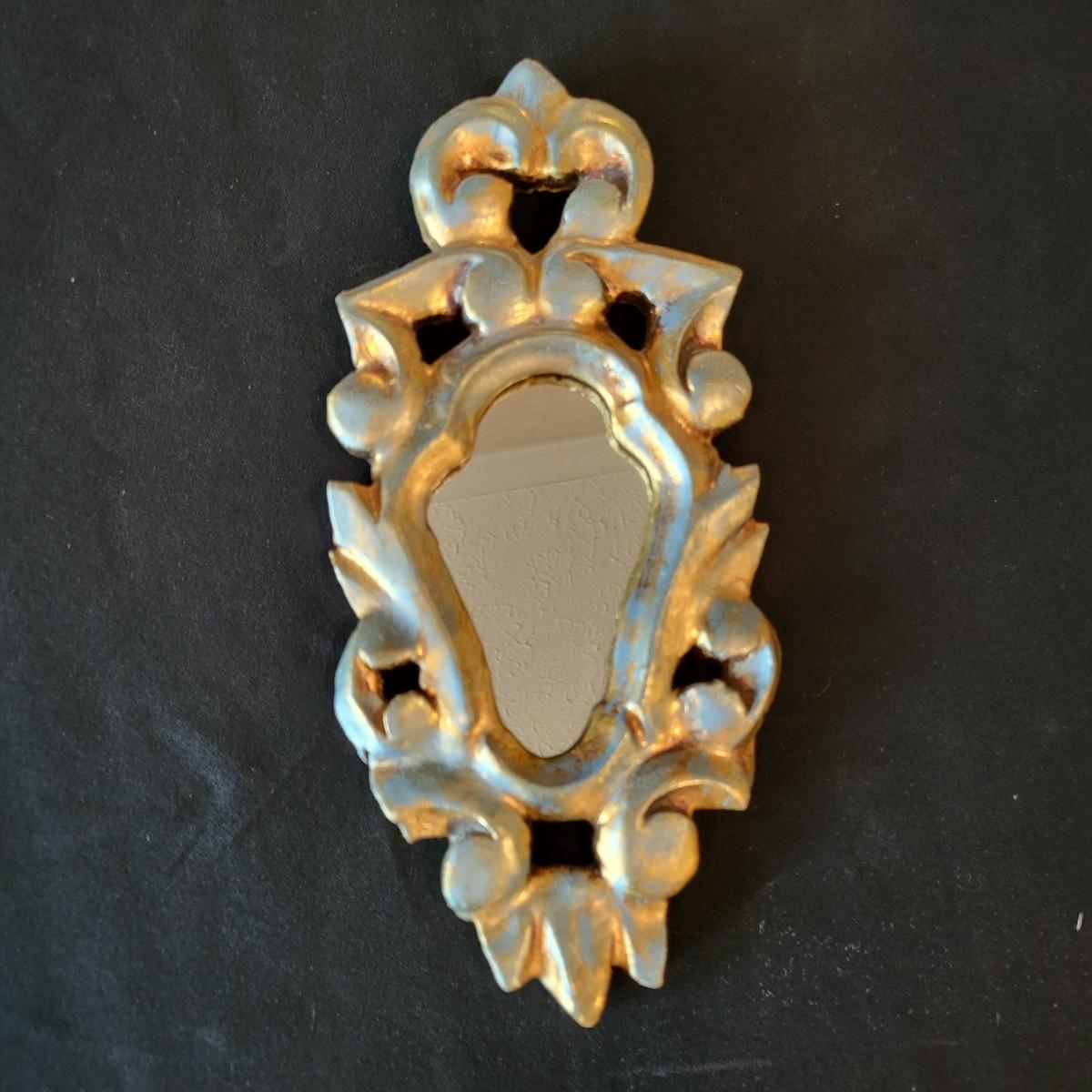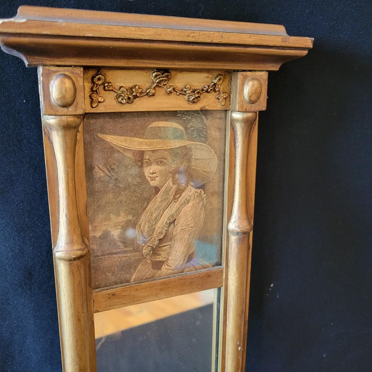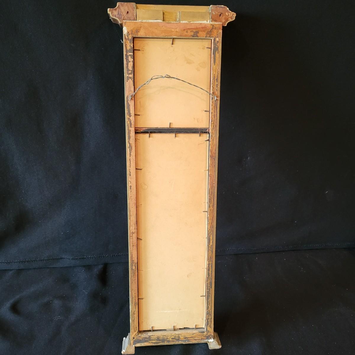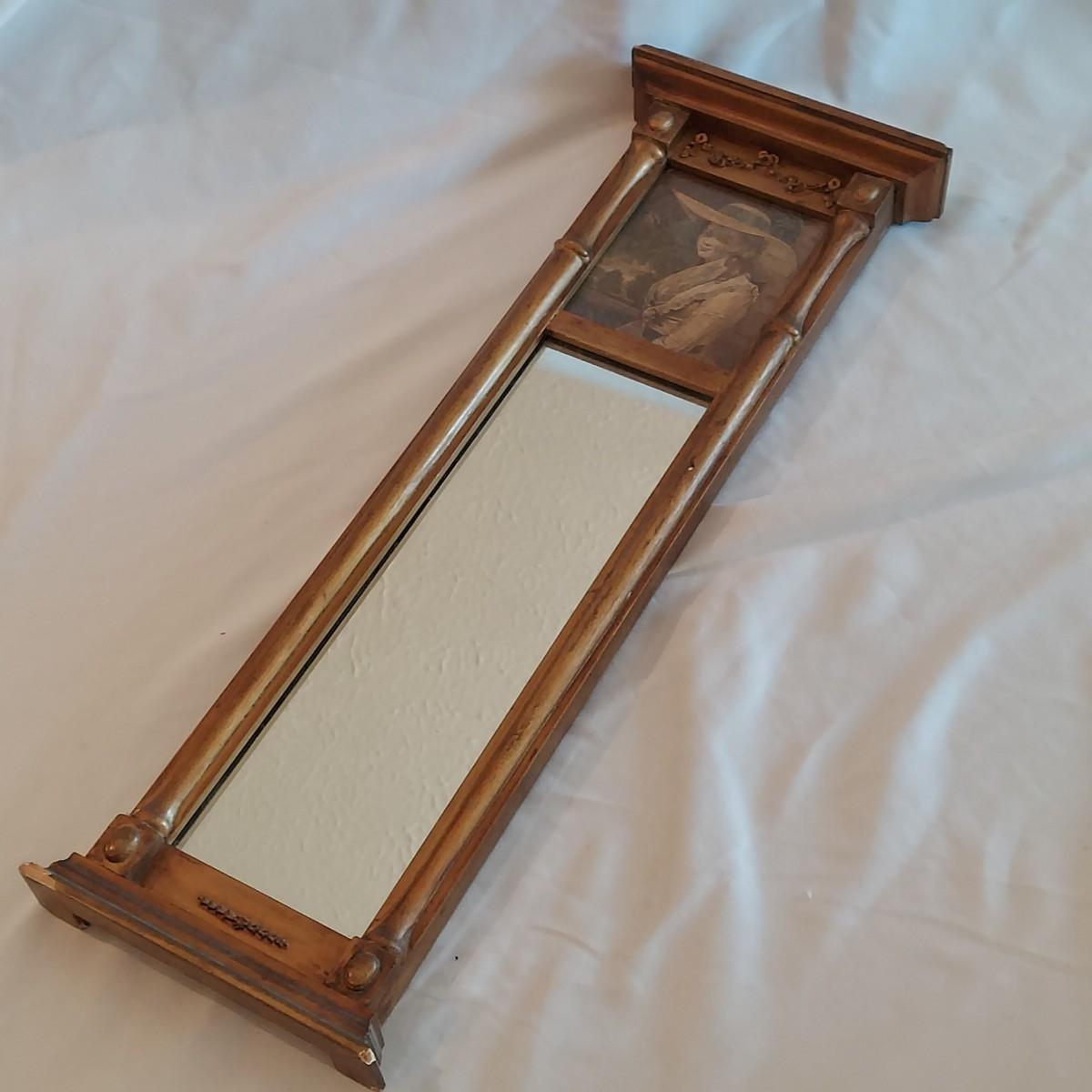 An assortment of three mirrors and two pieces of art. Included is a small odd shaped mirror in an ornate wooden frame with a gold finish, a beveled mirror in a wooden ornate gold frame and another mirror in a vintage wooden gold frame with a piece of vintage art. Also included is a vintage advertisement in a wooden frame and piece of layered paper art in an ornate wooden gold frame. The tall narrow mirror measures approximately 6.5" x 20"H. Shipping available. Shipping can be costly. We suggest contacting our preferred local shipping provider, Postage Express, with dimensions and getting an estimate before bidding: (828) 670-5501 or postageexpress@yahoo.com.
