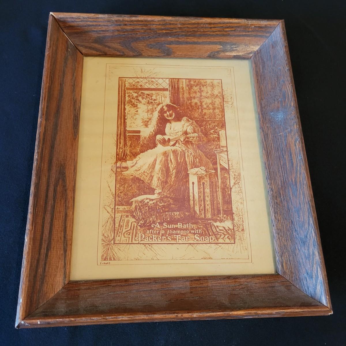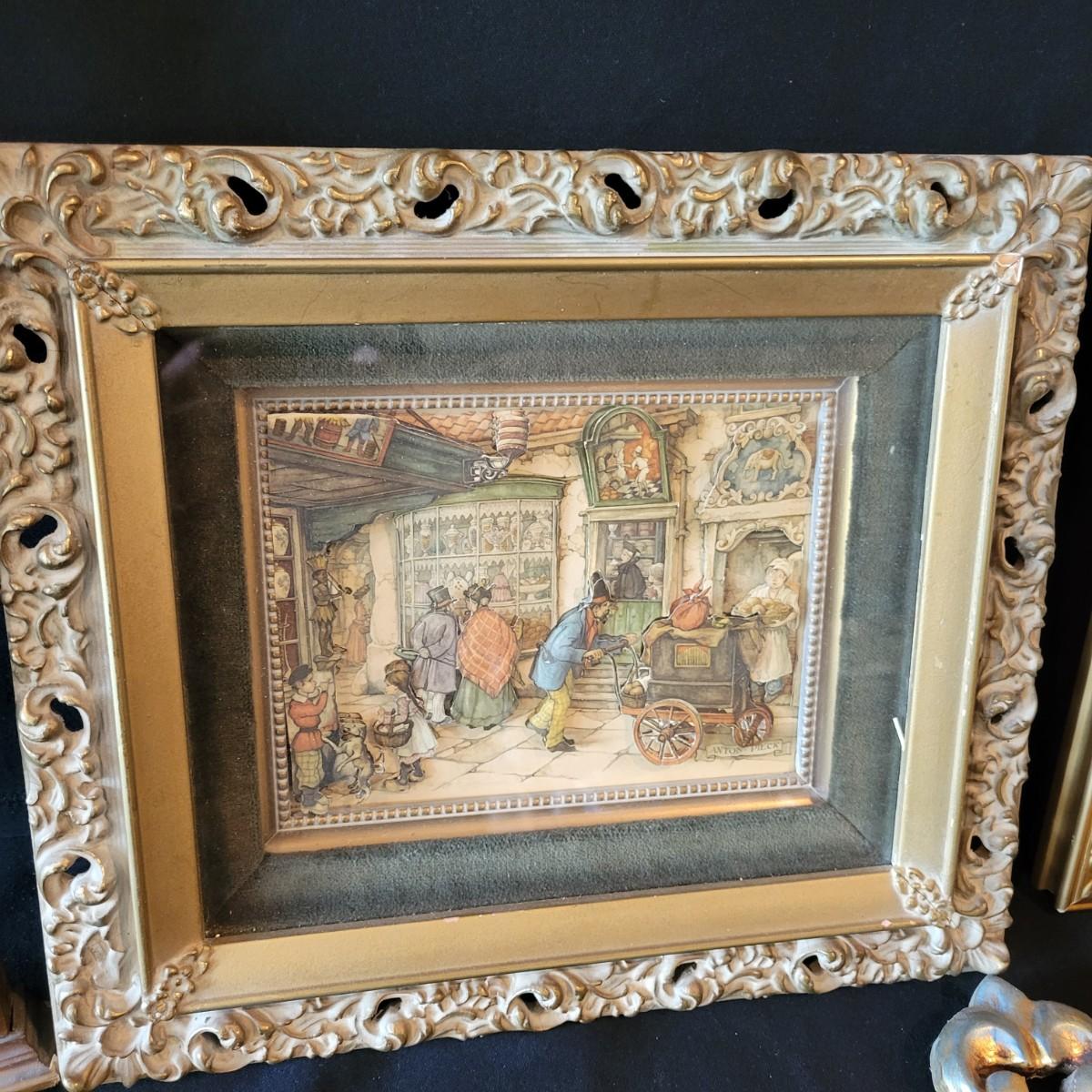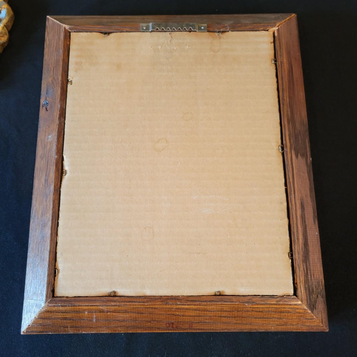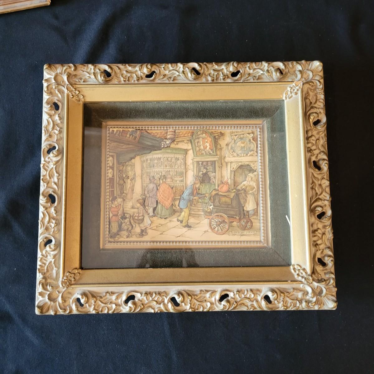 An assortment of three mirrors and two pieces of art. Included is a small odd shaped mirror in an ornate wooden frame with a gold finish, a beveled mirror in a wooden ornate gold frame and another mirror in a vintage wooden gold frame with a piece of vintage art. Also included is a vintage advertisement in a wooden frame and piece of layered paper art in an ornate wooden gold frame. The tall narrow mirror measures approximately 6.5" x 20"H. Shipping available. Shipping can be costly. We suggest contacting our preferred local shipping provider, Postage Express, with dimensions and getting an estimate before bidding: (828) 670-5501 or postageexpress@yahoo.com.
