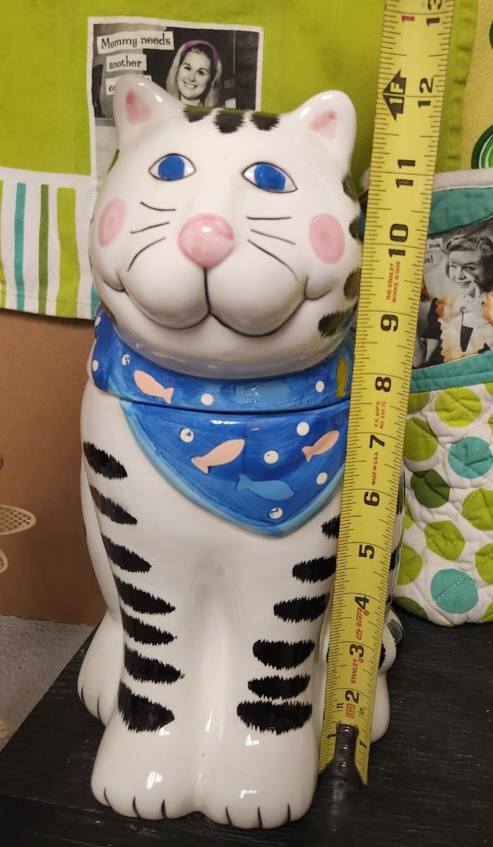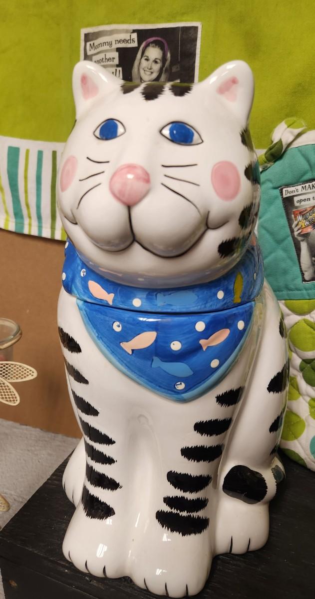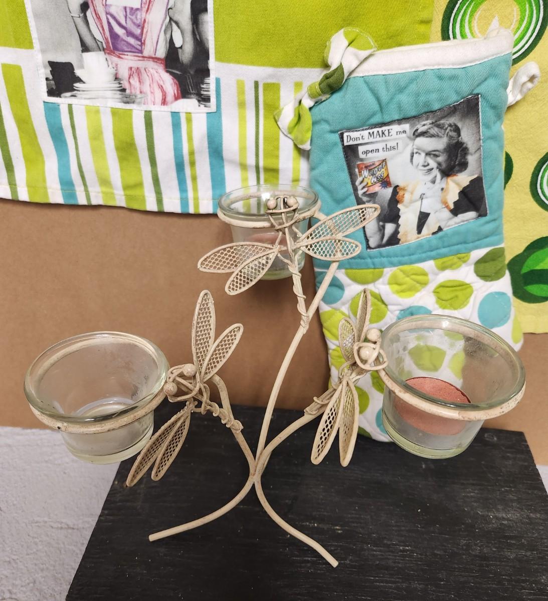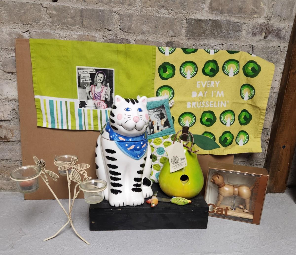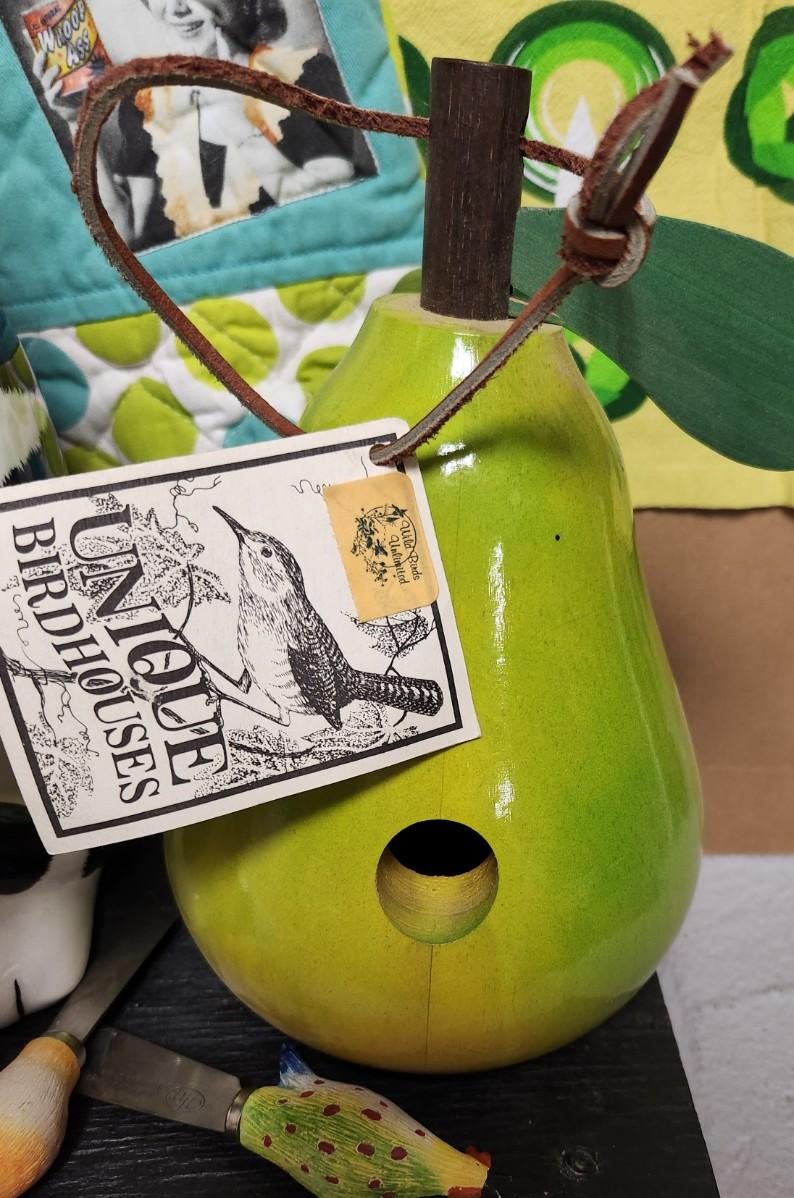 Cat cookie jar, a couple tea towels, hot pad, dragonfly votive holder, a pair of chicken spreaders, a cat artist model in box and a great pear shaped bird house.