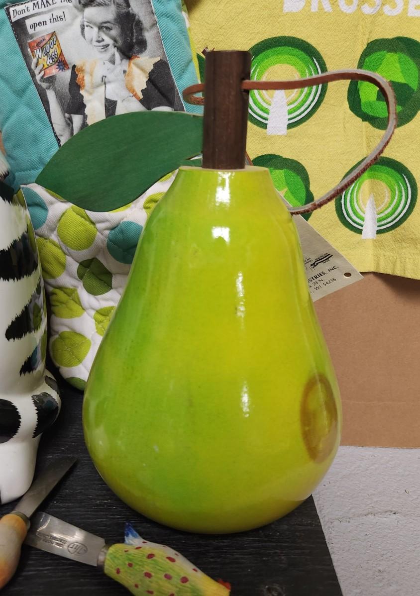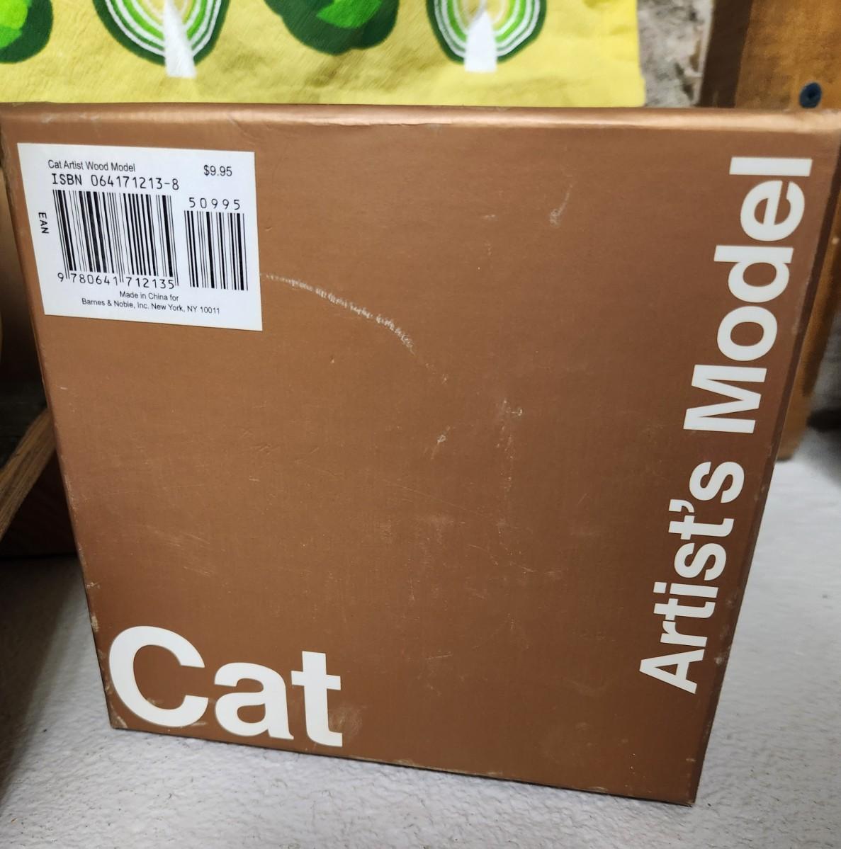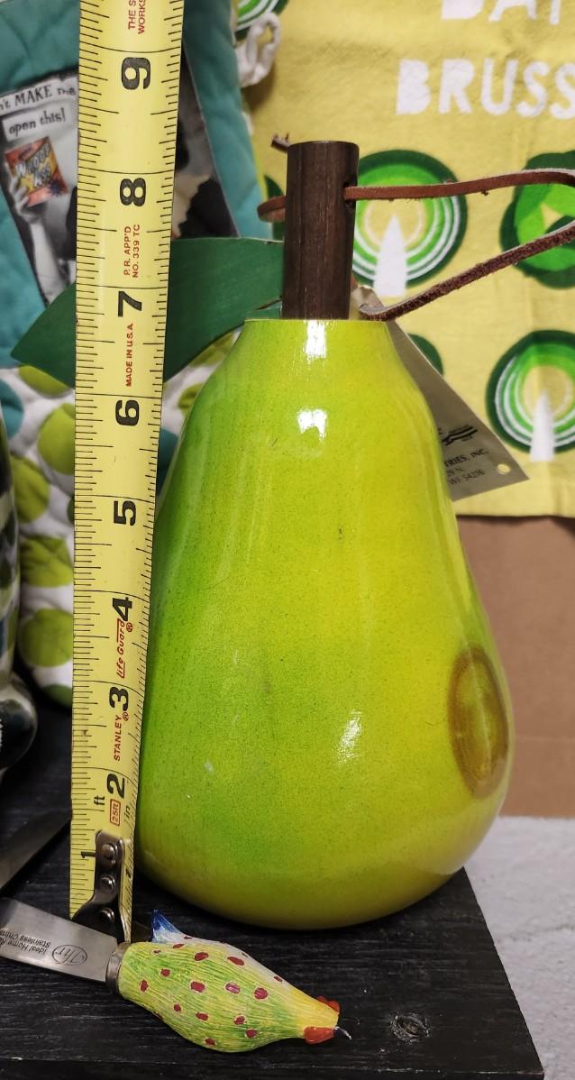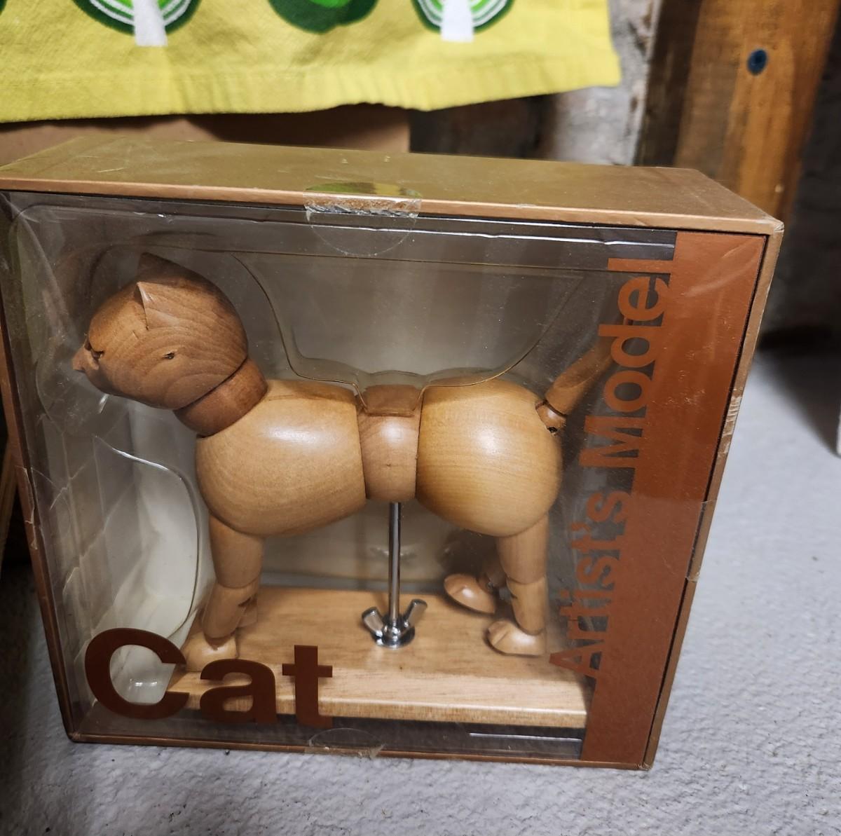 Cat cookie jar, a couple tea towels, hot pad, dragonfly votive holder, a pair of chicken spreaders, a cat artist model in box and a great pear shaped bird house.