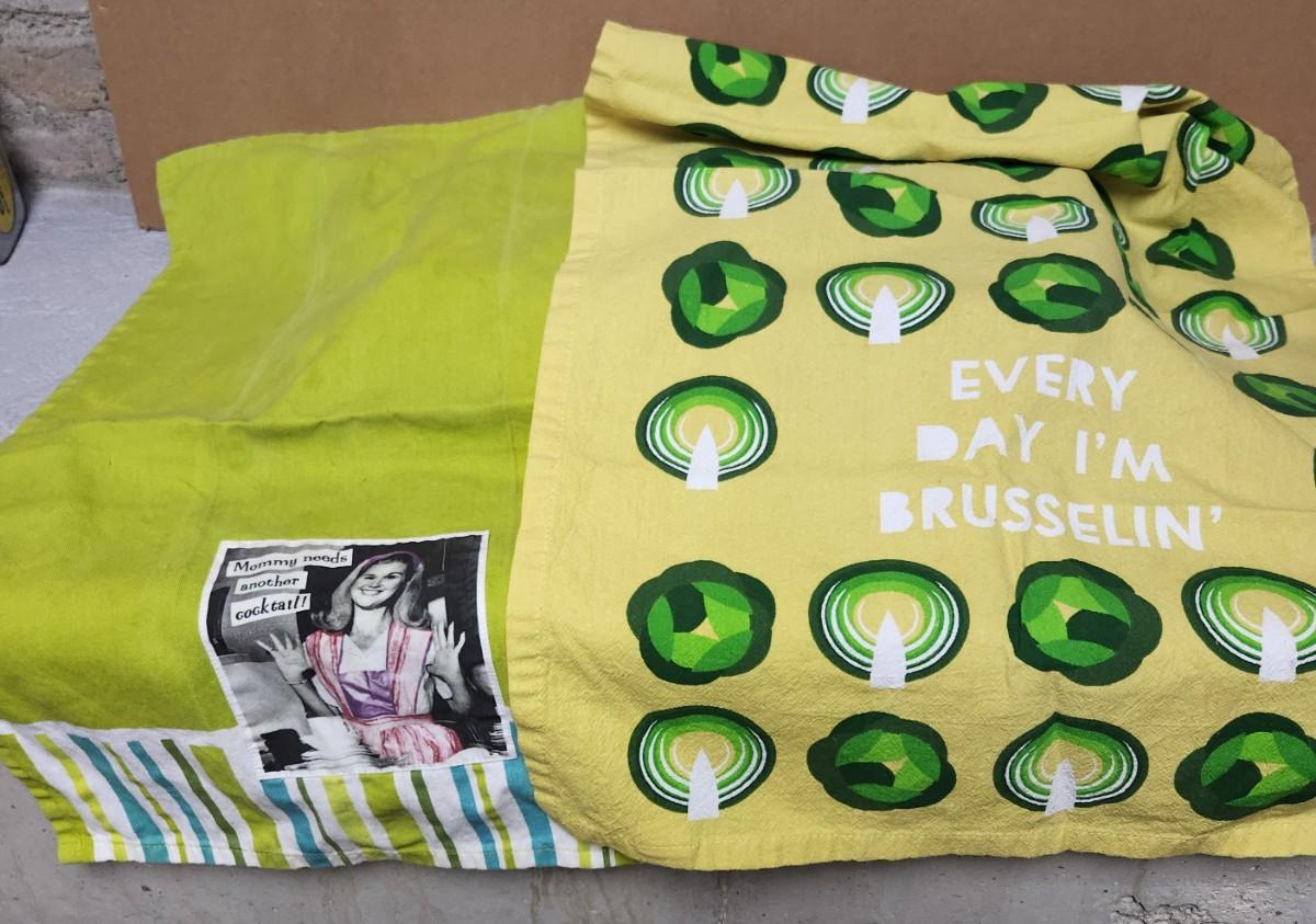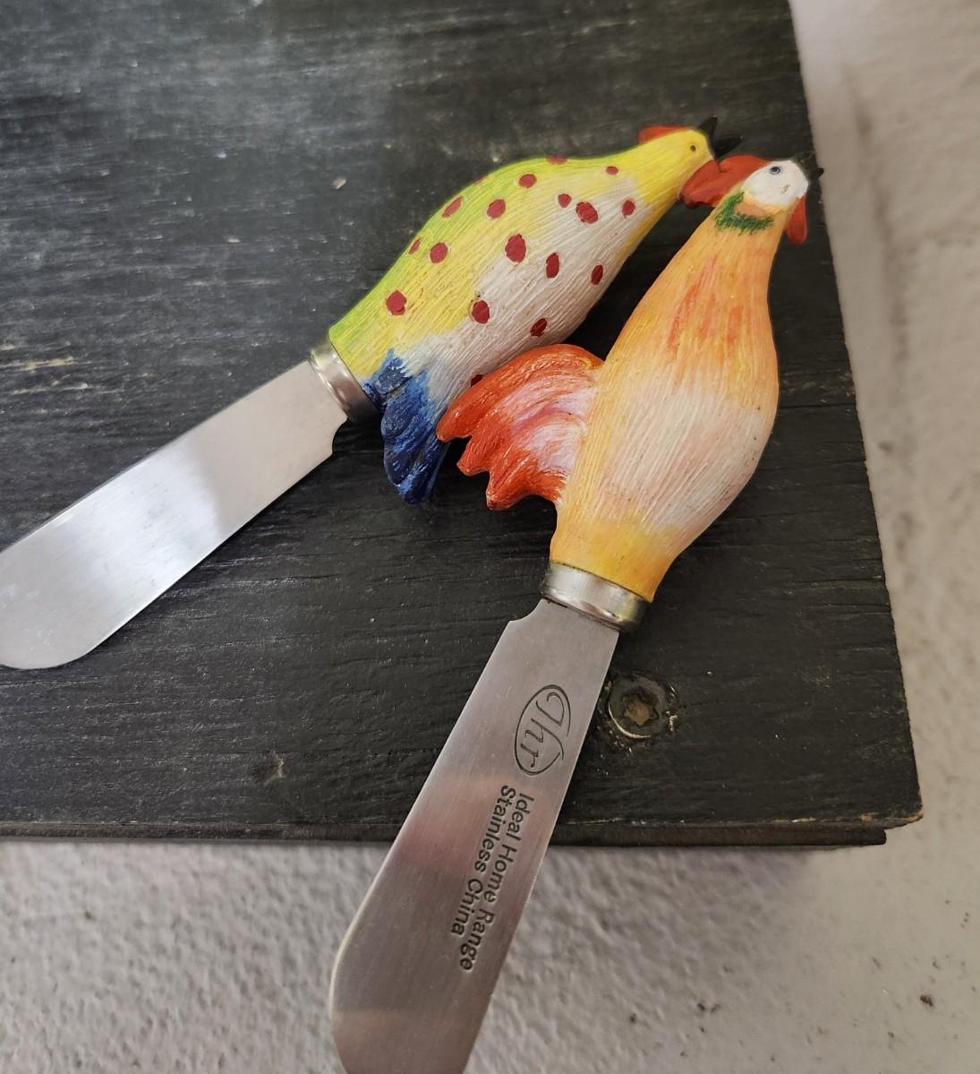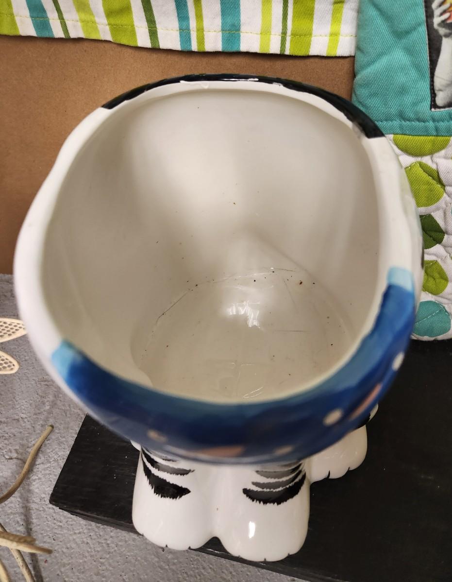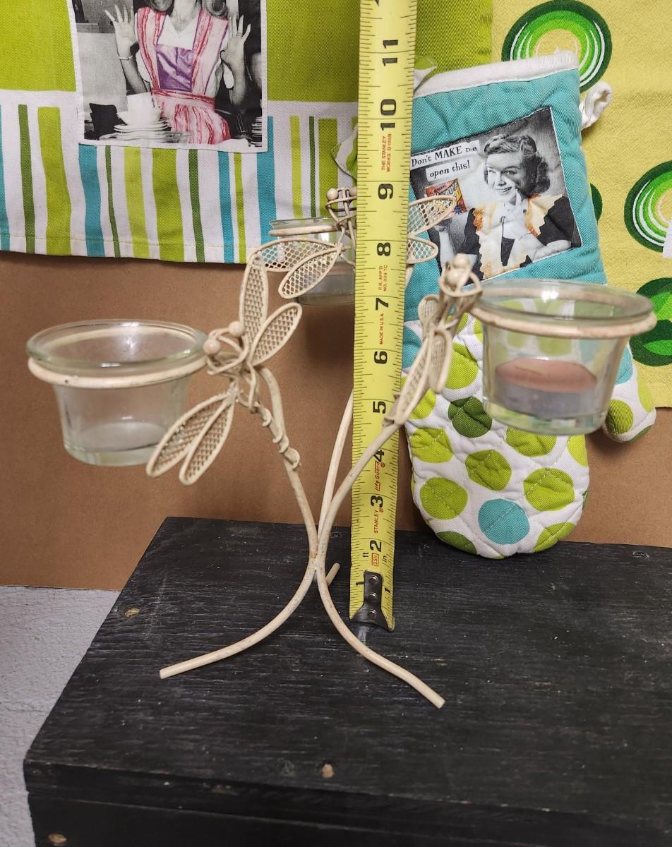Cat cookie jar, a couple tea towels, hot pad, dragonfly votive holder, a pair of chicken spreaders, a cat artist model in box and a great pear shaped bird house.