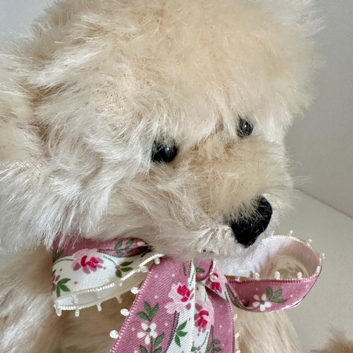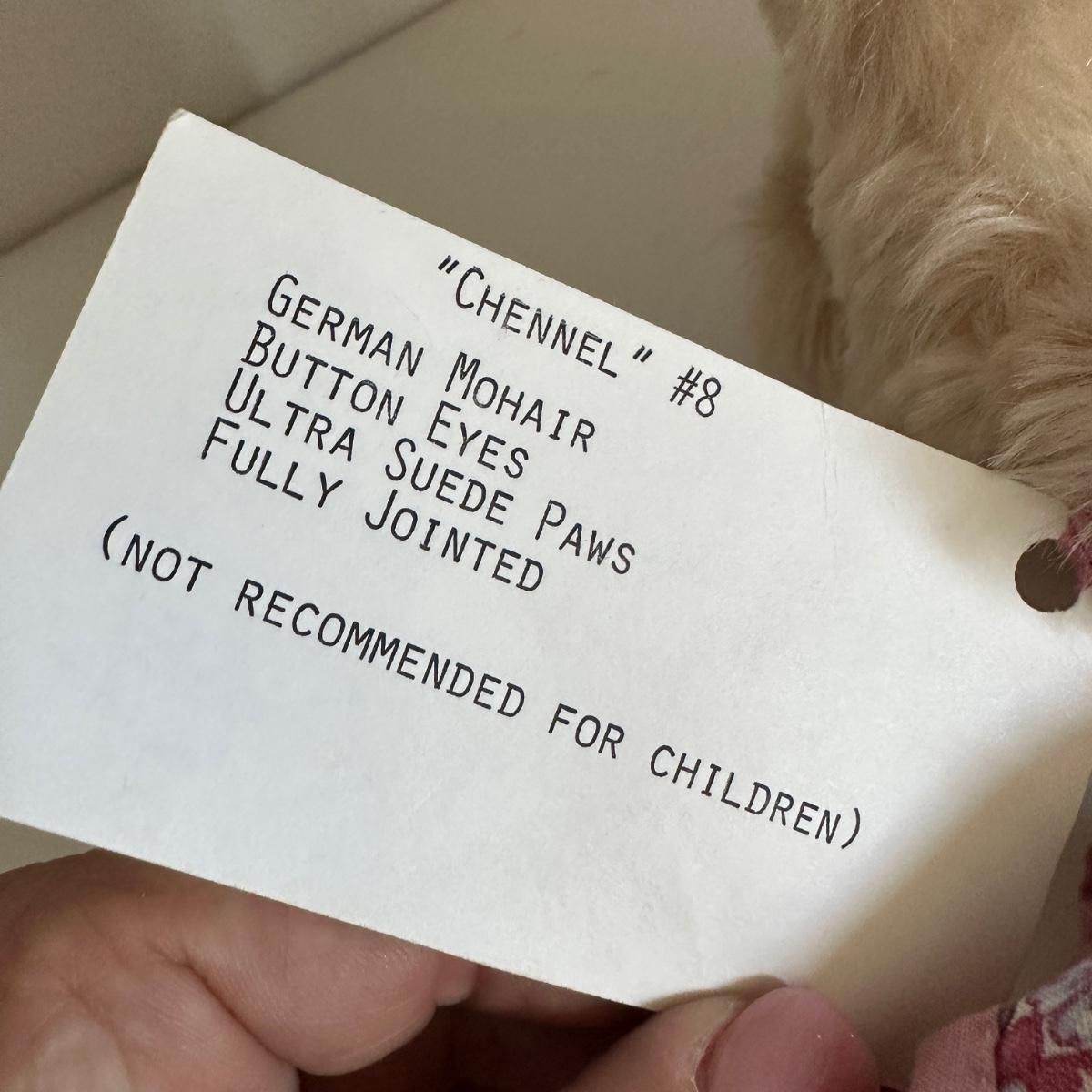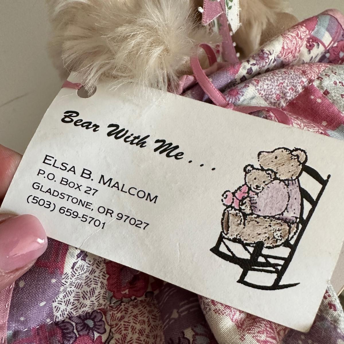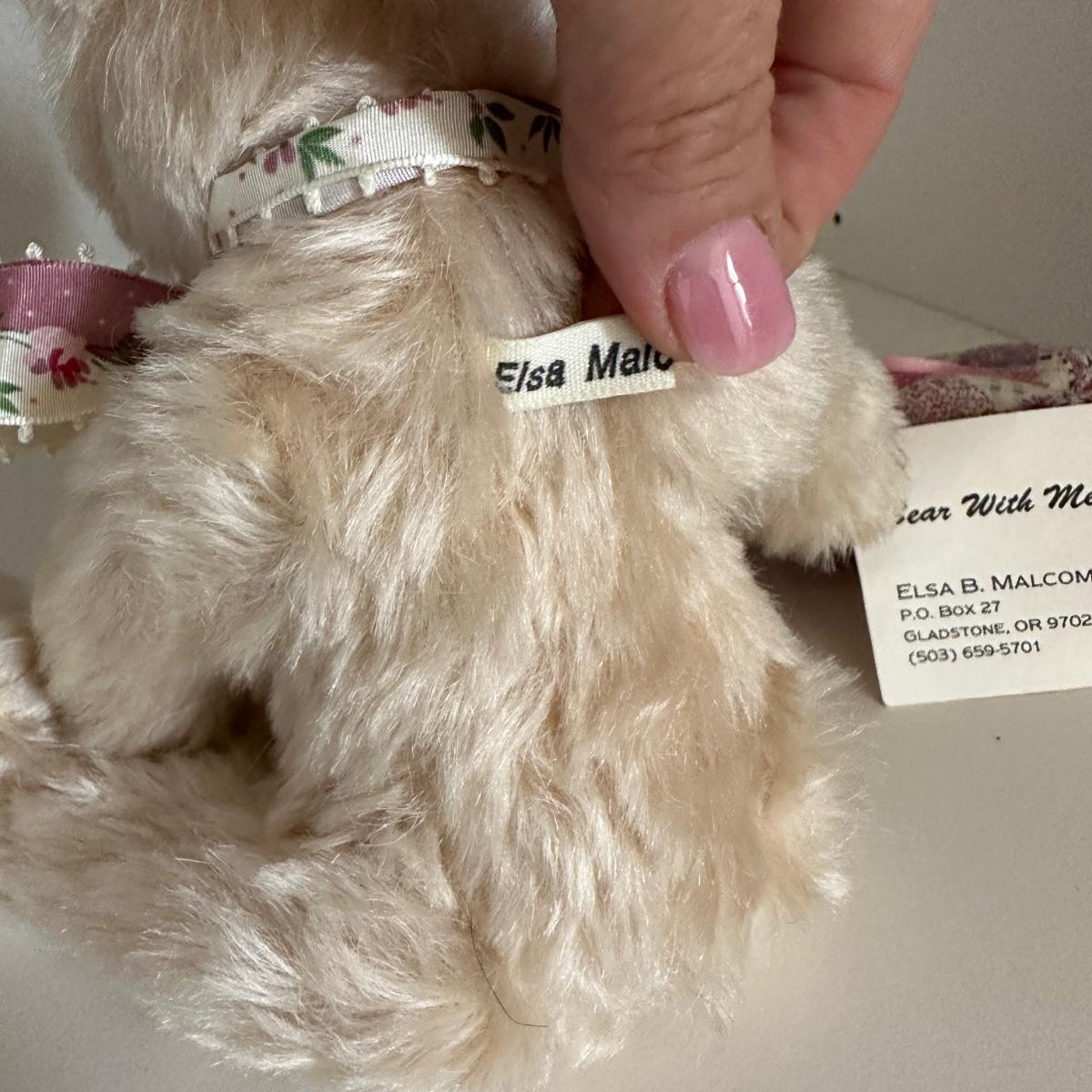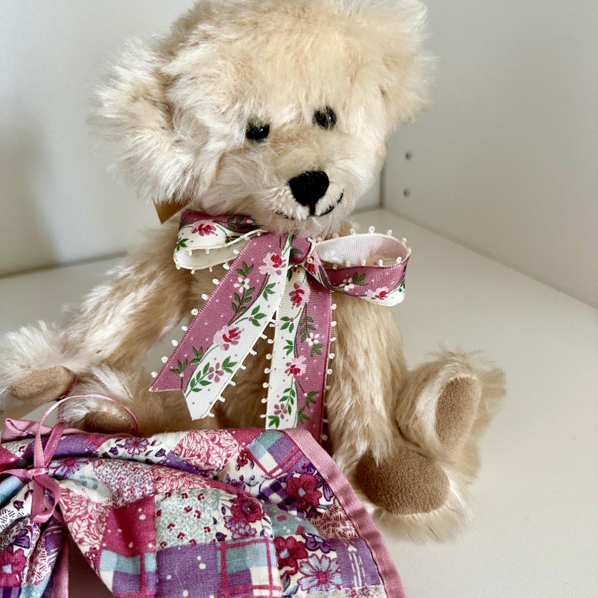 Chennel #8 by Bear with Me Designer Elsa Malcom. German Mohair, Button Eyes, Ultra Suede Paws. Fully Jointed Carries a blanket 7 inches