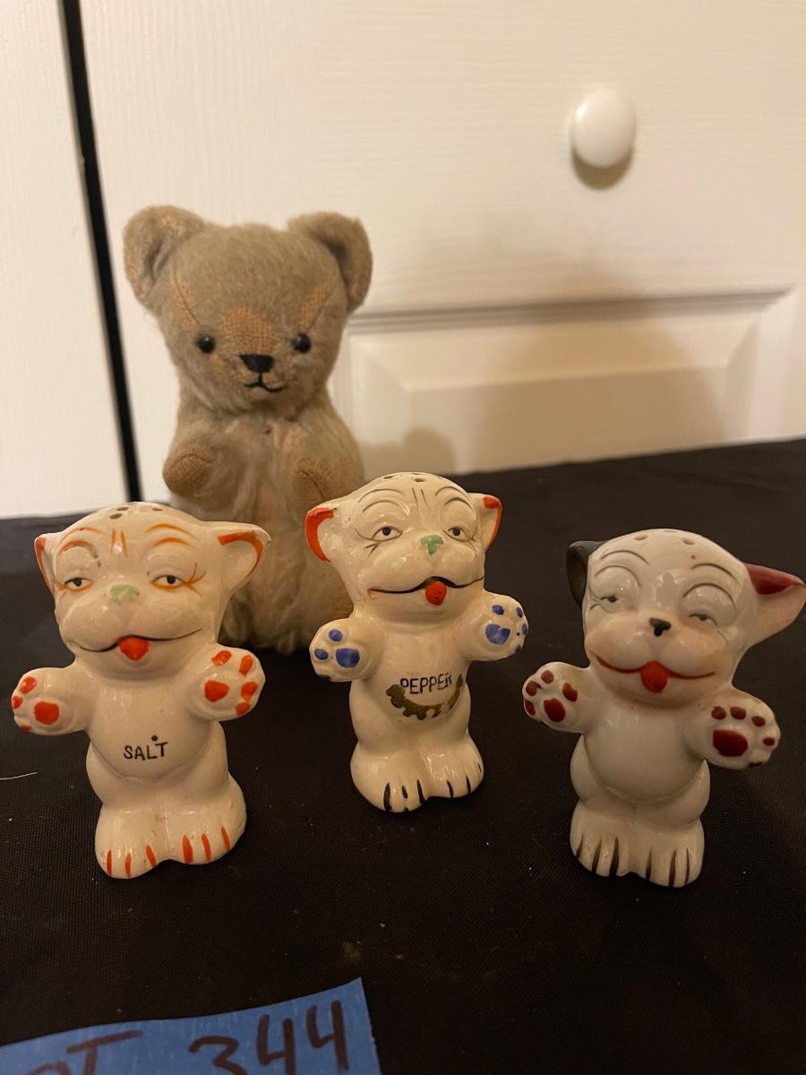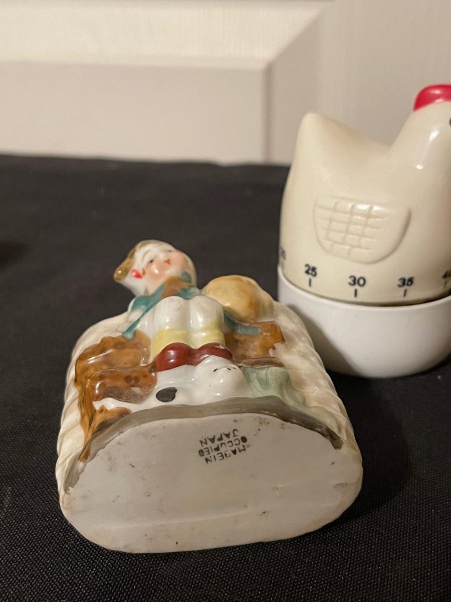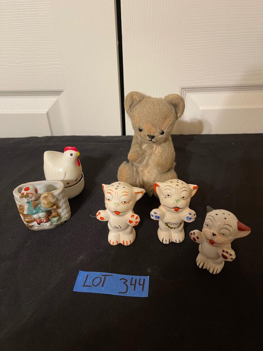 Antique Made in England Teddy Bear; chicken timer, Japanese basket/décor, pair of Japanese salt & pepper shakers, dog shaker.