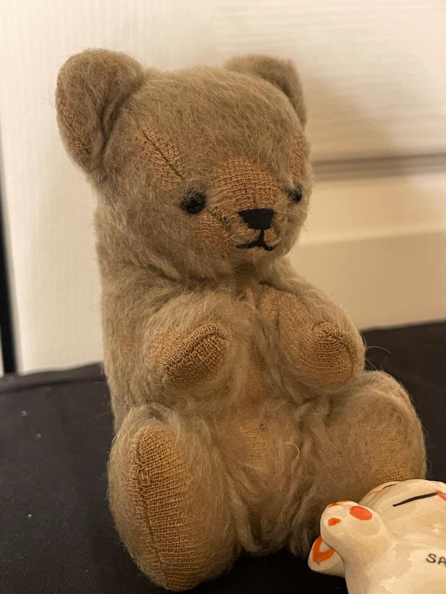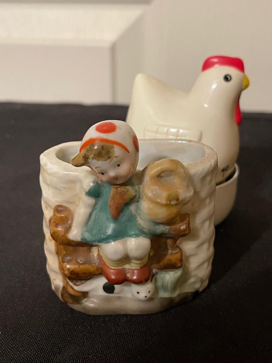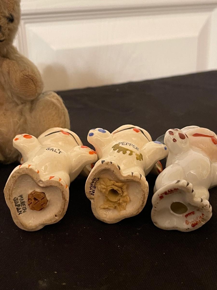 Antique Made in England Teddy Bear; chicken timer, Japanese basket/décor, pair of Japanese salt & pepper shakers, dog shaker.