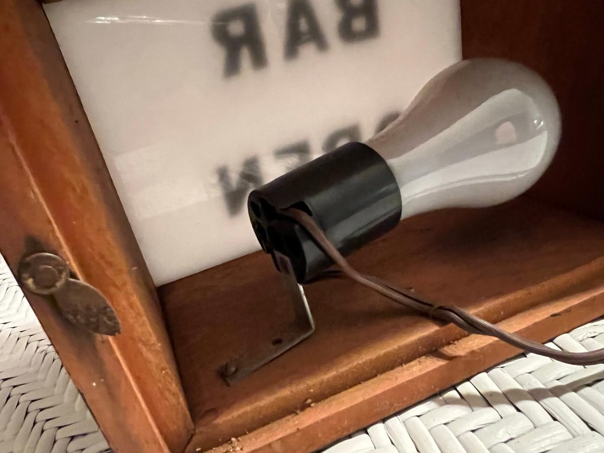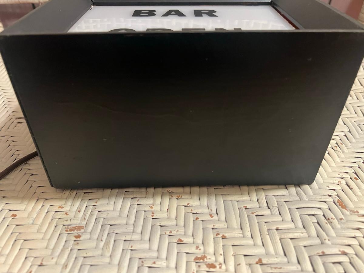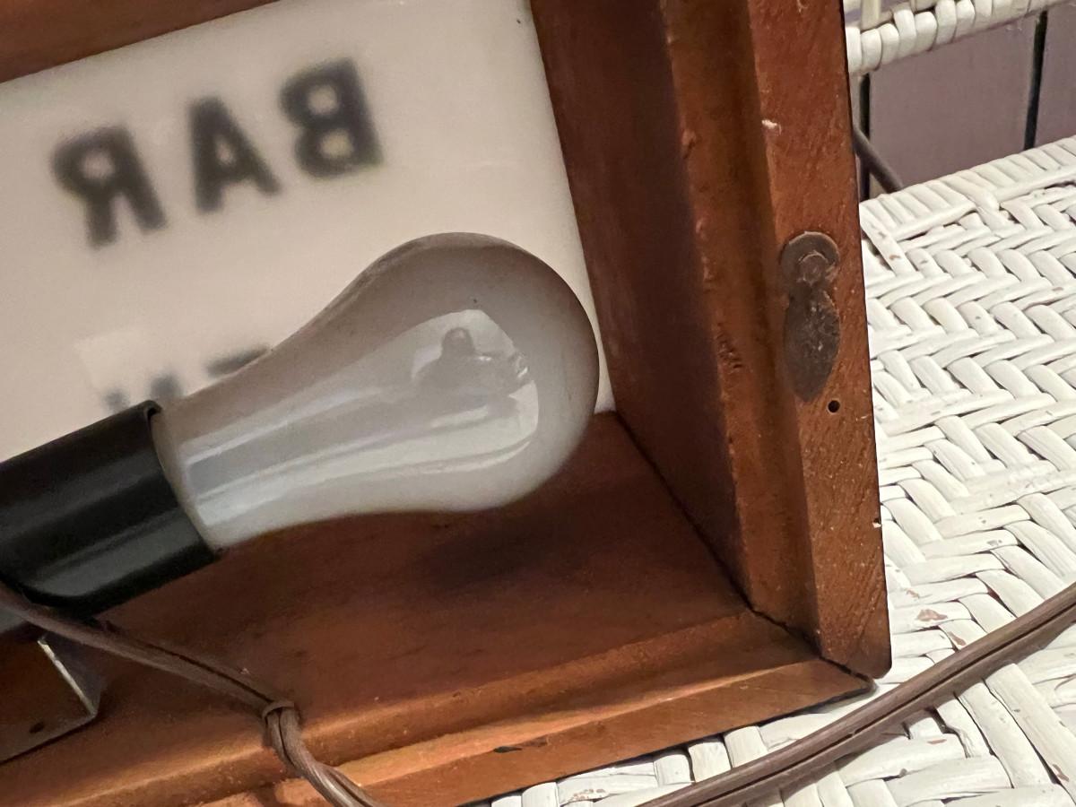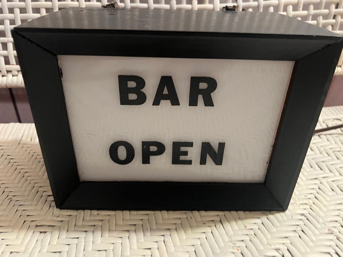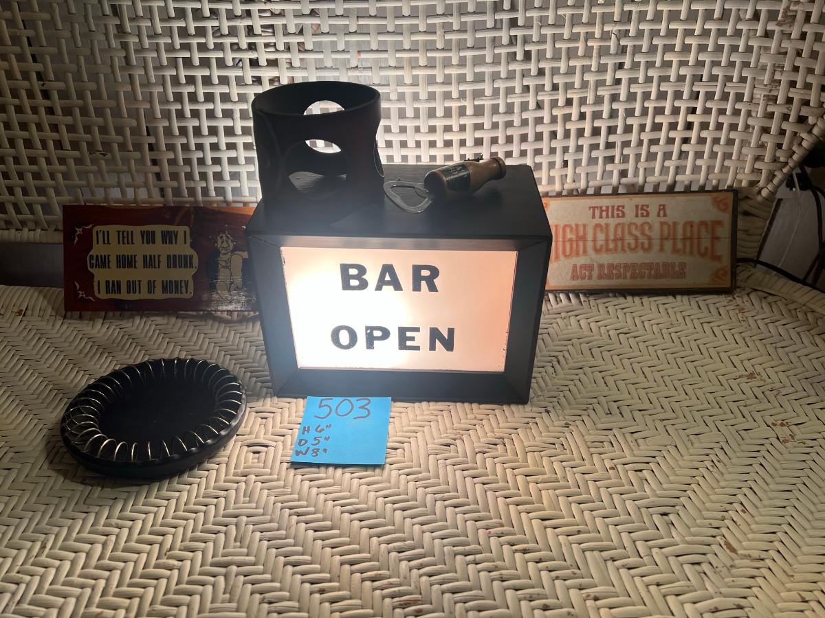 "Bar Open" light up sign (missing back), 2 wooden signs "This is a High Class Place Act Approprately" and "I'll tell you why I came home half drunk. I ran out of money", 7.5" x 3.5" and 7.5" x 4", mid century ashtray (5" diameter), and leather bottle holder (3.5" diameter), bottle opener (4.5")