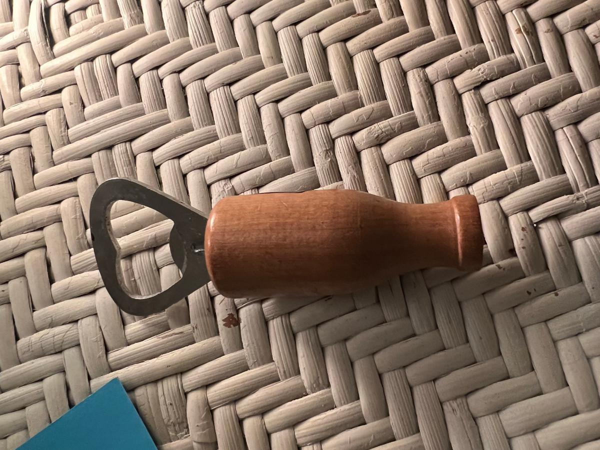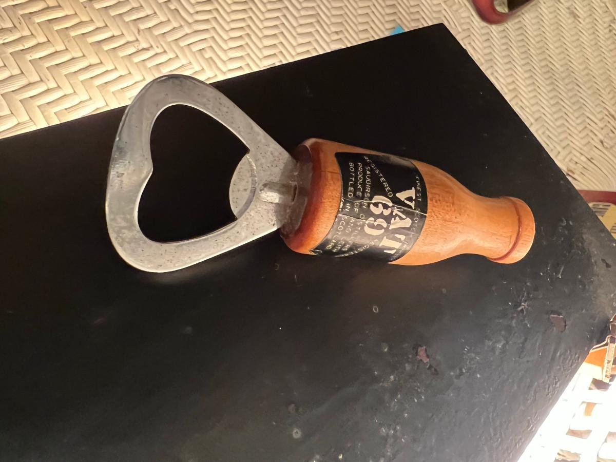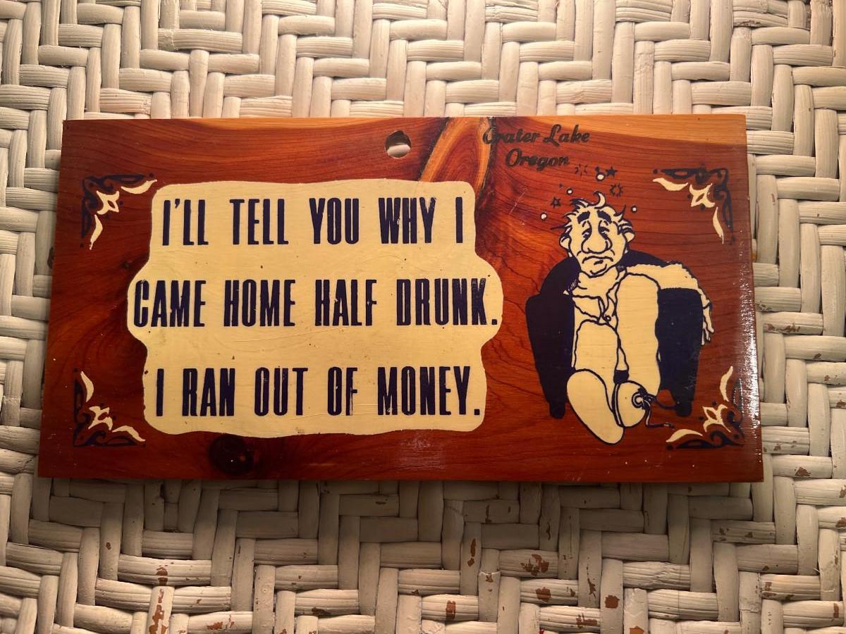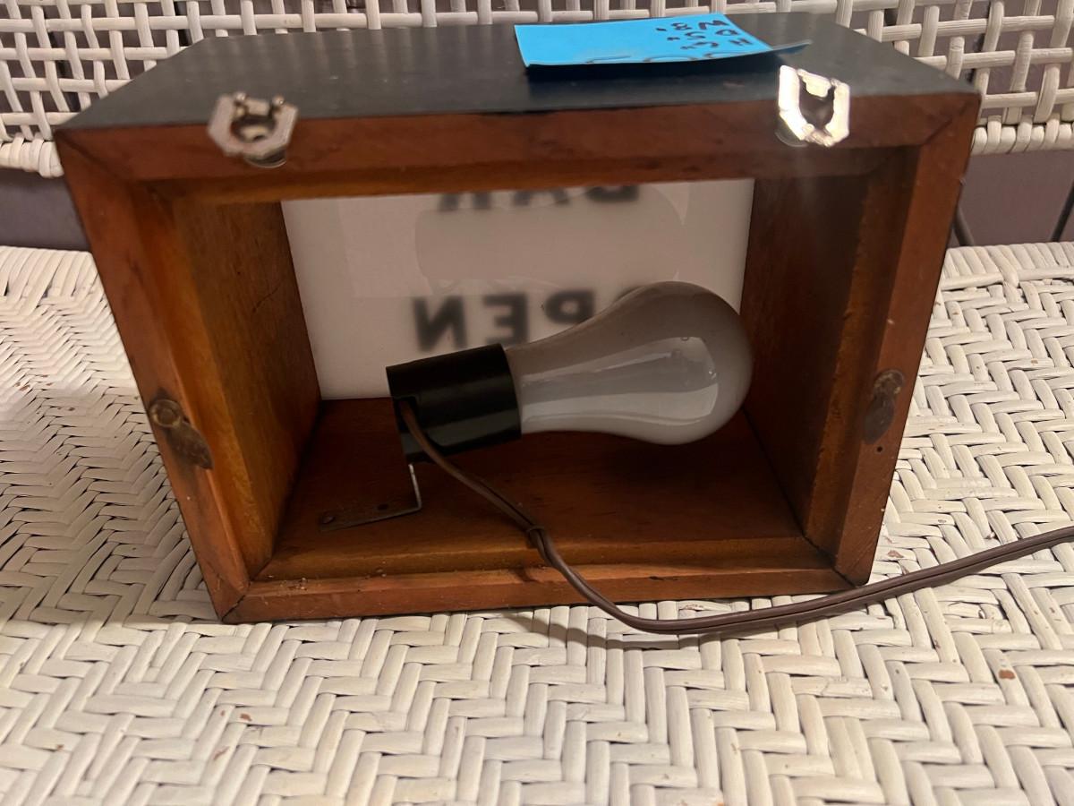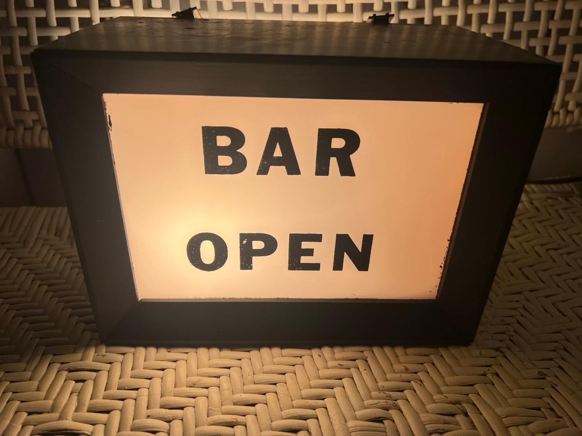 "Bar Open" light up sign (missing back), 2 wooden signs "This is a High Class Place Act Approprately" and "I'll tell you why I came home half drunk. I ran out of money", 7.5" x 3.5" and 7.5" x 4", mid century ashtray (5" diameter), and leather bottle holder (3.5" diameter), bottle opener (4.5")