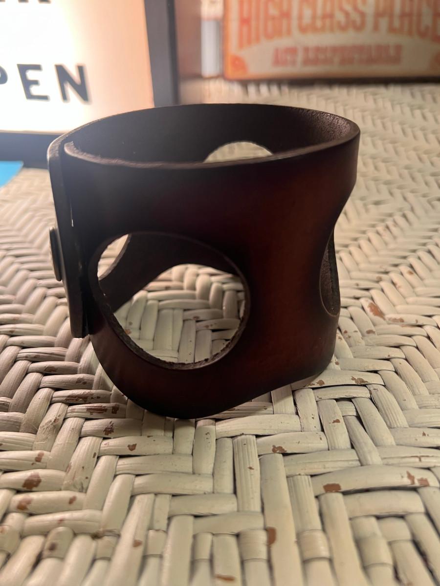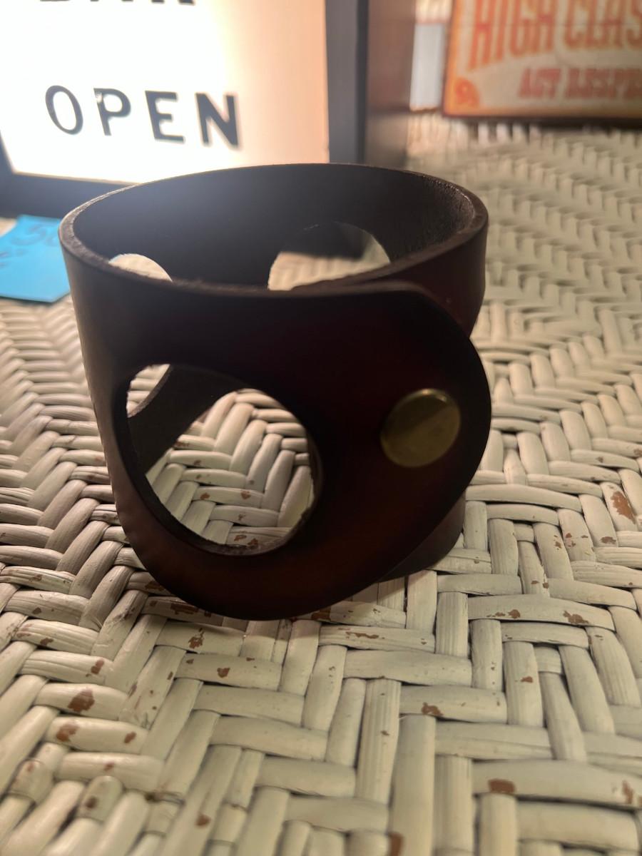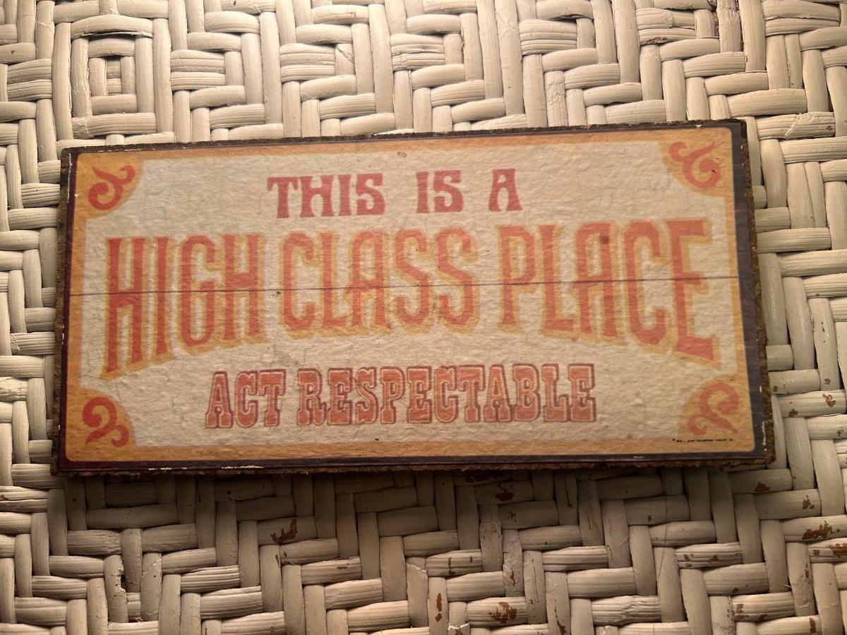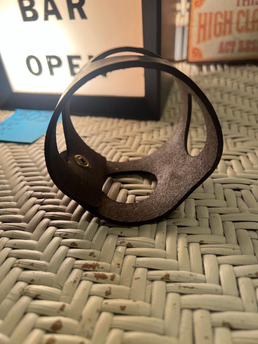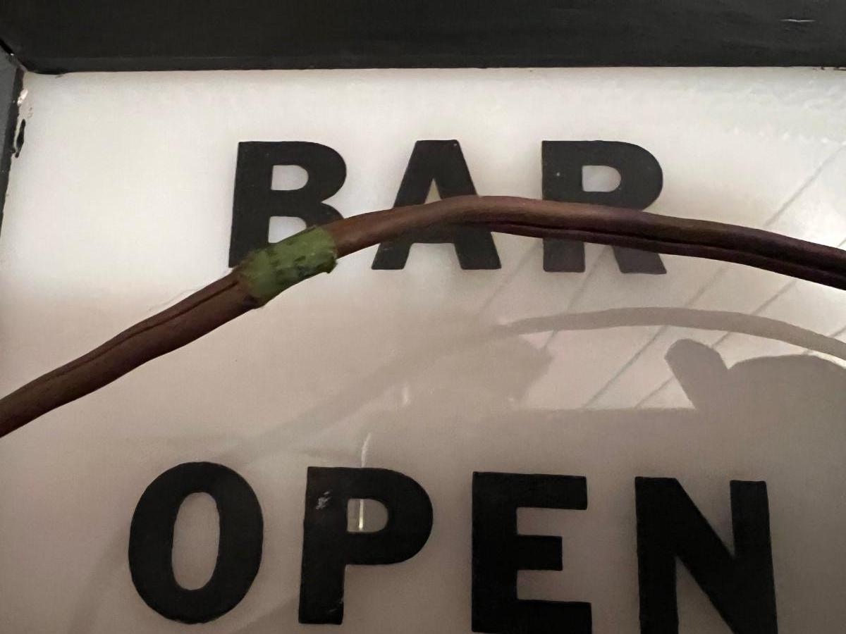 "Bar Open" light up sign (missing back), 2 wooden signs "This is a High Class Place Act Approprately" and "I'll tell you why I came home half drunk. I ran out of money", 7.5" x 3.5" and 7.5" x 4", mid century ashtray (5" diameter), and leather bottle holder (3.5" diameter), bottle opener (4.5")