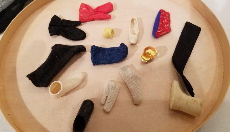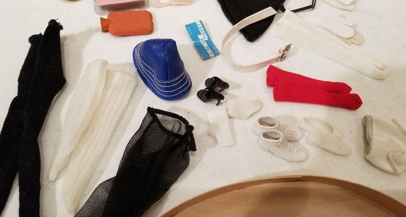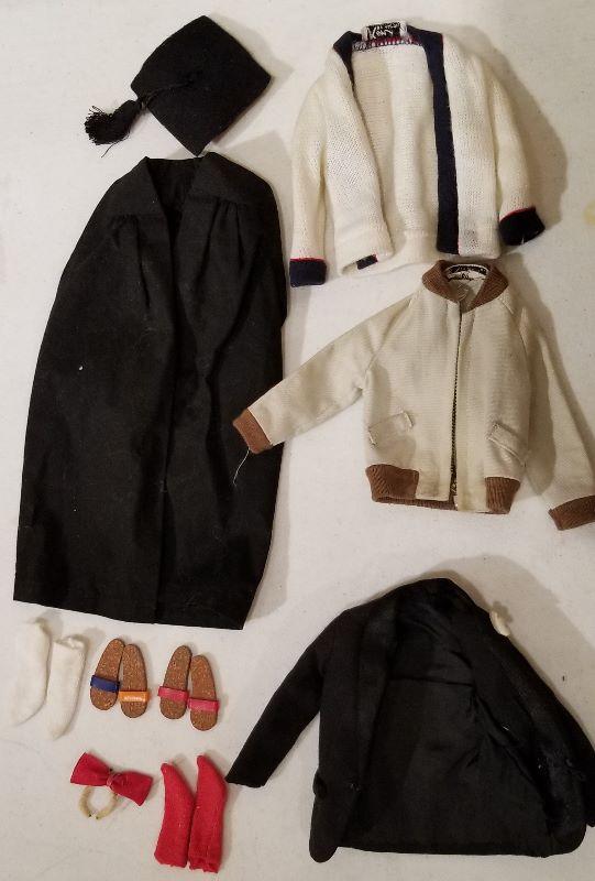 Graduation Cap & Gown, sweater, jacket, tux jacket, bow tie, socks, flip flops. Misc. lot of Barbie accessories. Loved and played with condition.