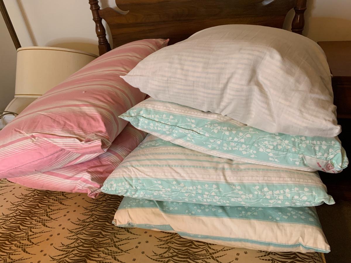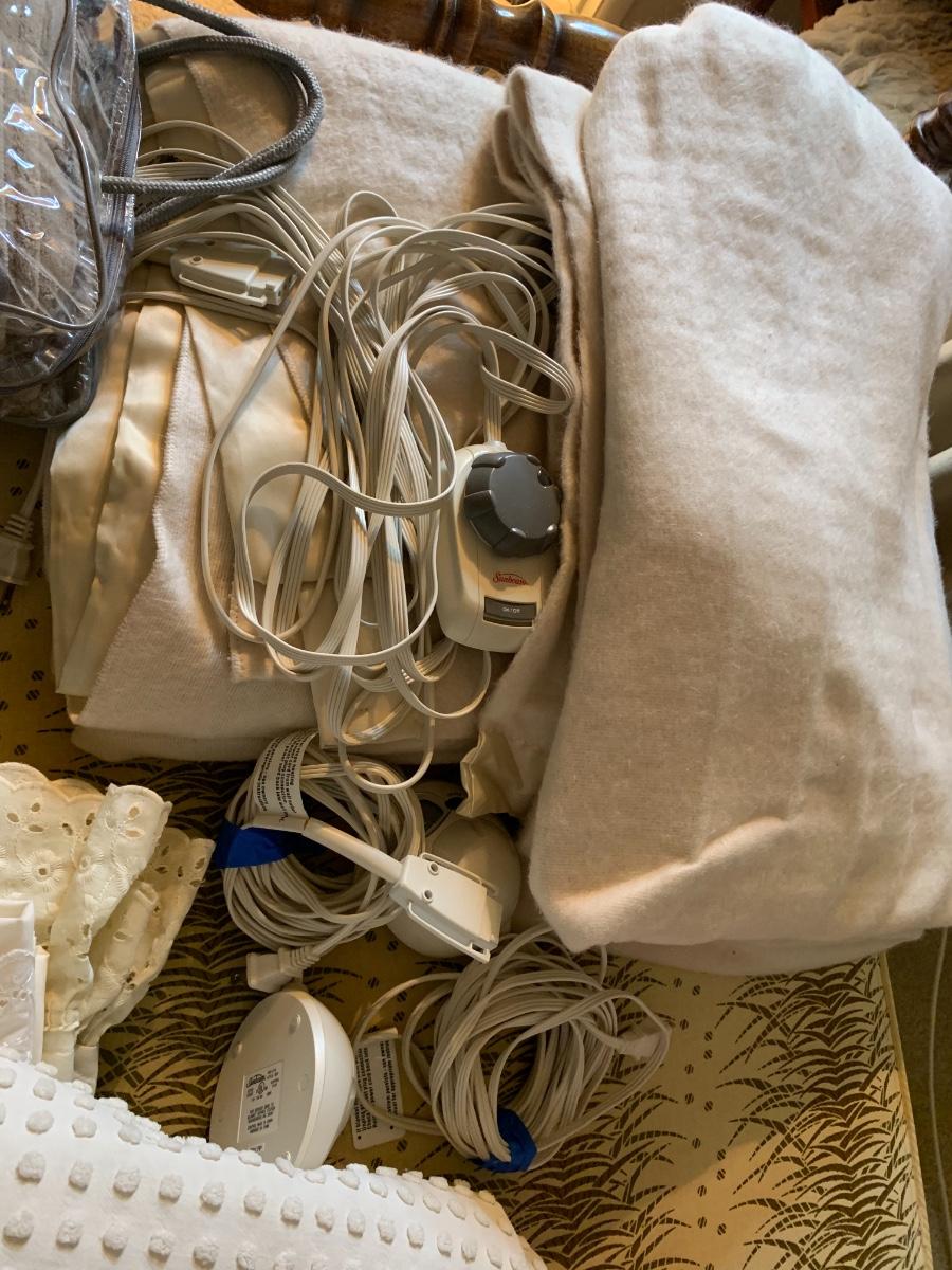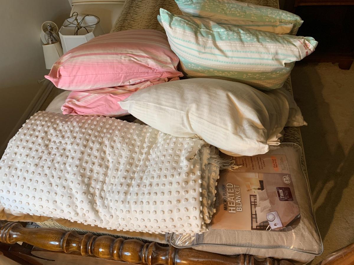 Lot includes heated blankets, 6 bed pillows, coverlet.