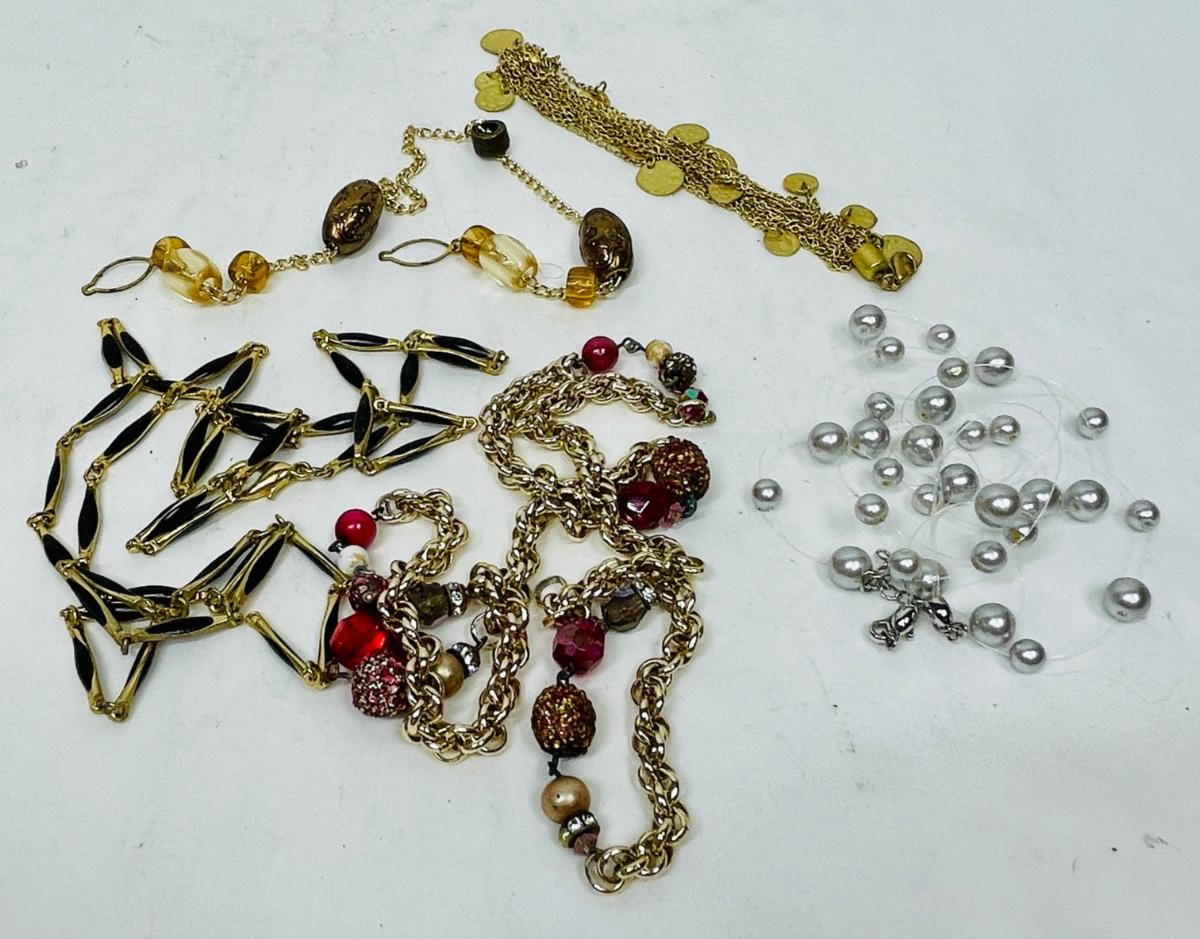 Several different types of necklaces, all have some amount of damage.