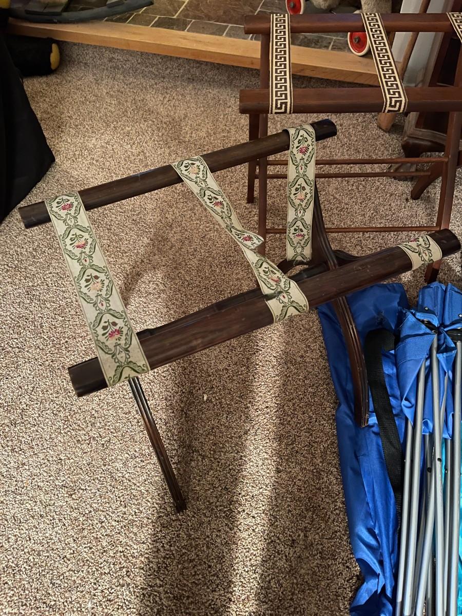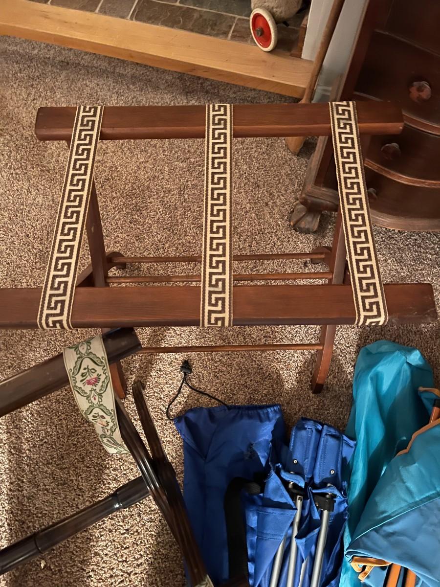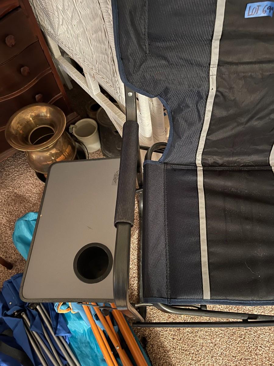 Nice folding chair with tray, (2) foldup chairs with bags, (2) luggage racks, Rio beach chair.