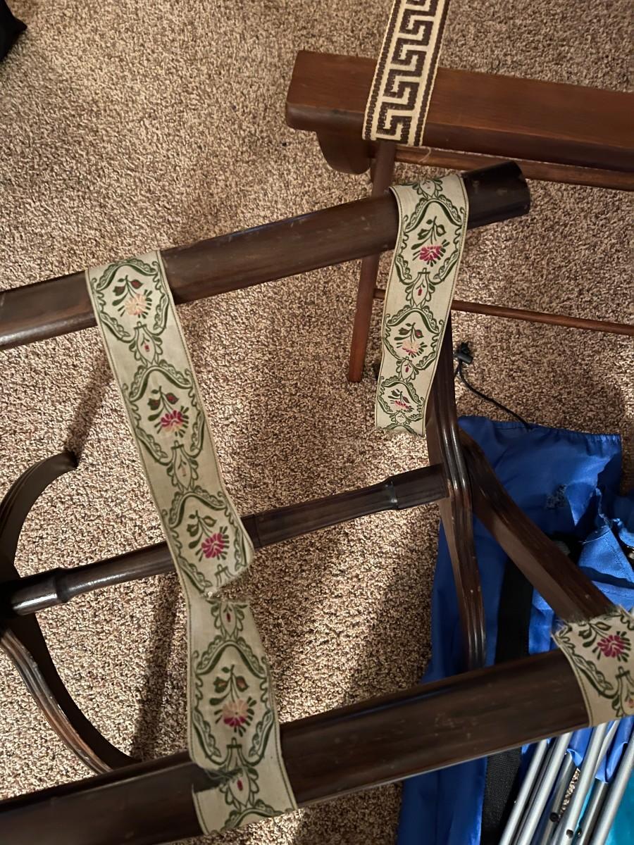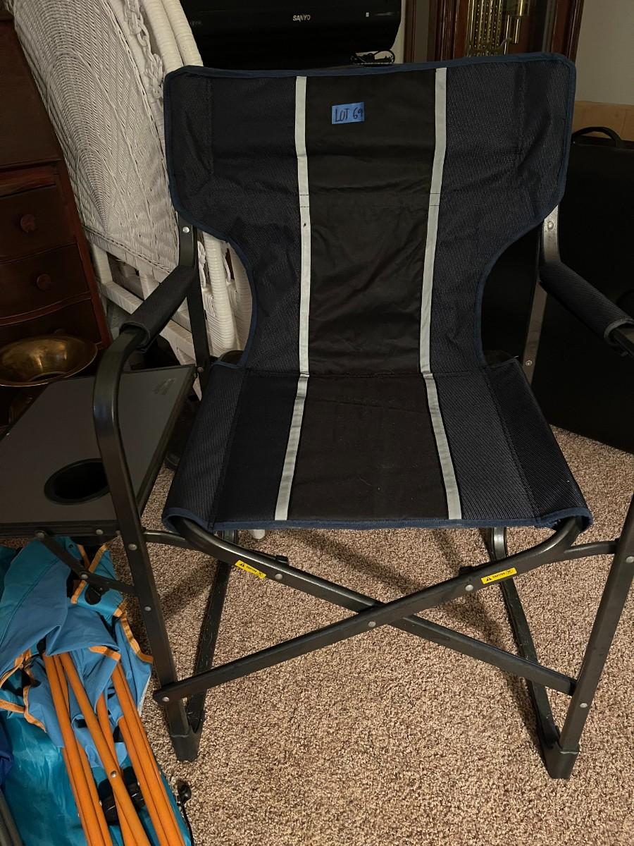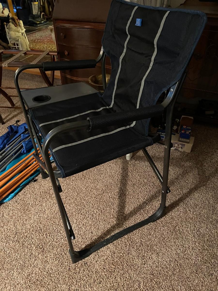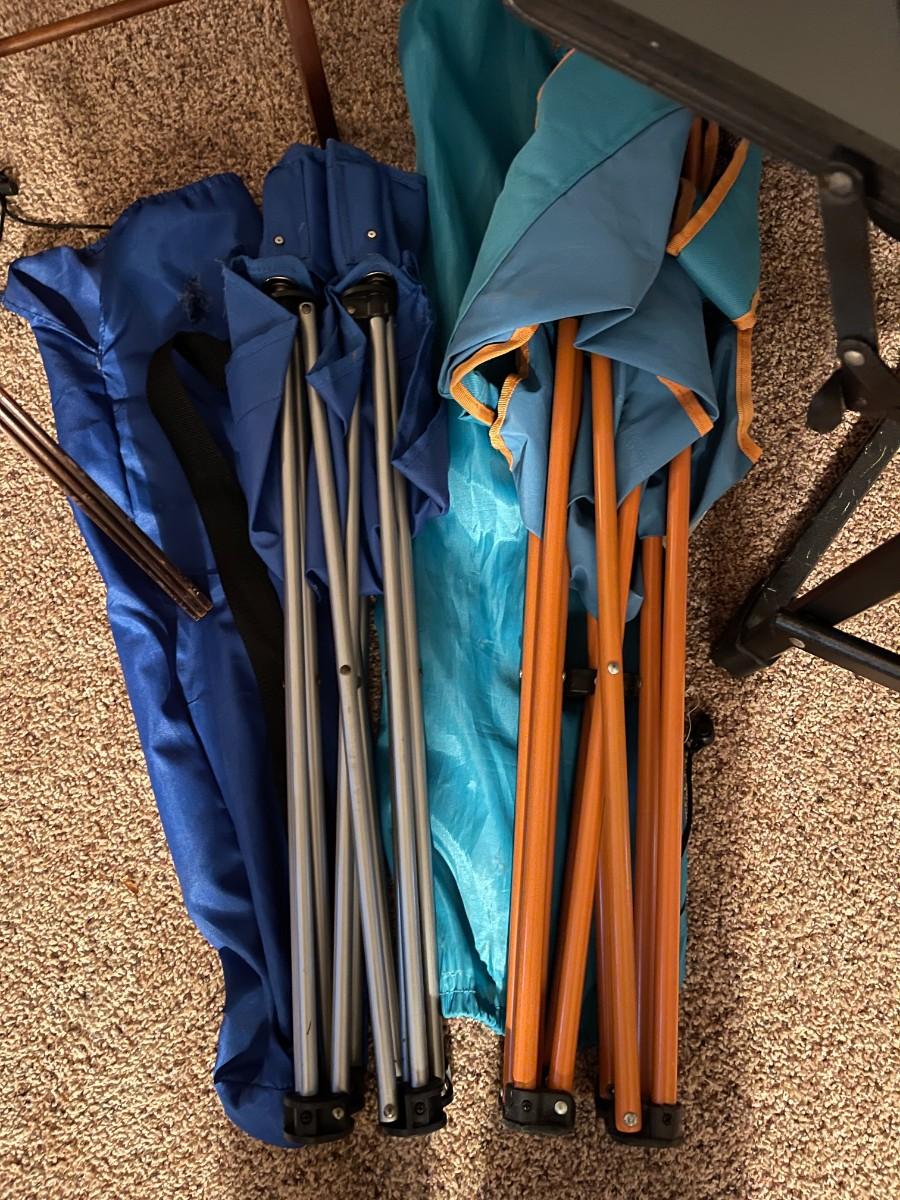 Nice folding chair with tray, (2) foldup chairs with bags, (2) luggage racks, Rio beach chair.