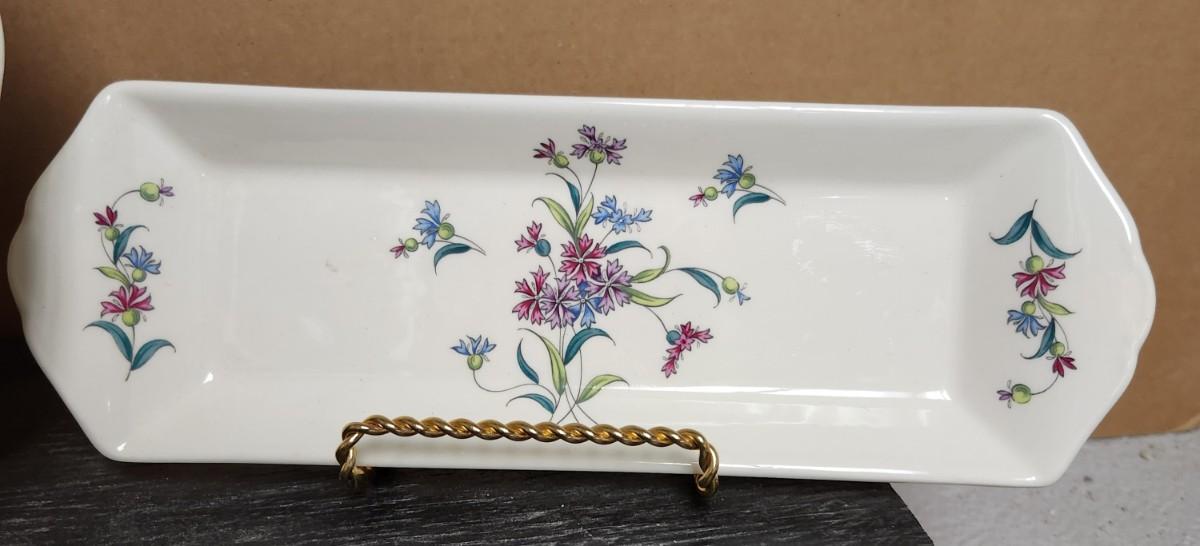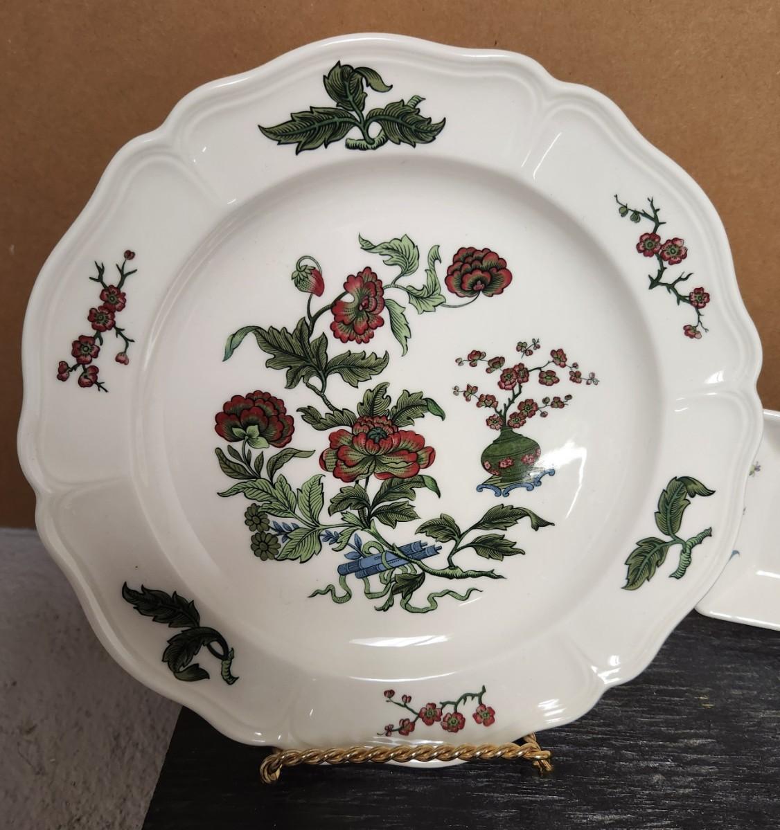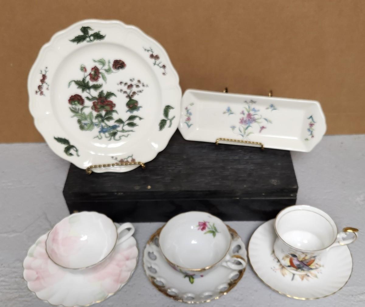 Wedgewood plate, spode cracker plate and 3 teacups with saucers.