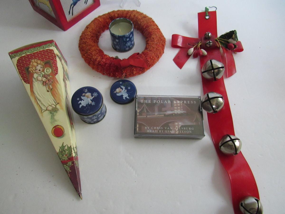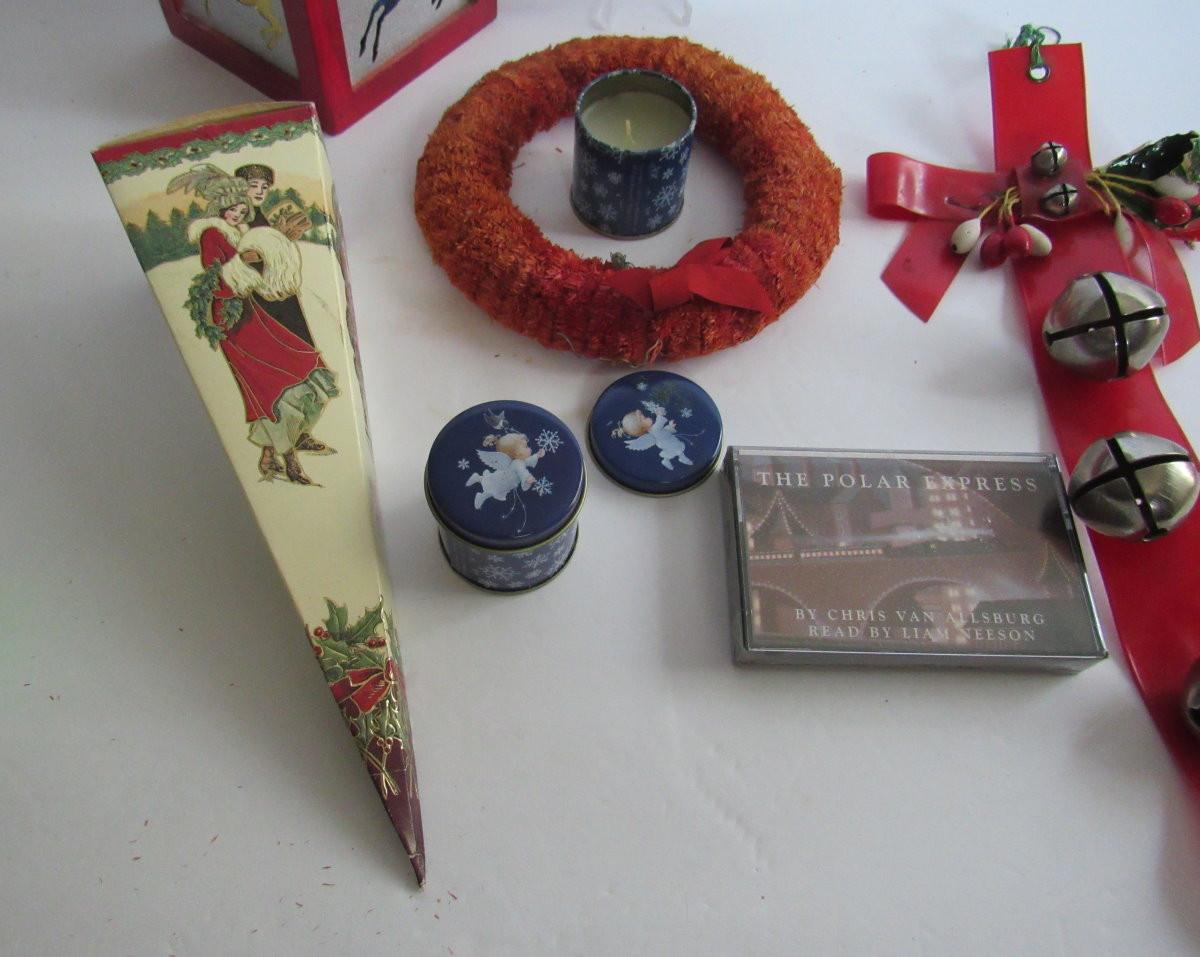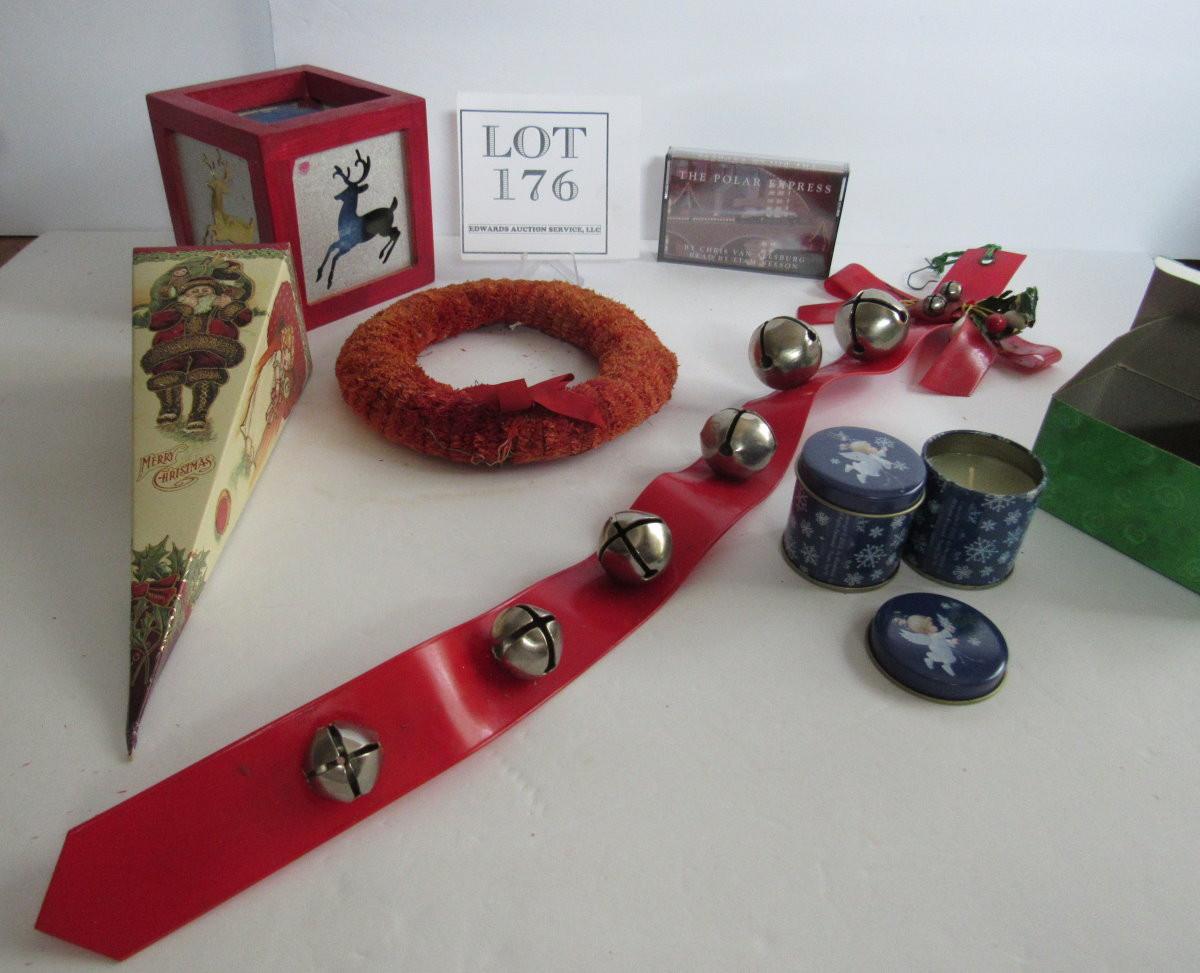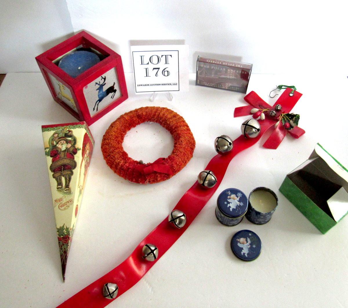 Misc Christmas Lot, Sleighbells, Wreath, Cardboard Candy Box, Candles