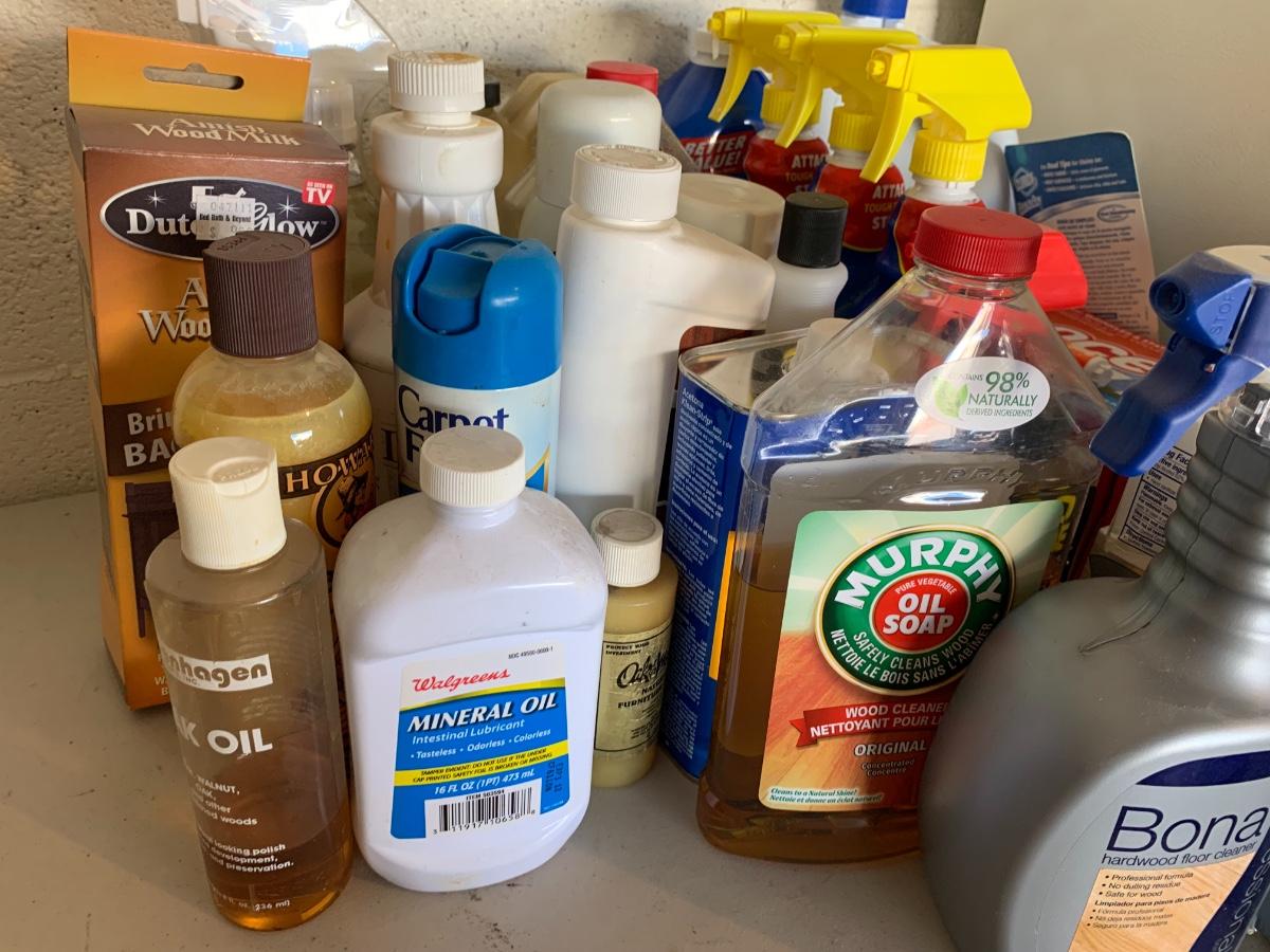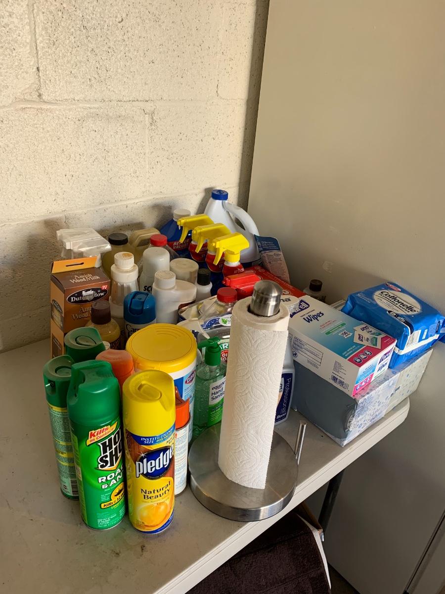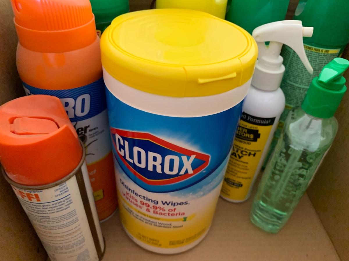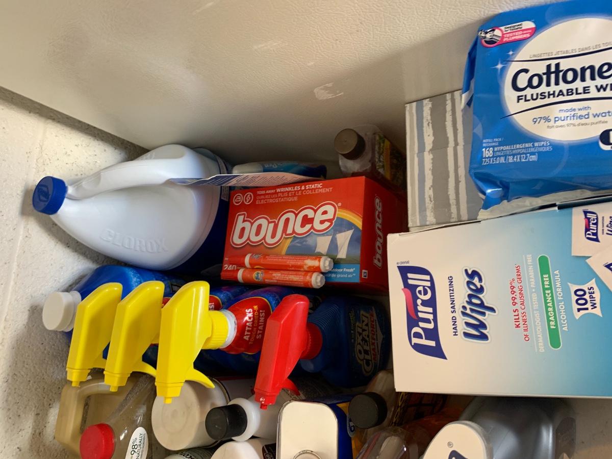 Bug Killers, Lysol, Wood Polish, Furniture Polish, Wet Wipes, Oxy Clean, Bleach, Bounce Dryer Sheets, Kleenex, Paper towel Holder, Scotchguard, Floor Cleaner.