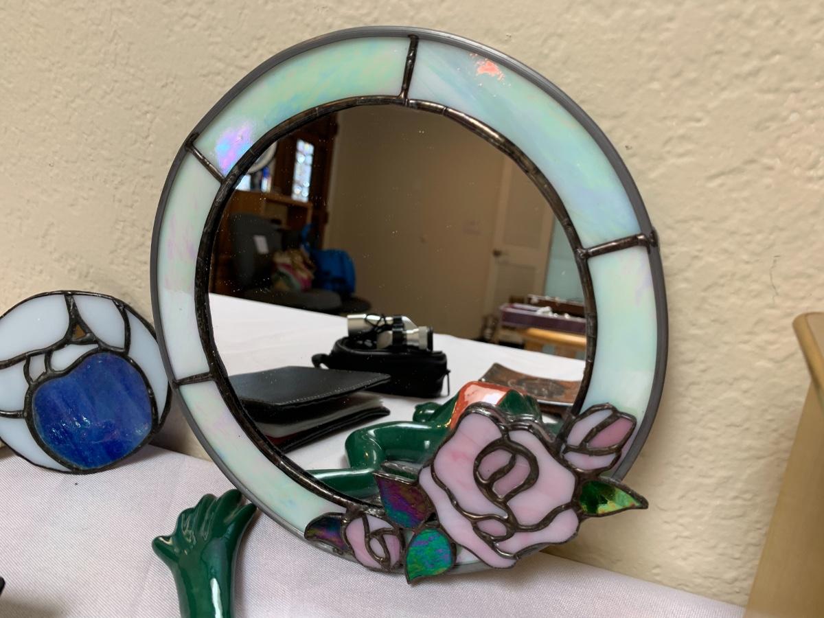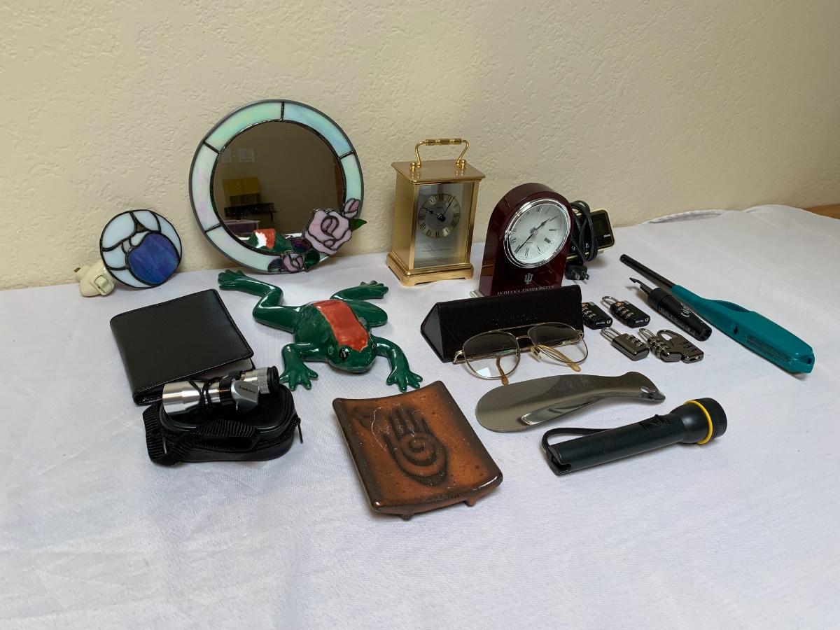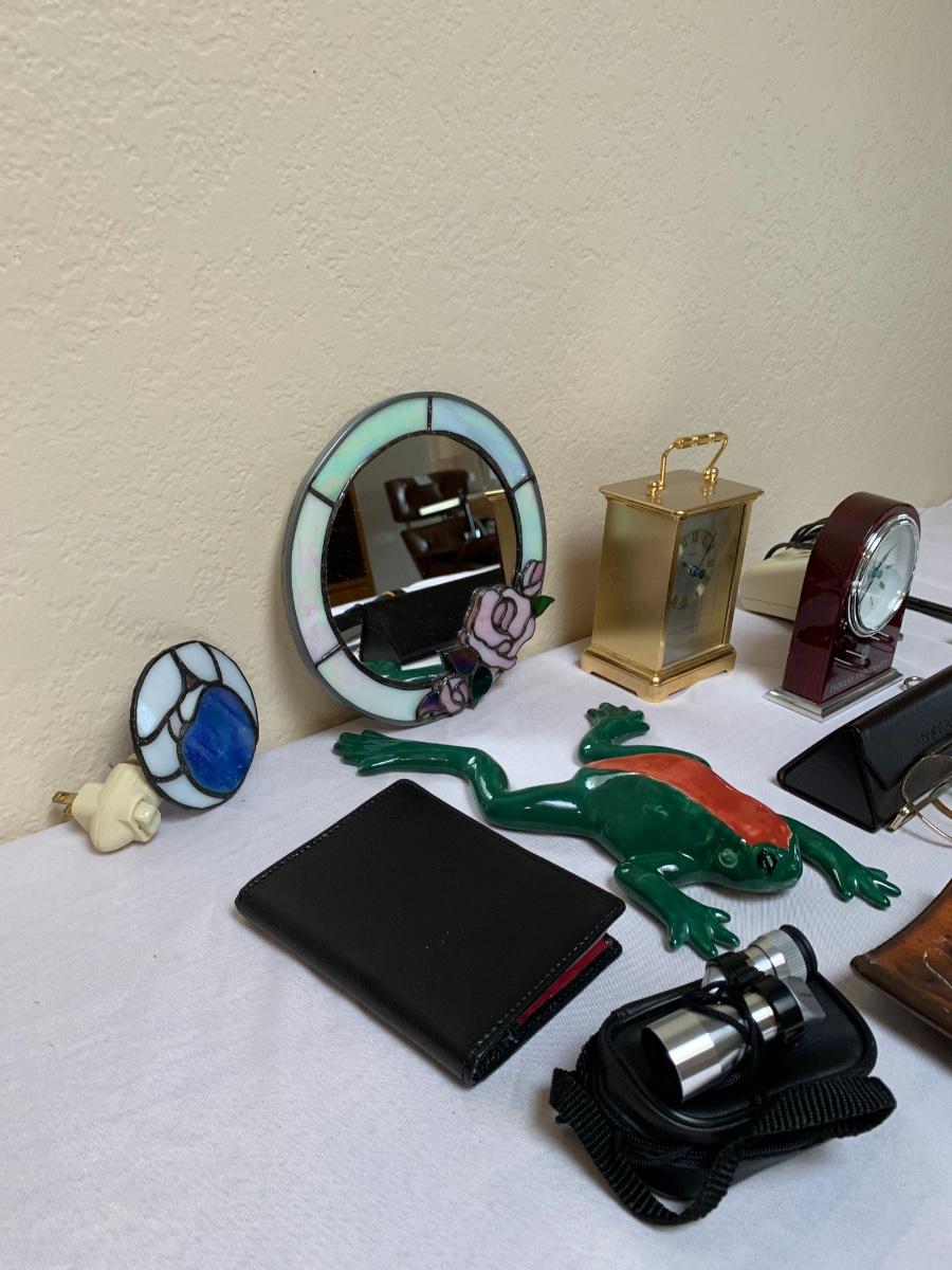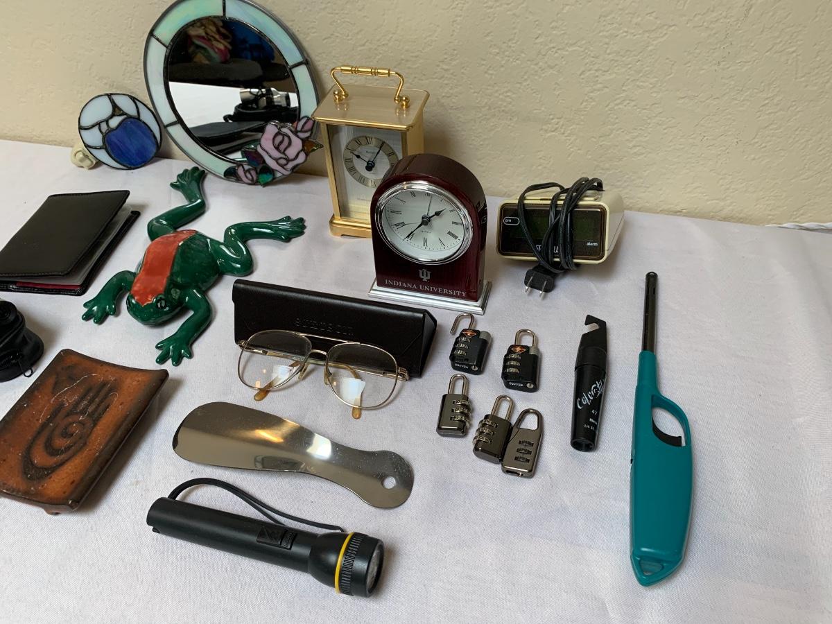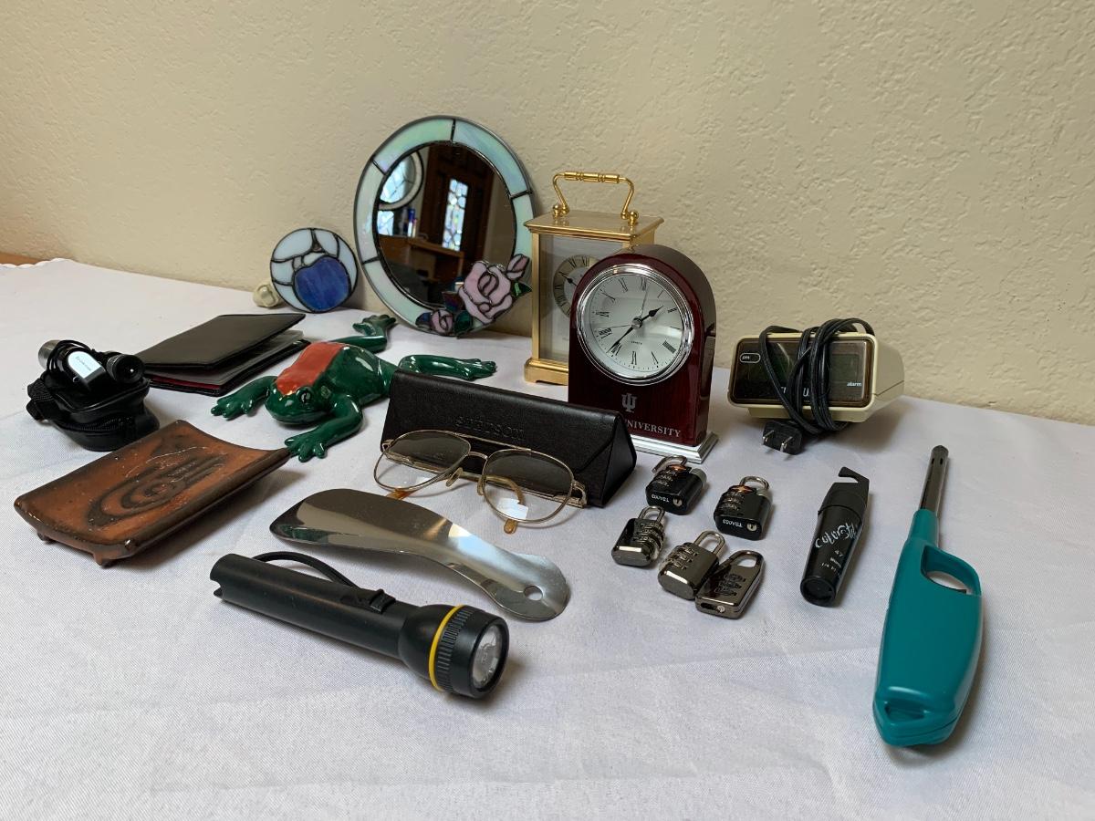 Includes a small stained glass mirror and nightlight, a few clocks, luggage locks with combinations, wallet, glasses, Brookstone brand loop, soap dish, and ceramic frog.