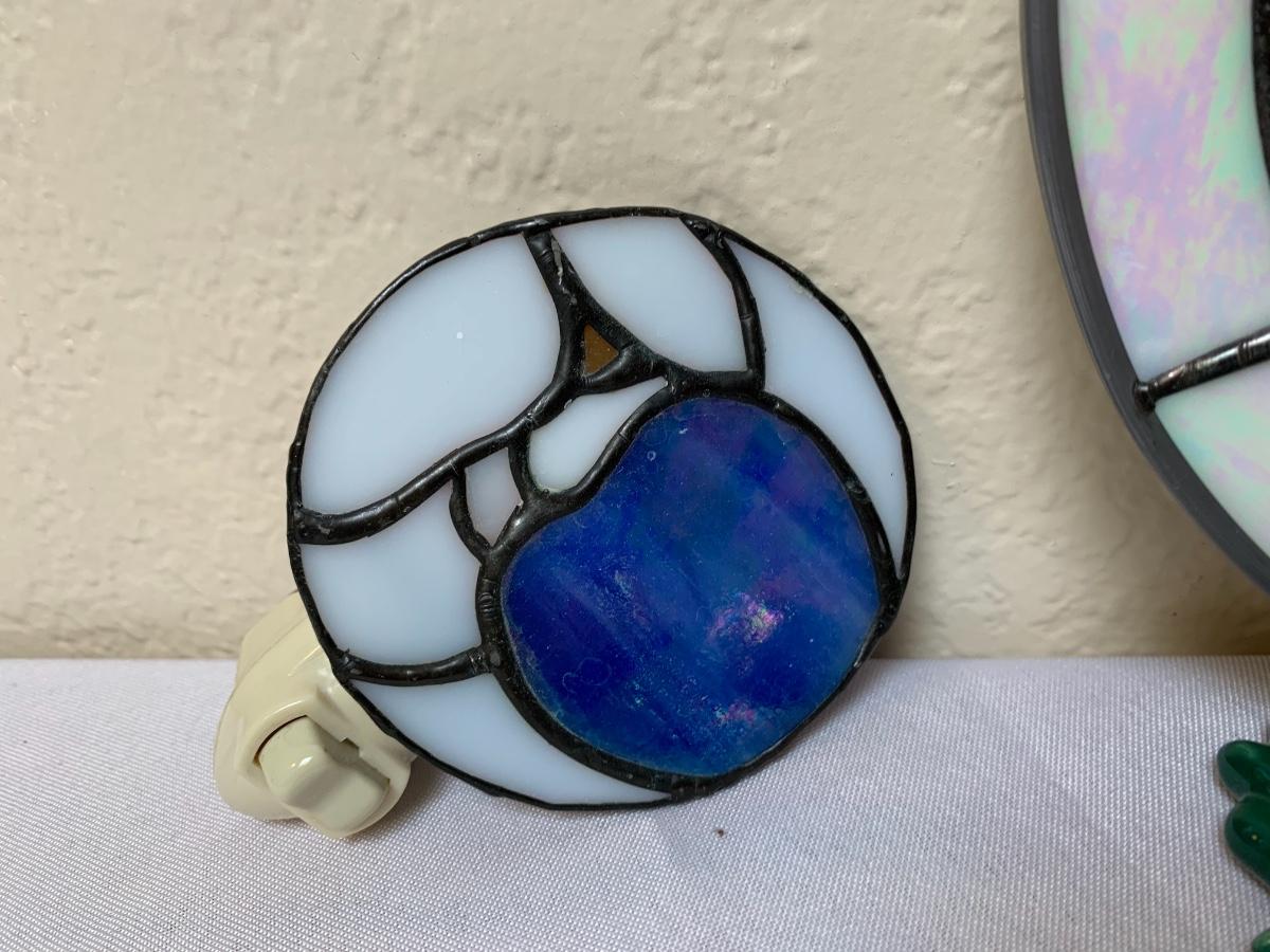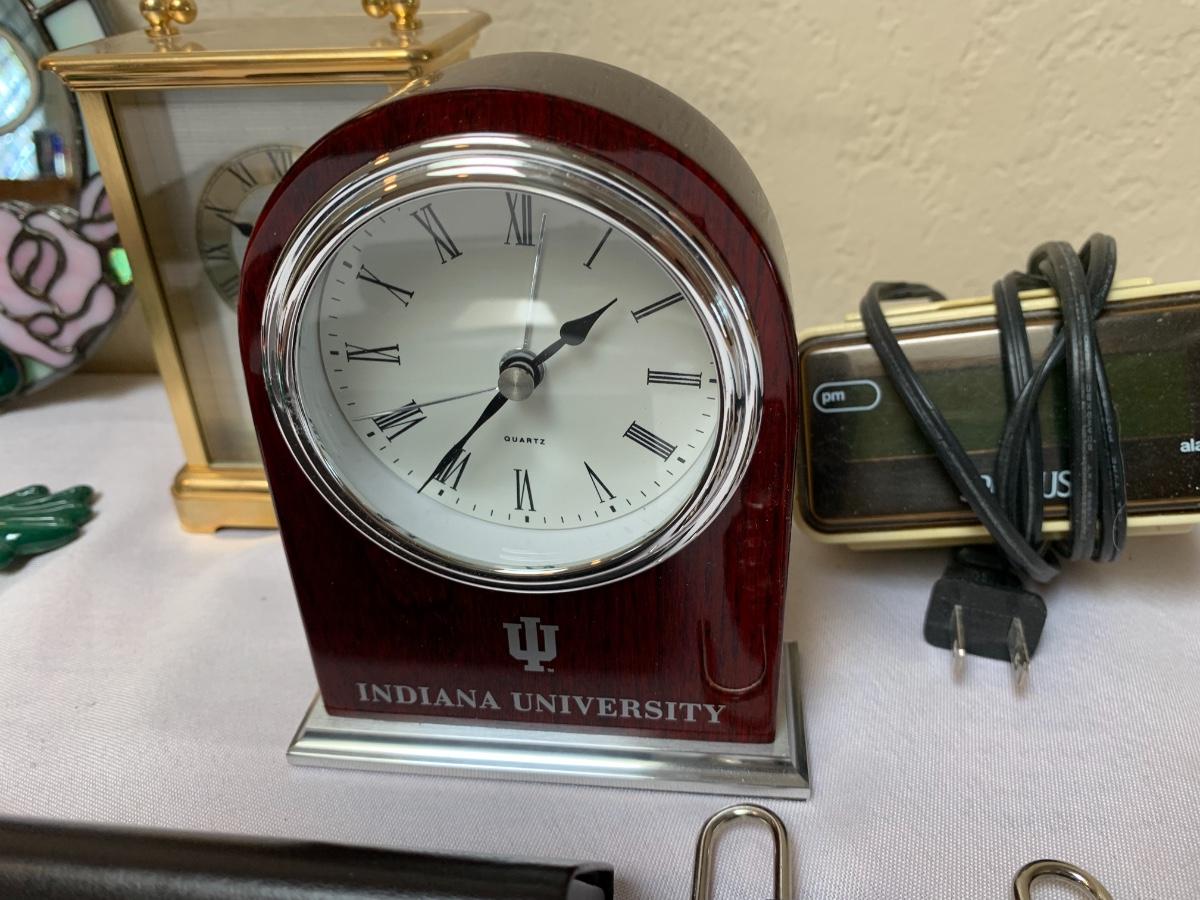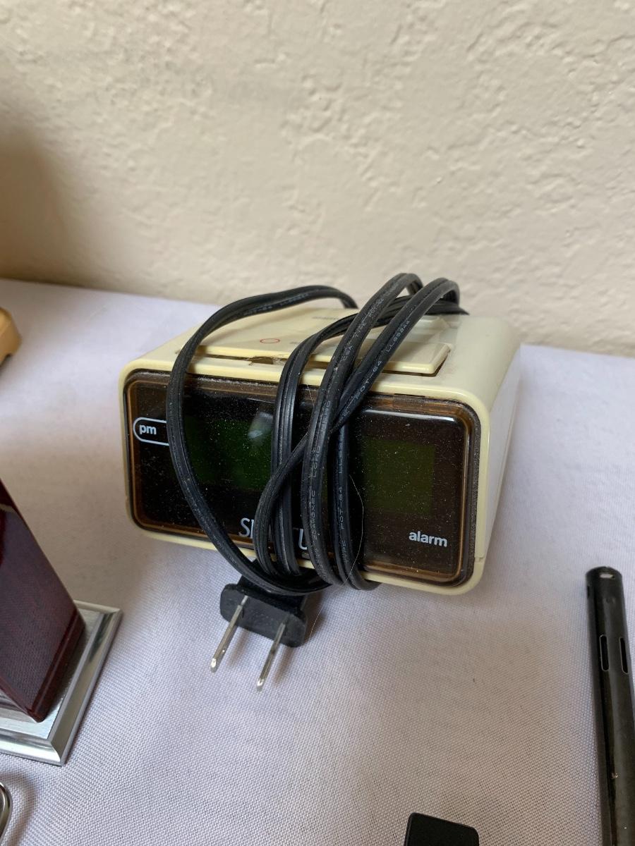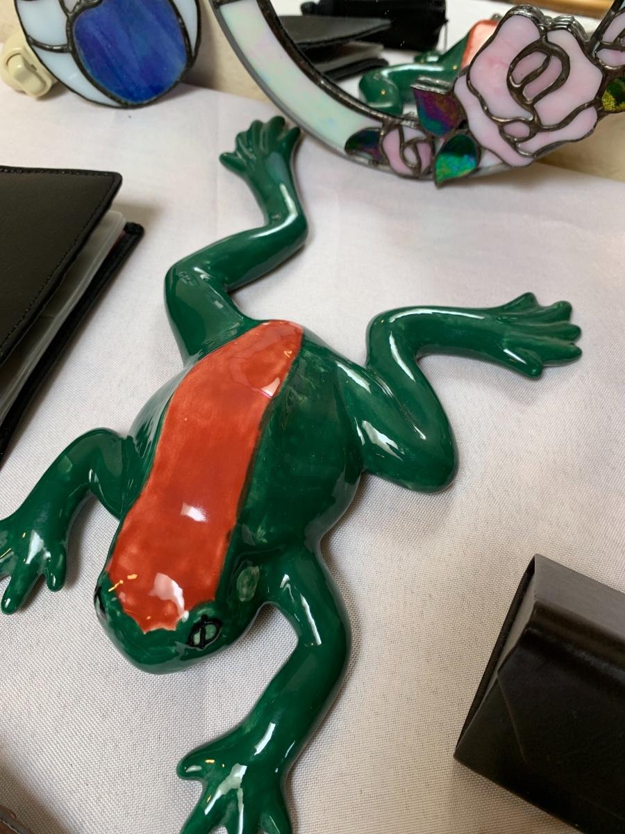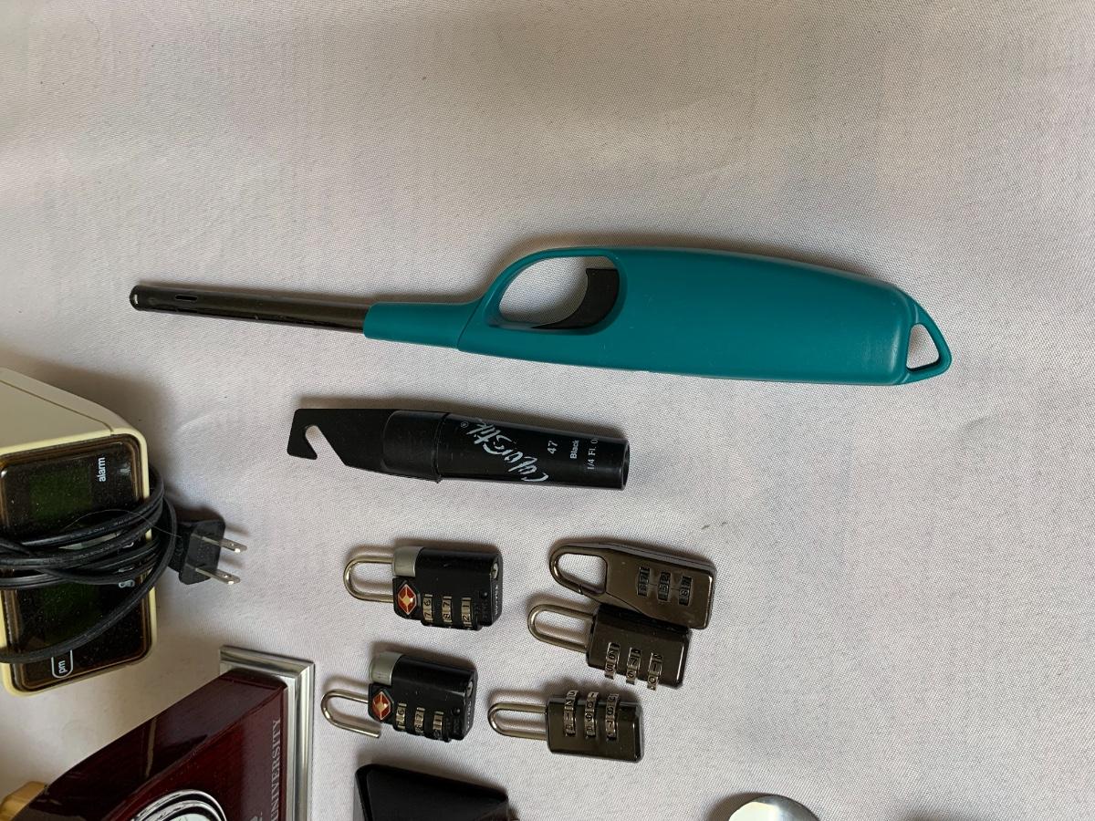 Includes a small stained glass mirror and nightlight, a few clocks, luggage locks with combinations, wallet, glasses, Brookstone brand loop, soap dish, and ceramic frog.