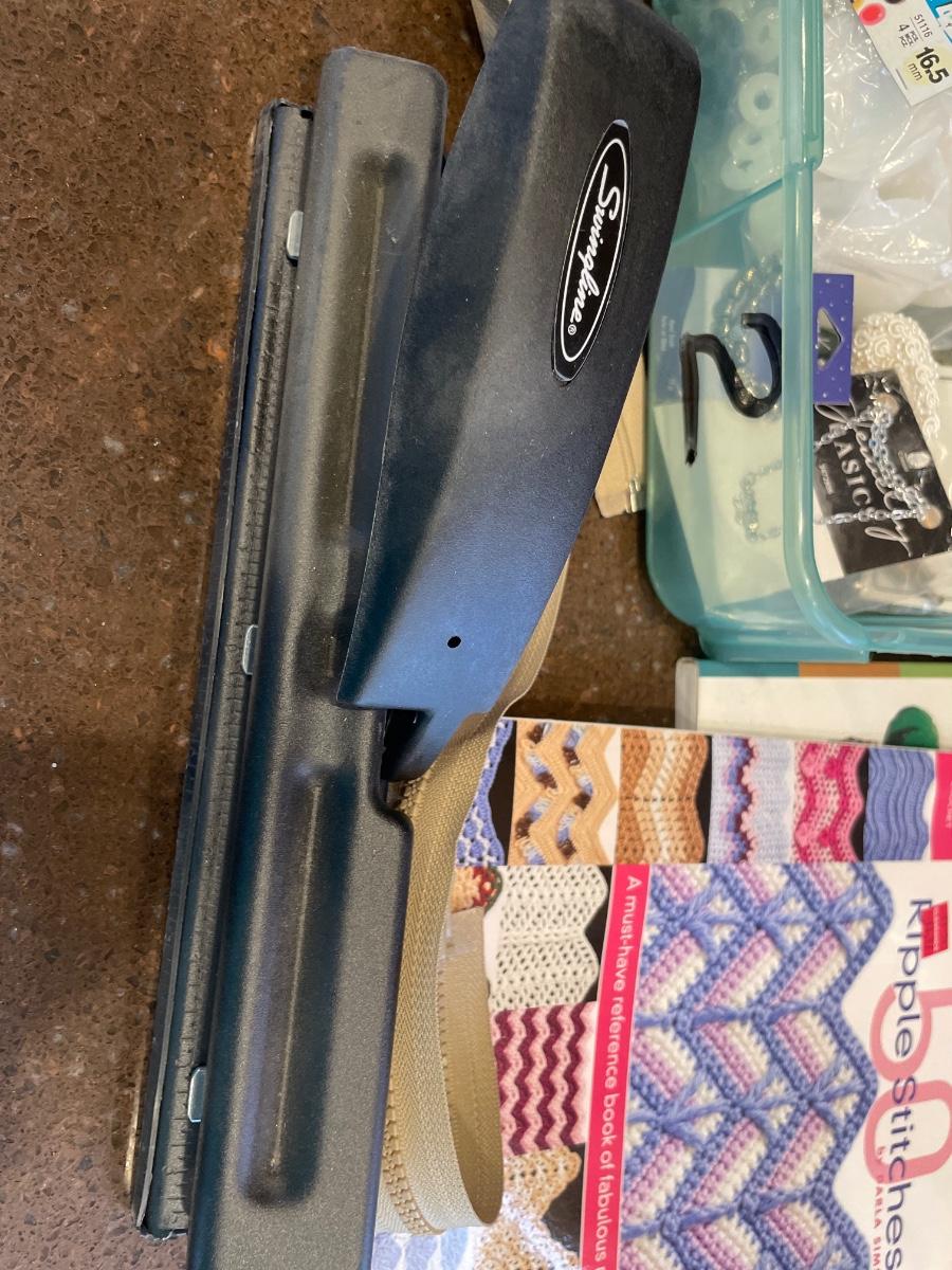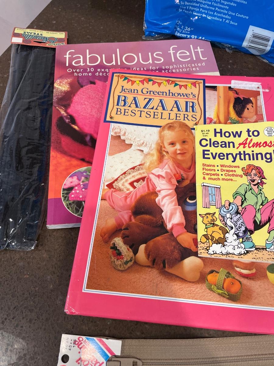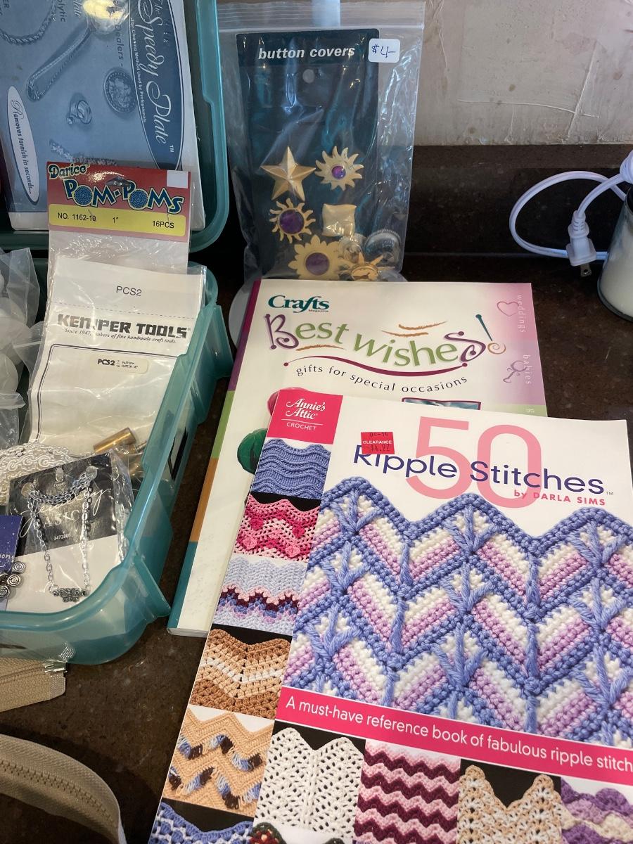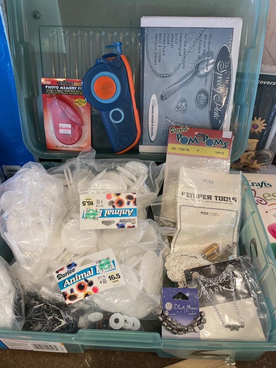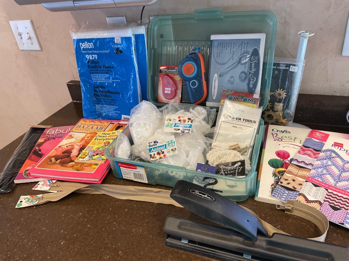 Craft books, storage container, button covers, zippers, Swingline 3 hole punch