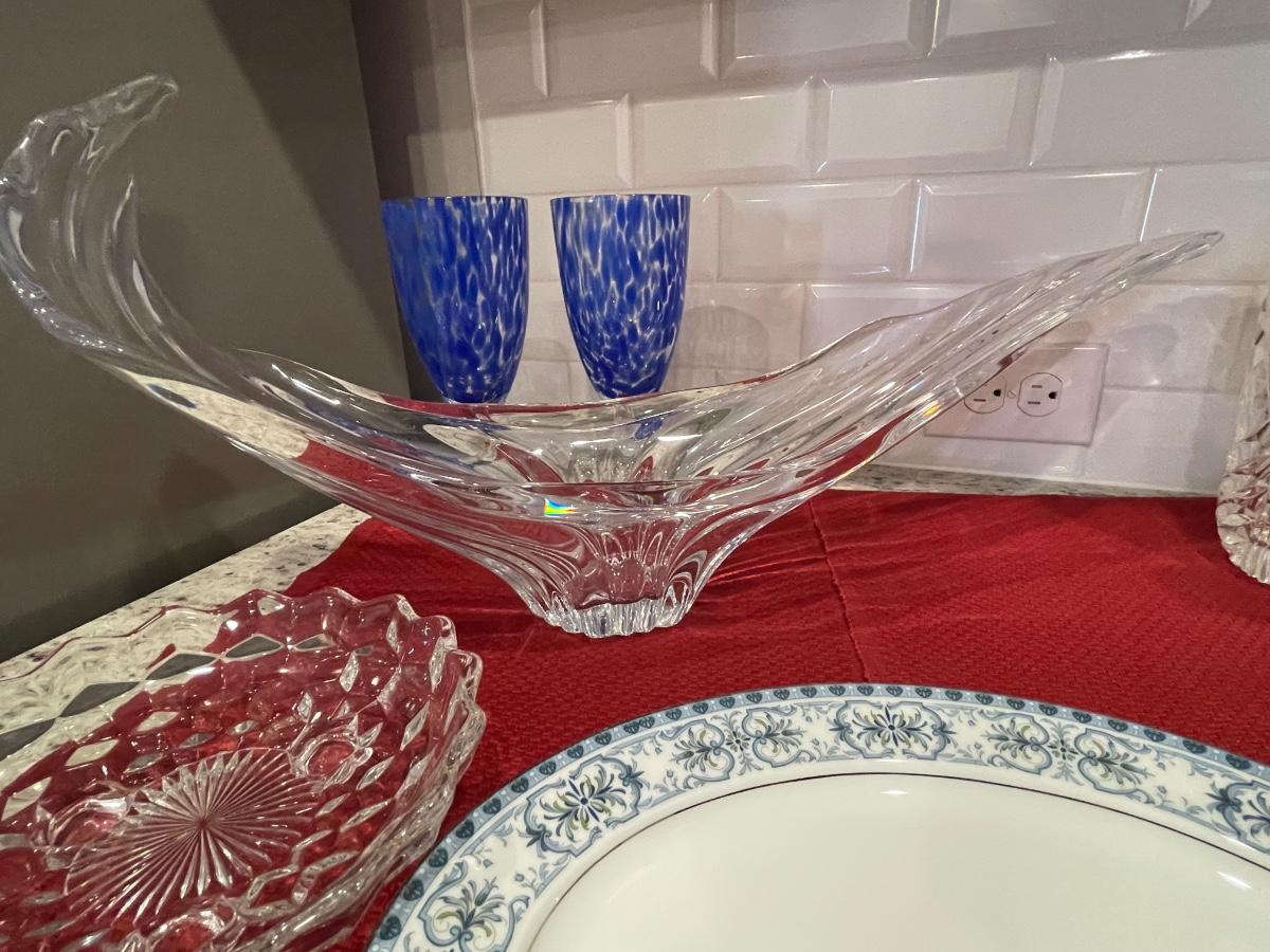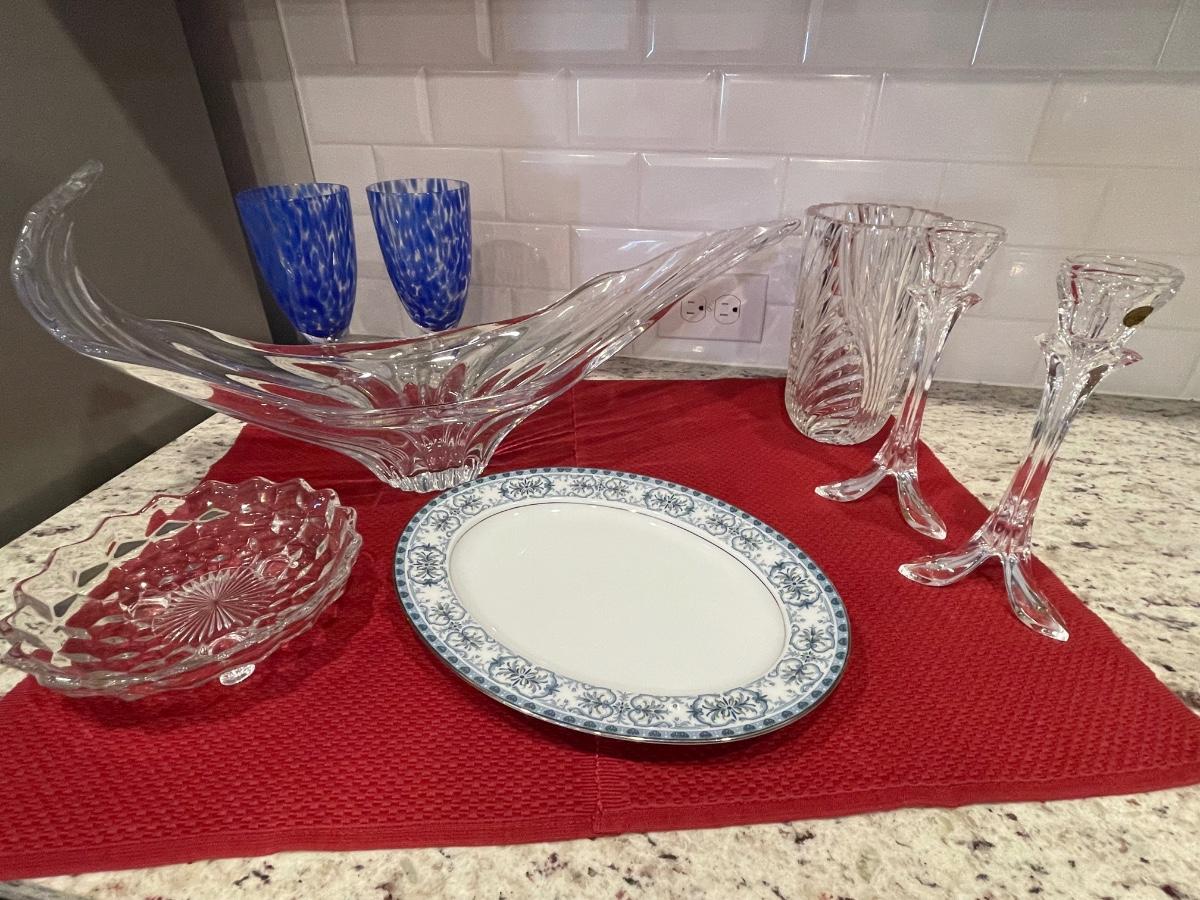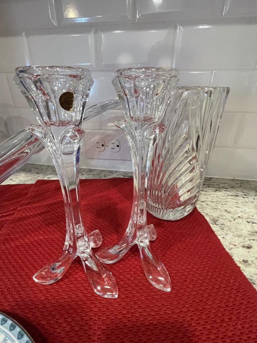 Large table Vase, candle holders, wine glasses, tall vase, small bowl, serving plate