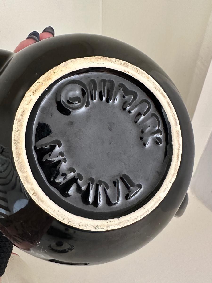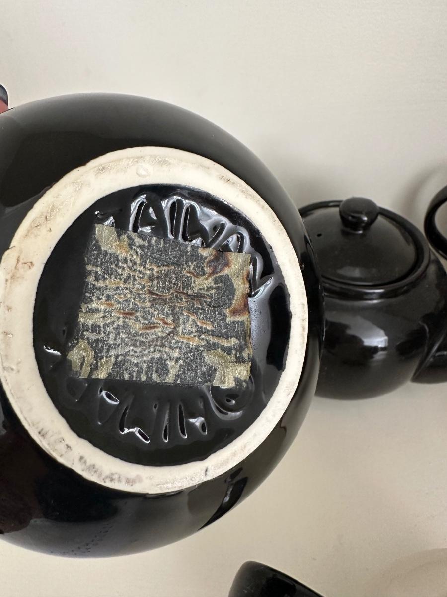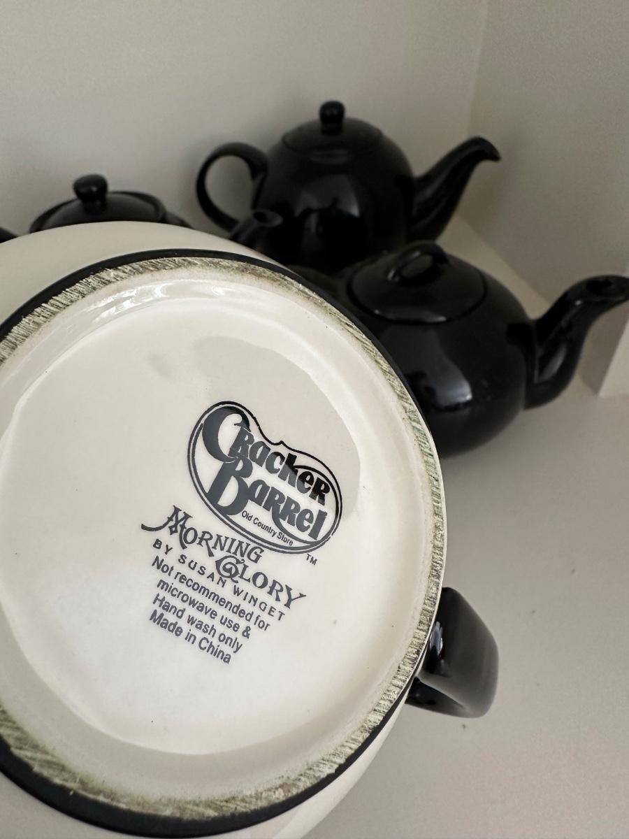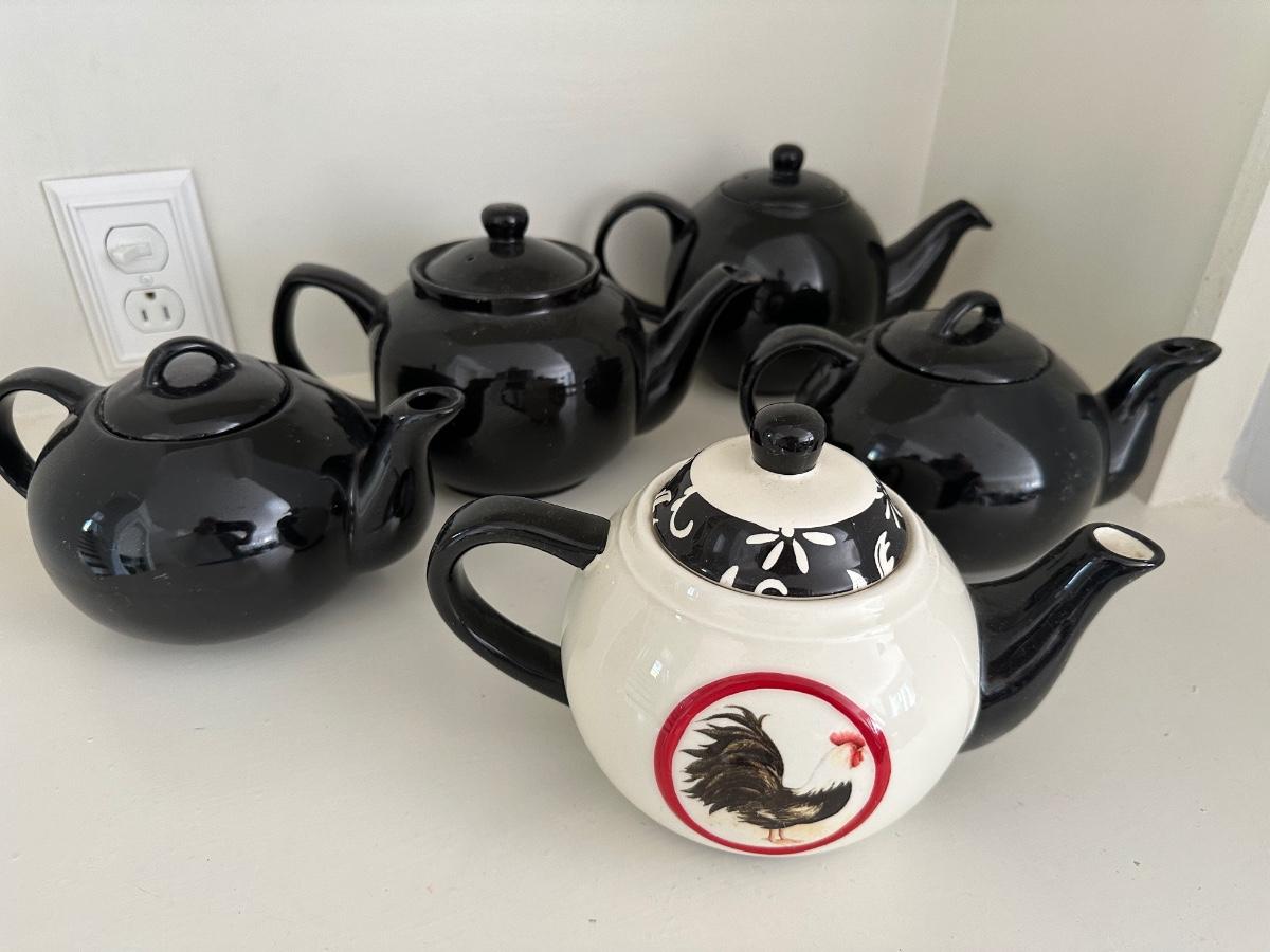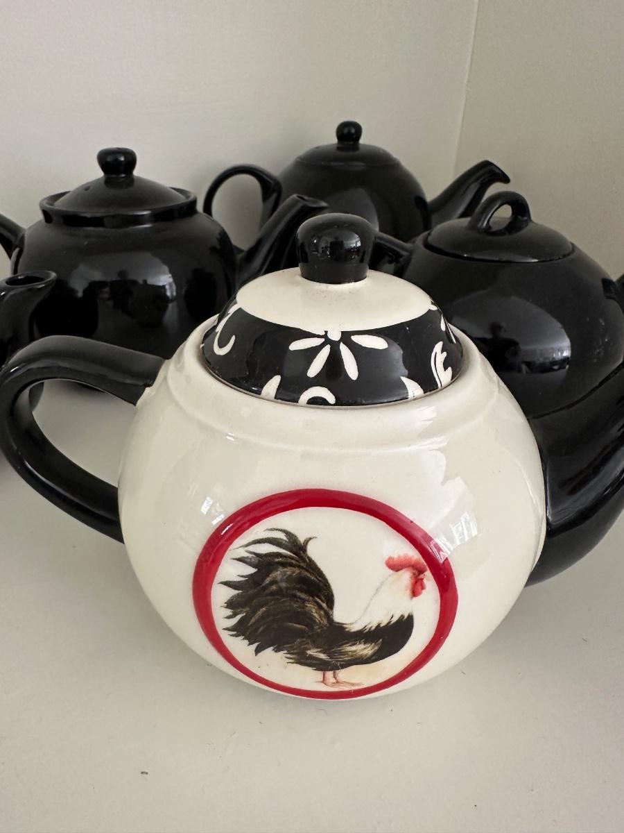 4 BLACK TEAPOTS, BLACK AND WHITE ROOSTER TEAPOT