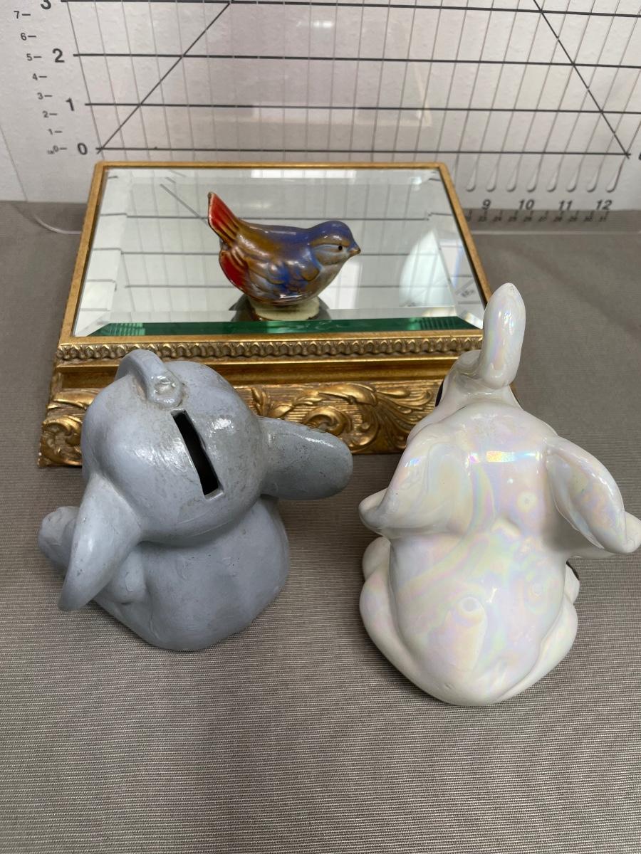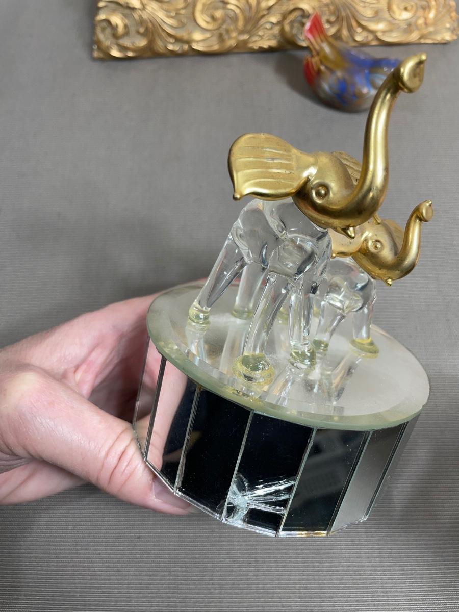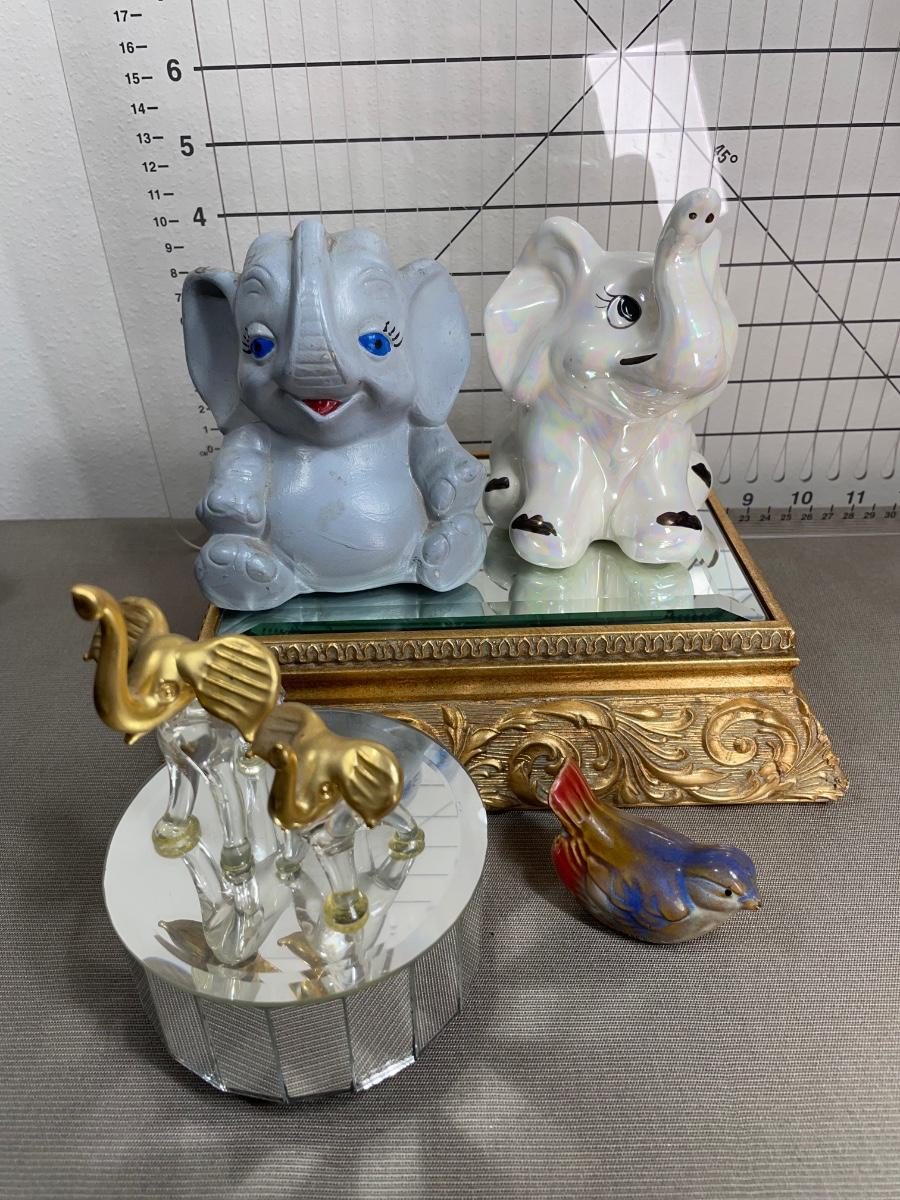 Lot of 3 elephant items and one cute little bird. Music stand plays theme to Love Story and has cracked mirror.