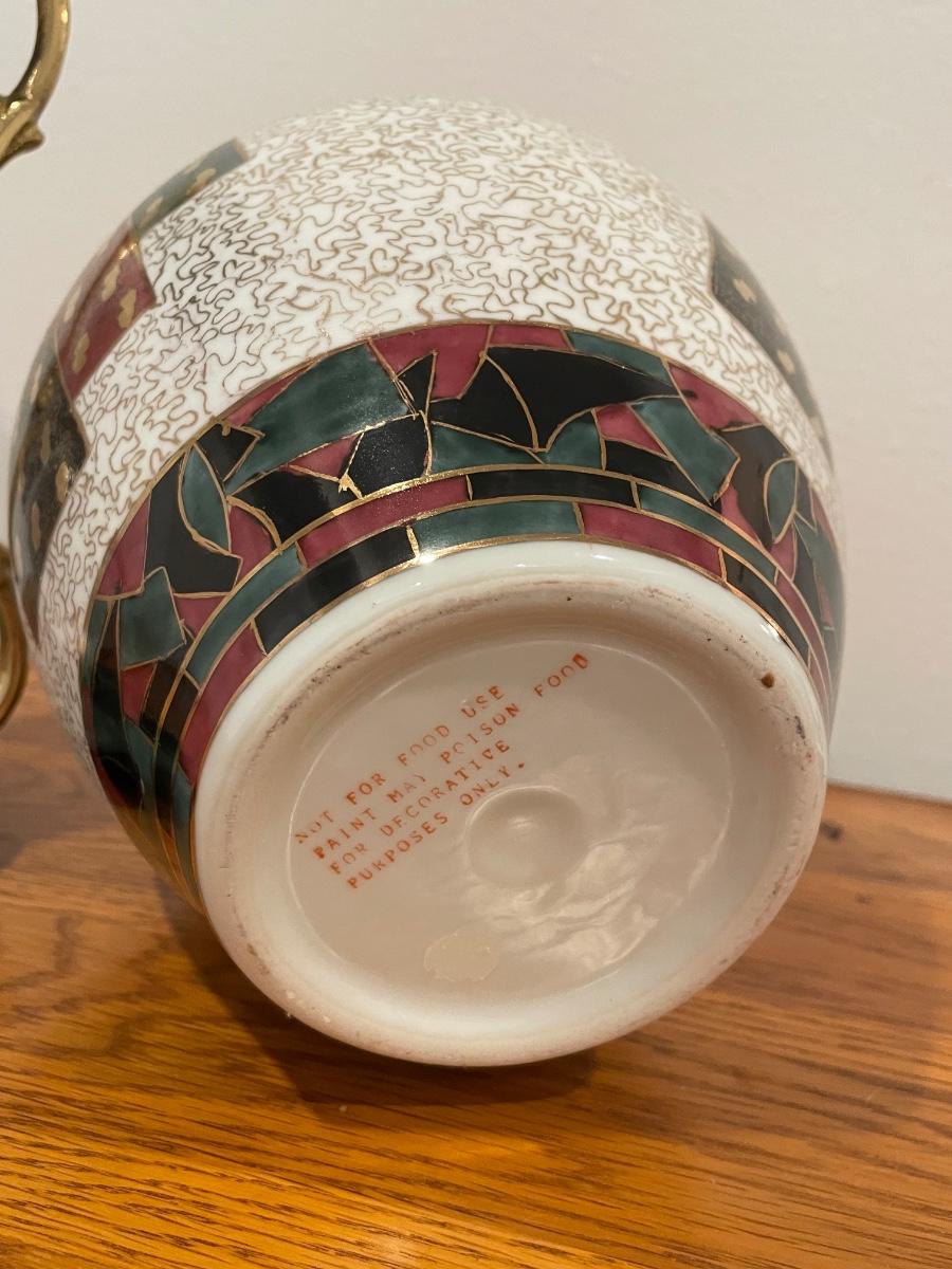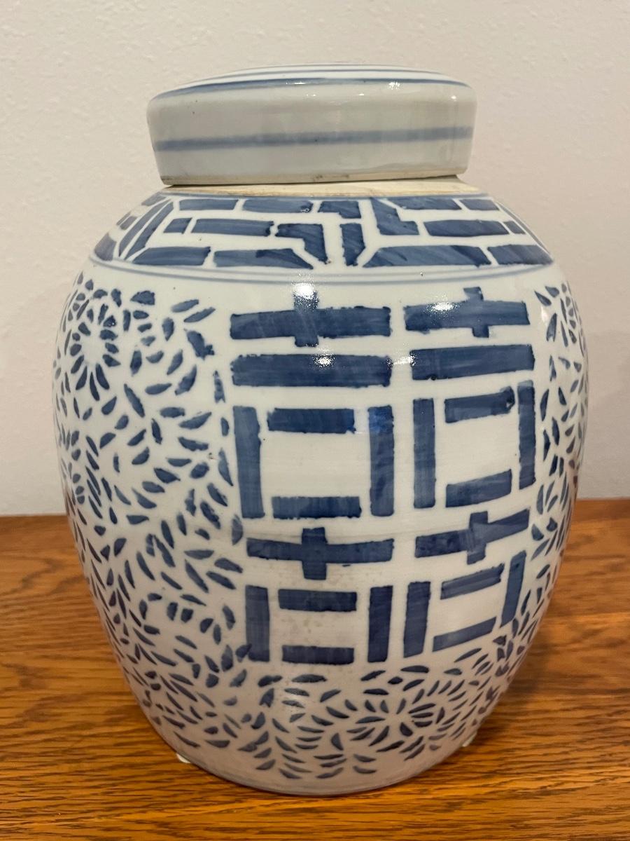 Vintage 1960/70's Oriental Chinese "Double Happiness" Ceramic Ginger Jar with Lid. No chips, cracks, crazing or stains.The glaze is strong and bright. This jar is 9.75" high (lid on) x 8.75" high (lid off). Belly diameter is 8". Base diameter is 6".