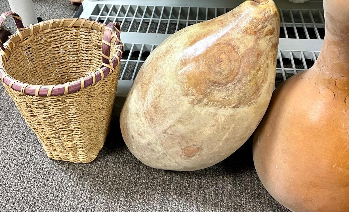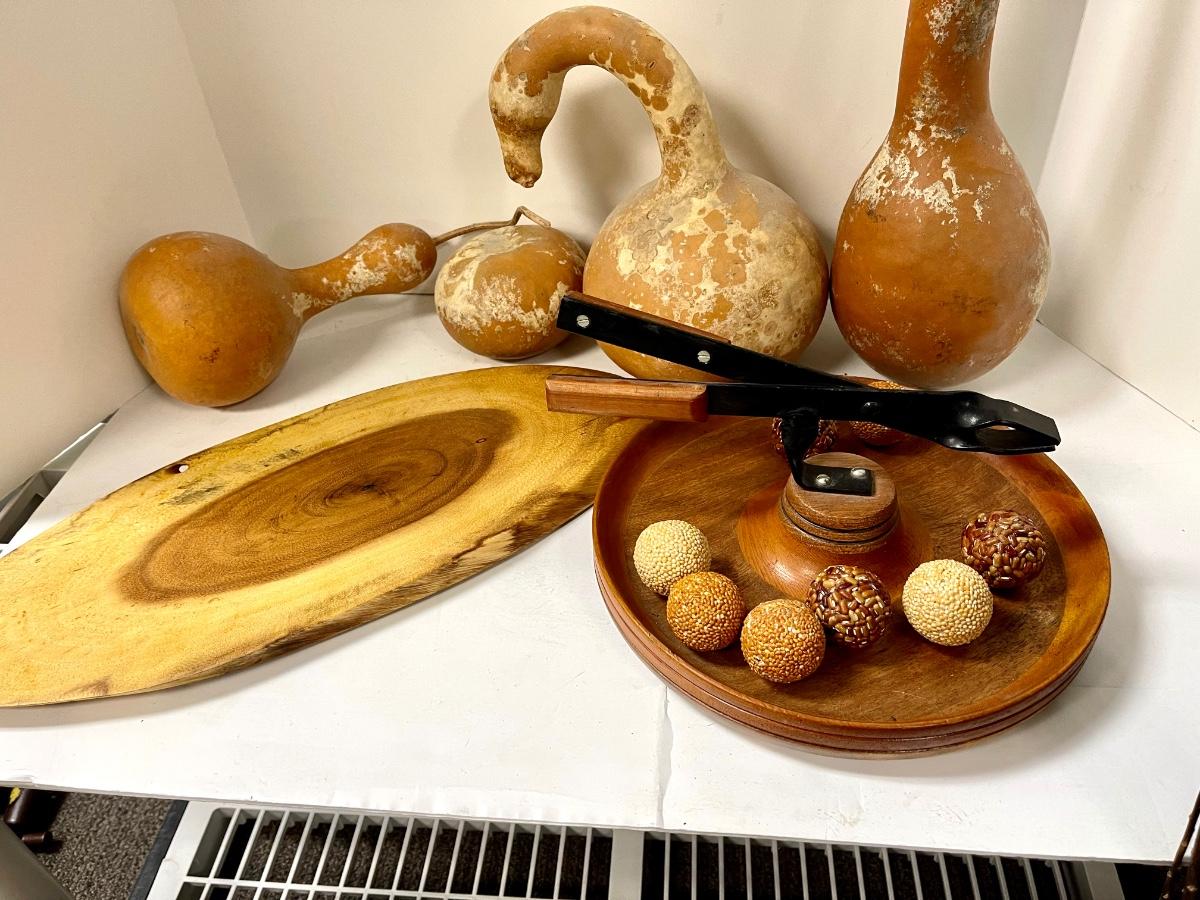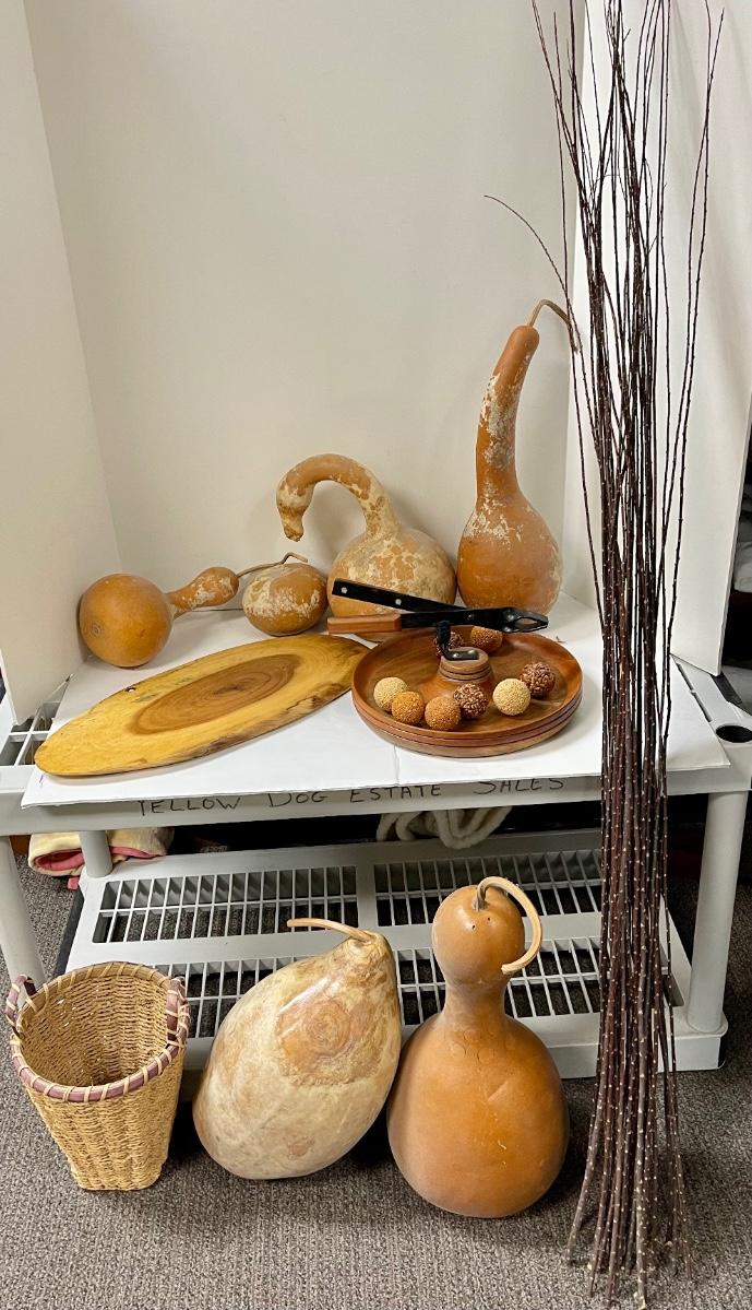 Misc Decor. Lot - gourds, reeds, basket charcuterie board, nut cracker basket