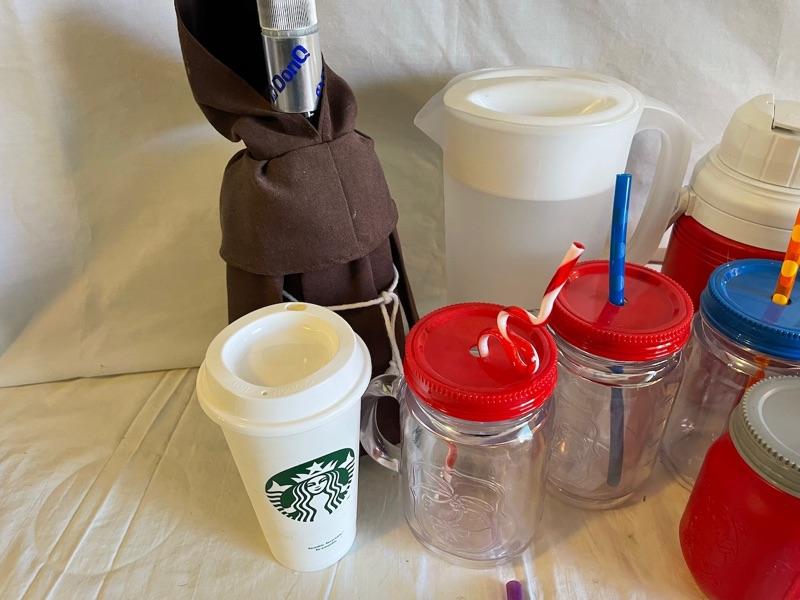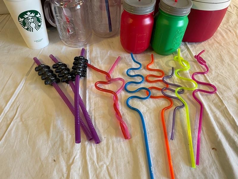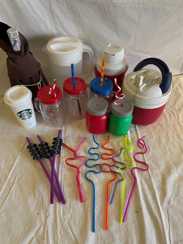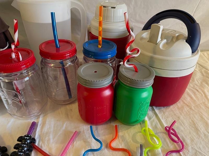 3 plastic mason jars  silly straws  column coolers pitch and a brother garb for a bottle