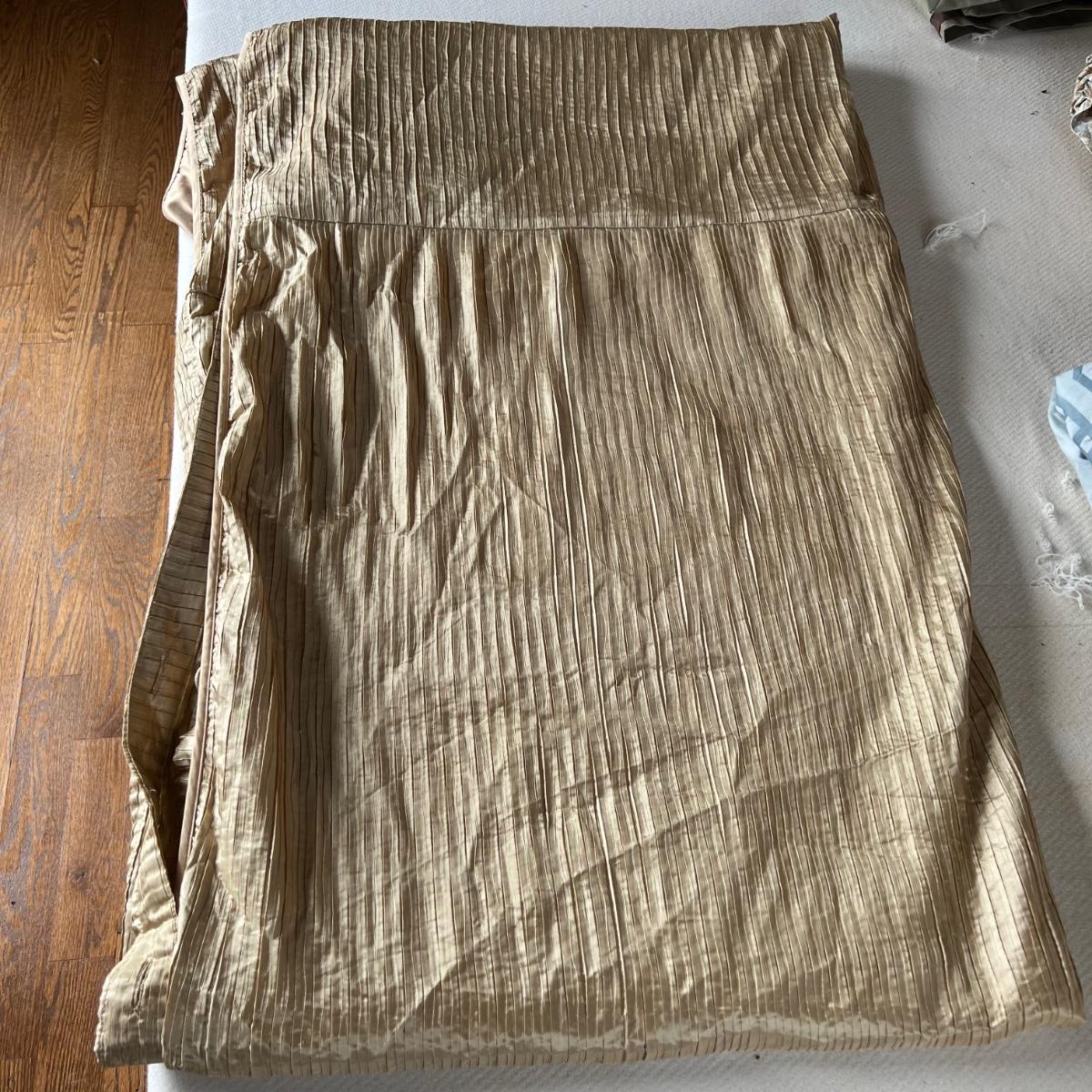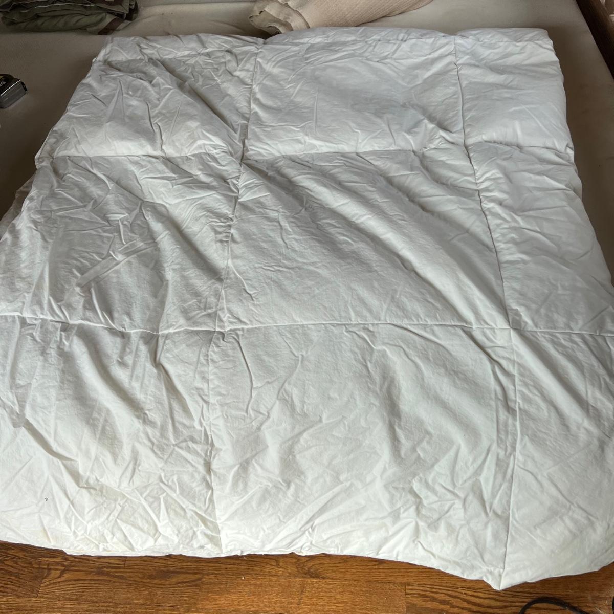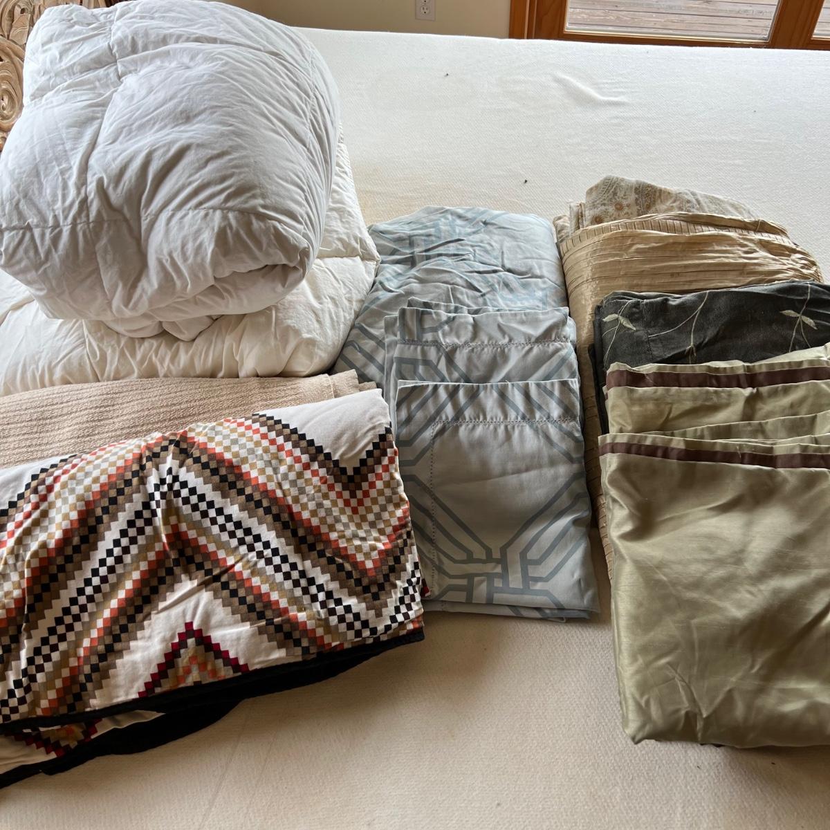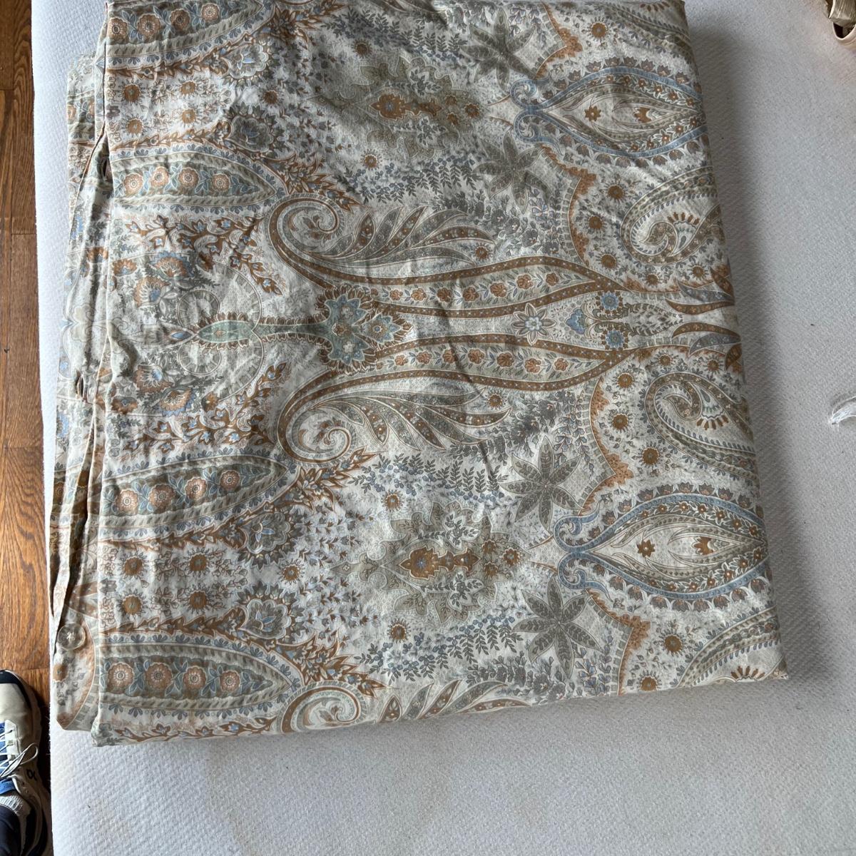 One Ralph Lauren 100% cotton oatmeal colored blanket. Three duvet covers, one queen-sized floral (measured) with no label but feels like 100% cotton, one queen silk-like gold duvet with ribbing and button closures also with no label and one heavy queen-sized cotton black and patterned duvet with no label, Two feather/down blankets. One smaller lap-like blanket with no label measuring 76” X 110” and one larger IKEA queen down/feather comforter (not minor staining in photos). Lastly, two 27” square green and brown shams.