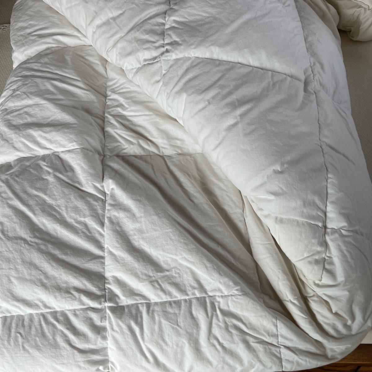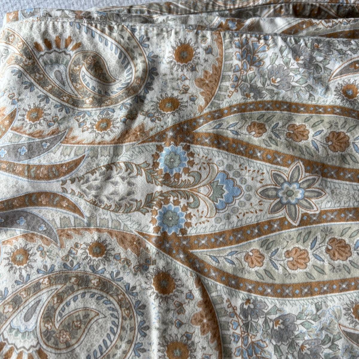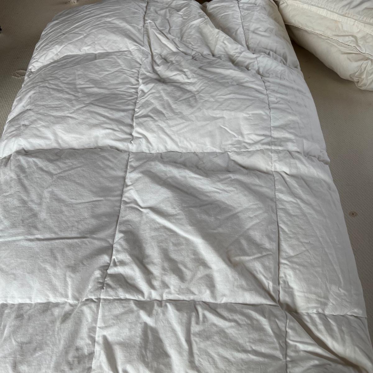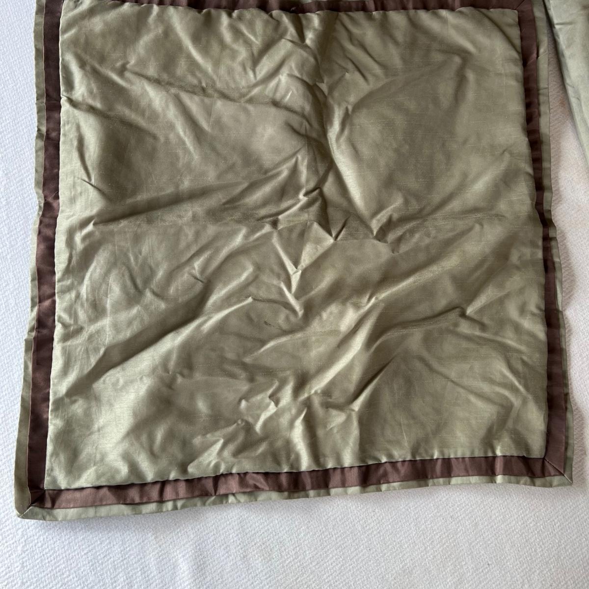 One Ralph Lauren 100% cotton oatmeal colored blanket. Three duvet covers, one queen-sized floral (measured) with no label but feels like 100% cotton, one queen silk-like gold duvet with ribbing and button closures also with no label and one heavy queen-sized cotton black and patterned duvet with no label, Two feather/down blankets. One smaller lap-like blanket with no label measuring 76” X 110” and one larger IKEA queen down/feather comforter (not minor staining in photos). Lastly, two 27” square green and brown shams.