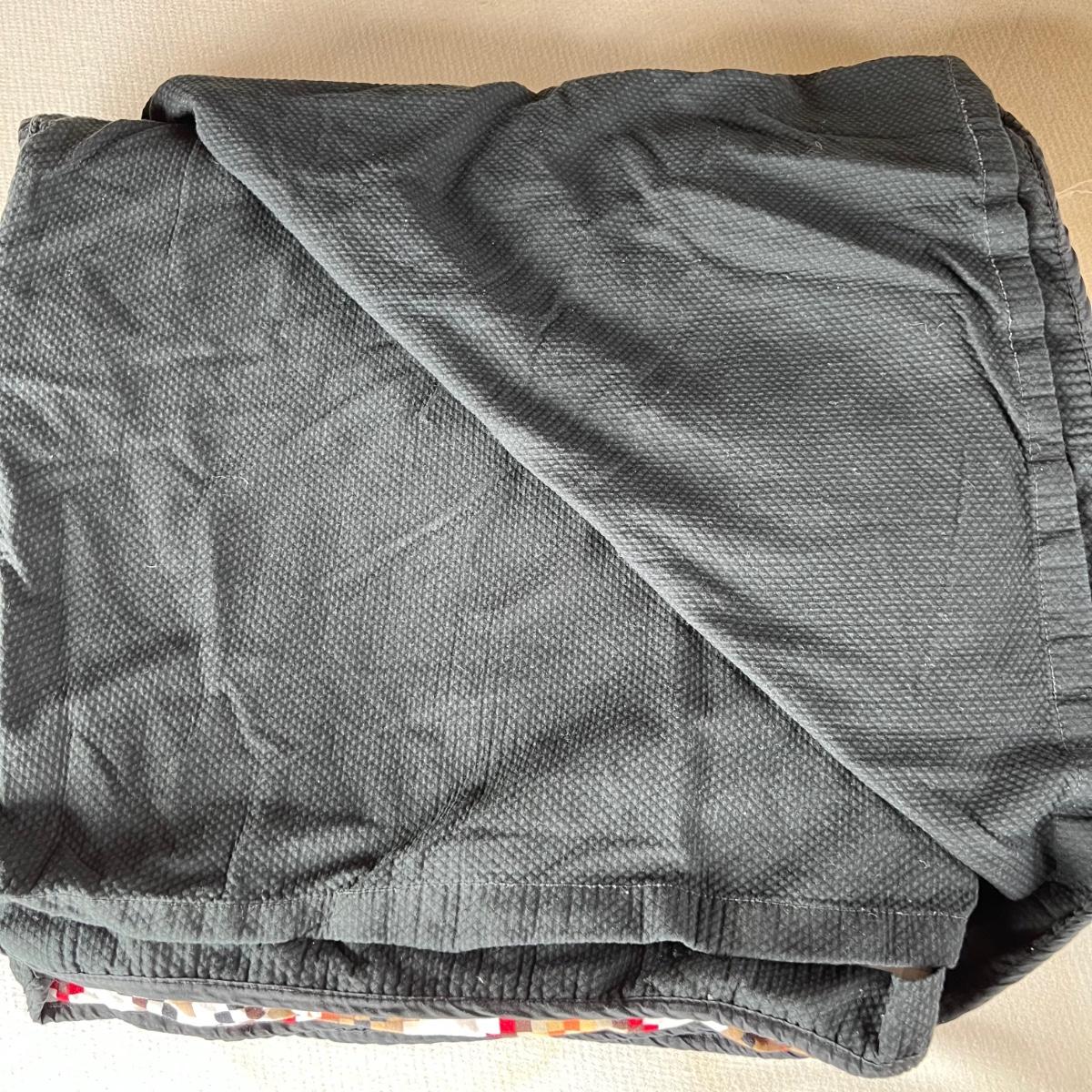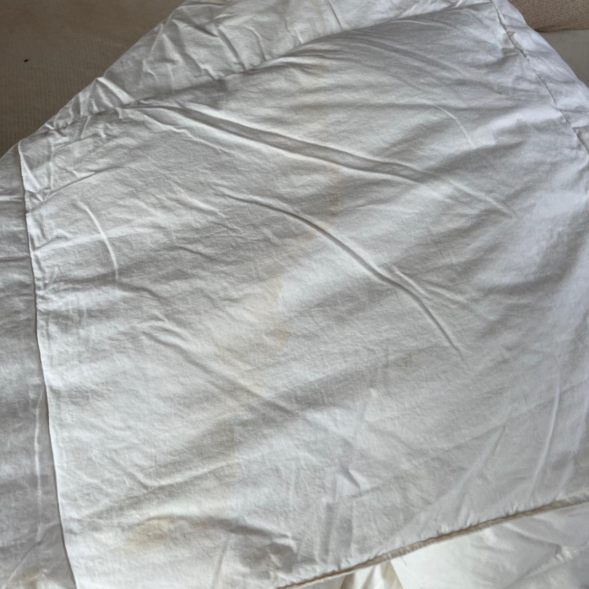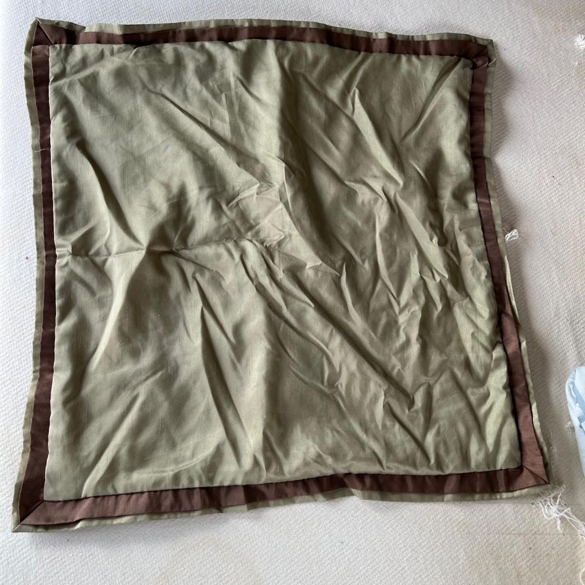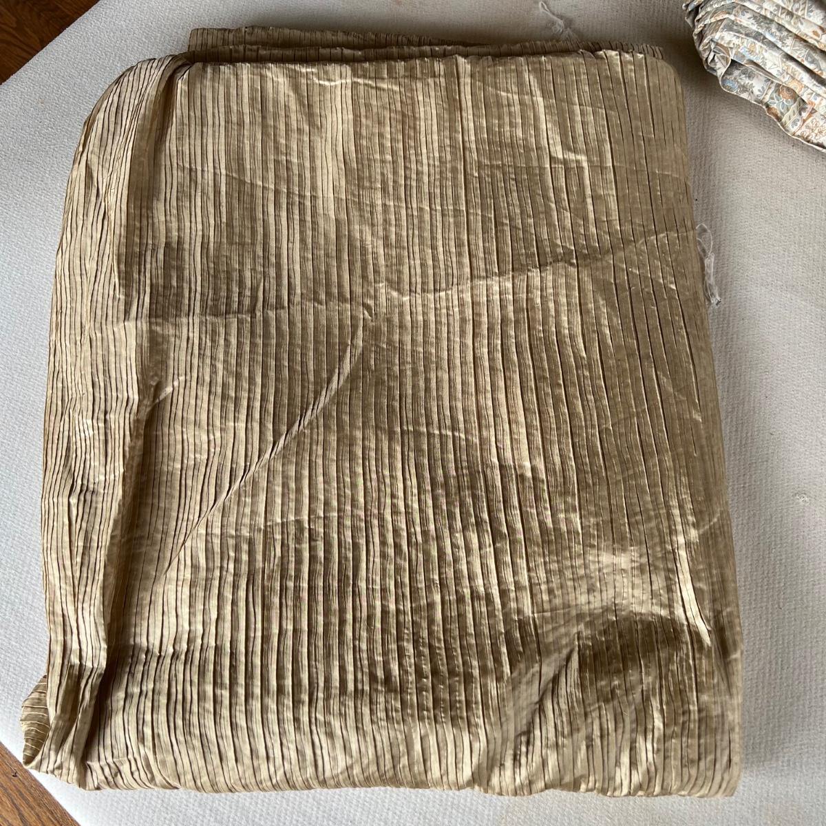 One Ralph Lauren 100% cotton oatmeal colored blanket. Three duvet covers, one queen-sized floral (measured) with no label but feels like 100% cotton, one queen silk-like gold duvet with ribbing and button closures also with no label and one heavy queen-sized cotton black and patterned duvet with no label, Two feather/down blankets. One smaller lap-like blanket with no label measuring 76” X 110” and one larger IKEA queen down/feather comforter (not minor staining in photos). Lastly, two 27” square green and brown shams.