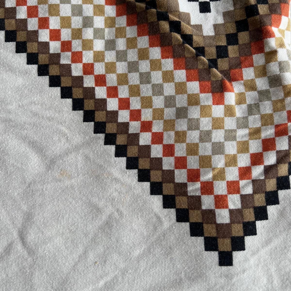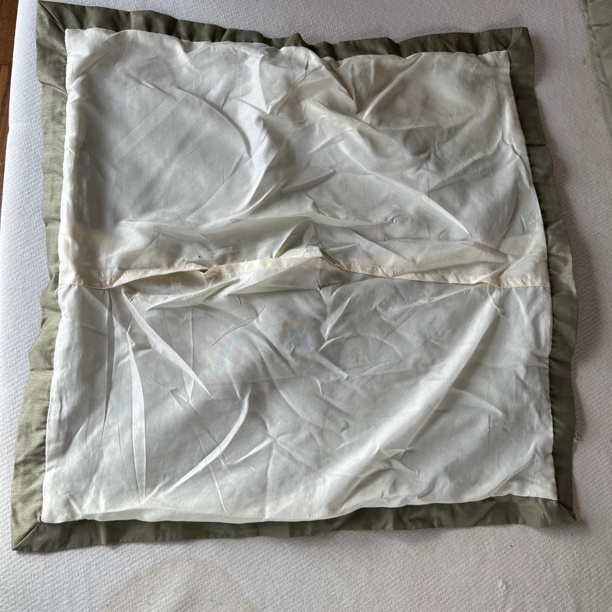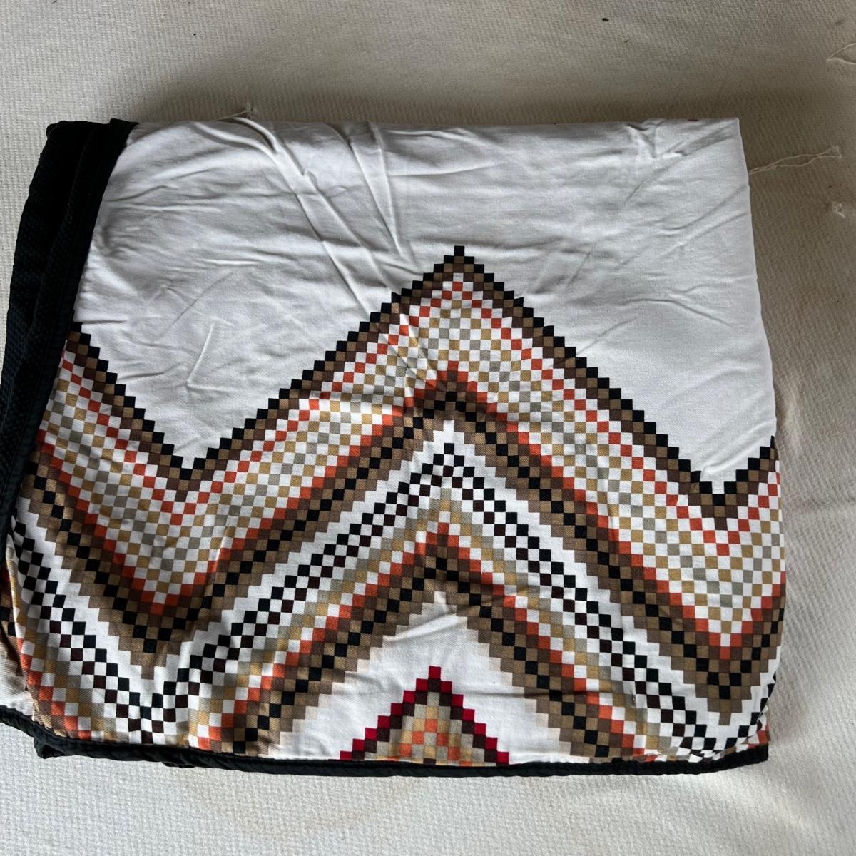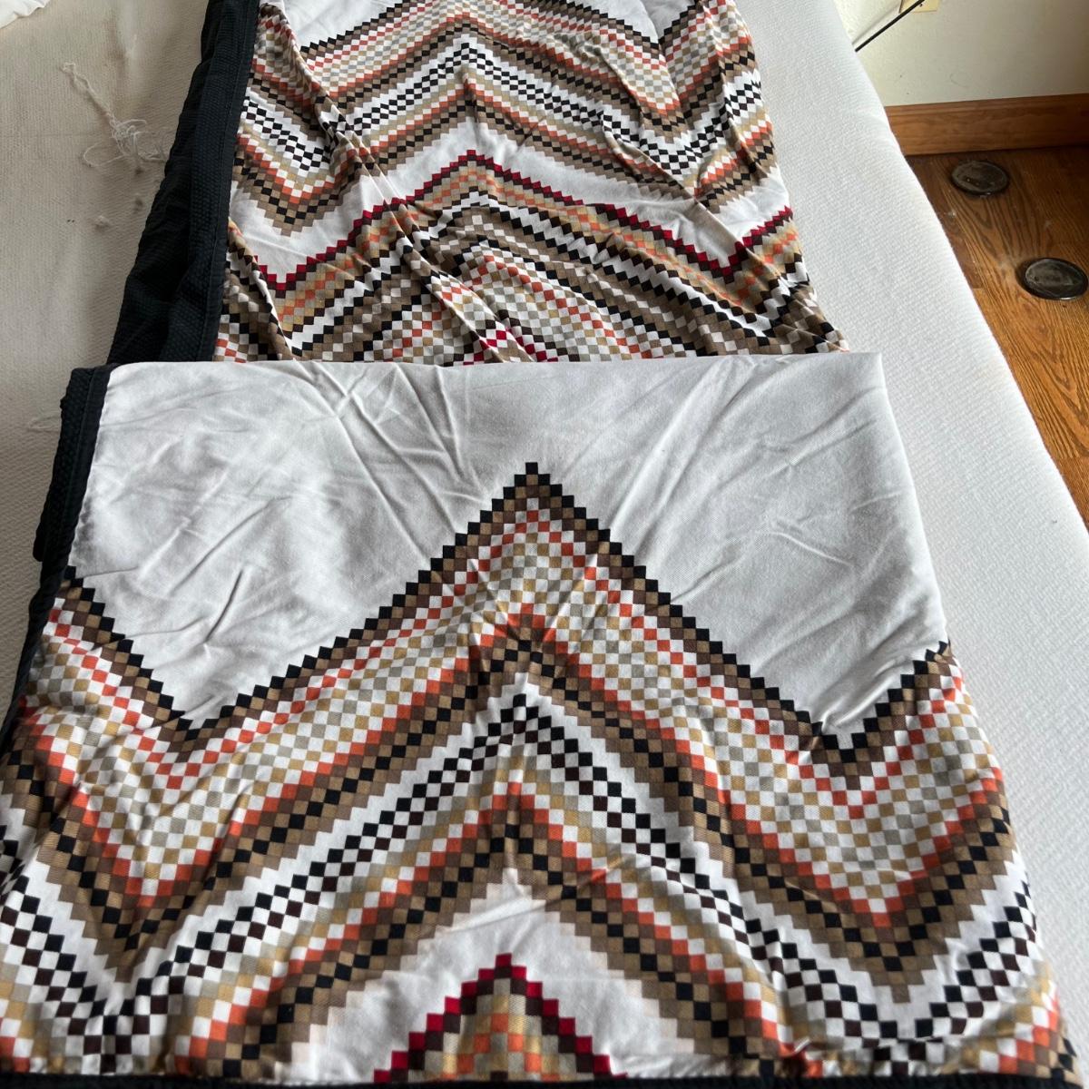 One Ralph Lauren 100% cotton oatmeal colored blanket. Three duvet covers, one queen-sized floral (measured) with no label but feels like 100% cotton, one queen silk-like gold duvet with ribbing and button closures also with no label and one heavy queen-sized cotton black and patterned duvet with no label, Two feather/down blankets. One smaller lap-like blanket with no label measuring 76” X 110” and one larger IKEA queen down/feather comforter (not minor staining in photos). Lastly, two 27” square green and brown shams.