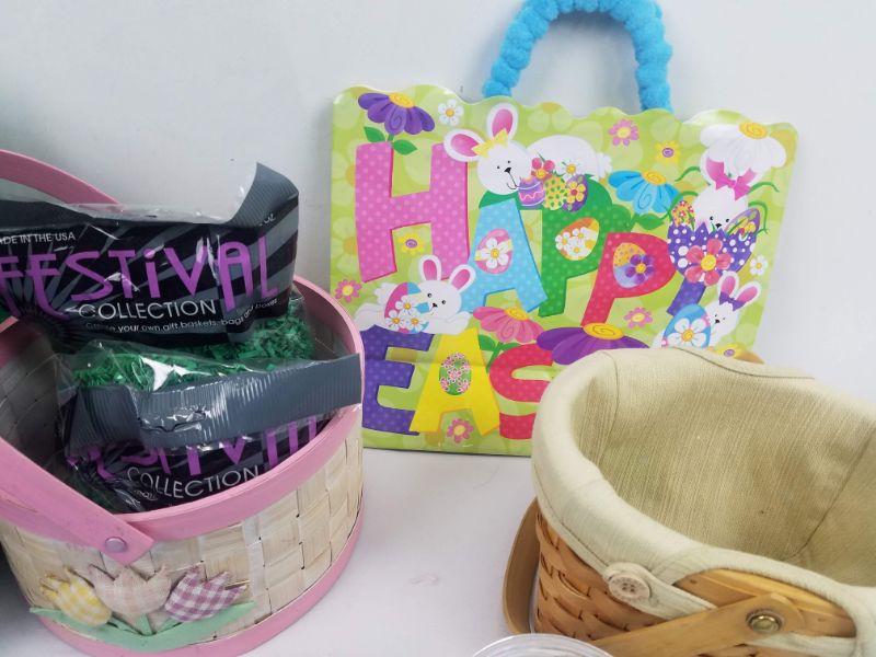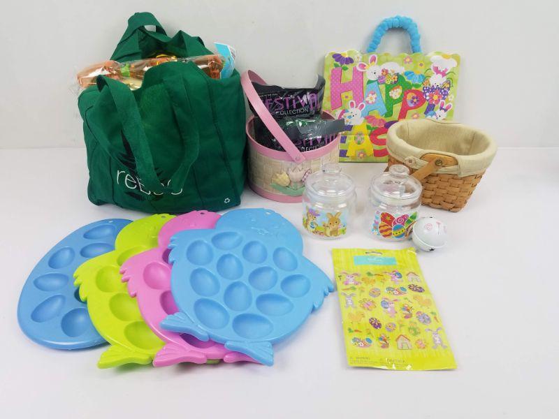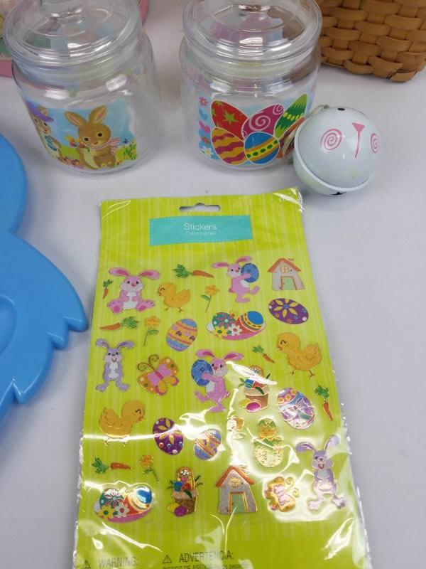 Misc Easter Decor: Plastic Eggs, 2 Baskets, Stickers, Gift Bag, etc