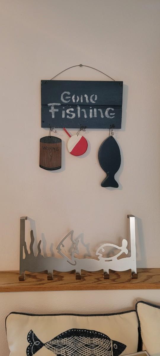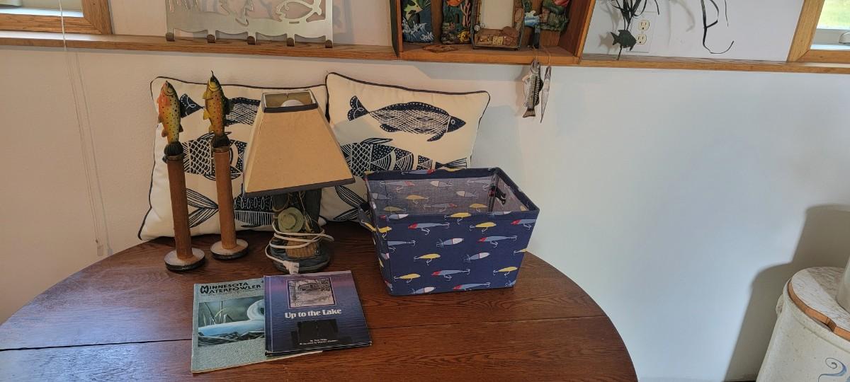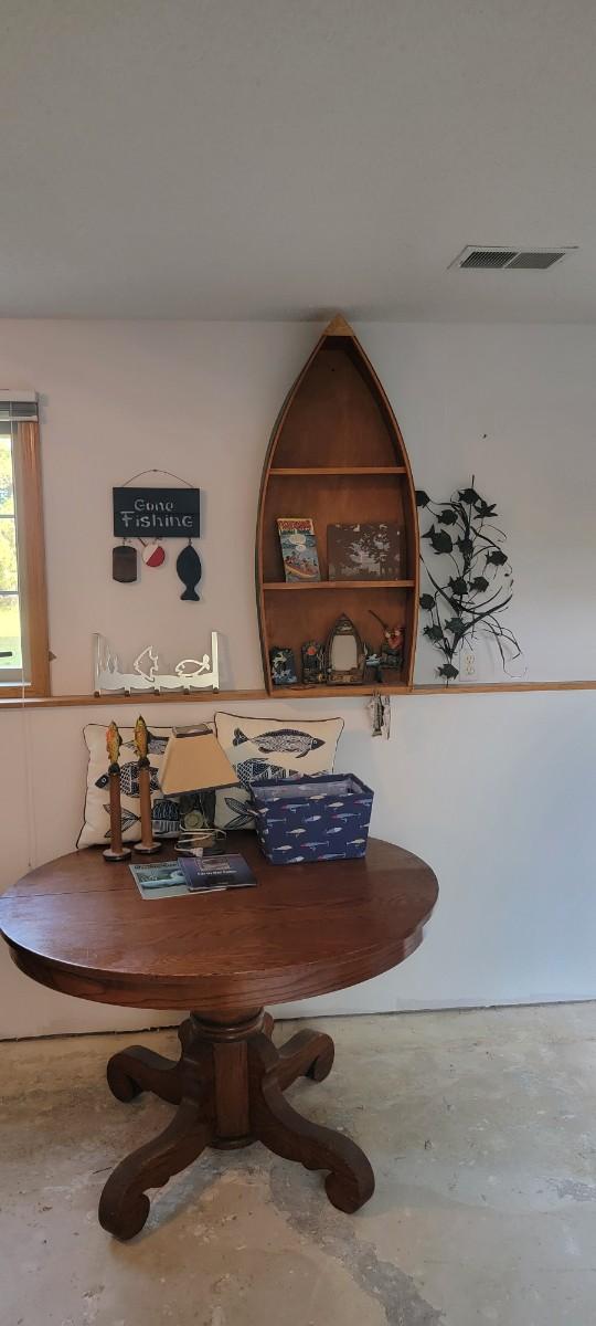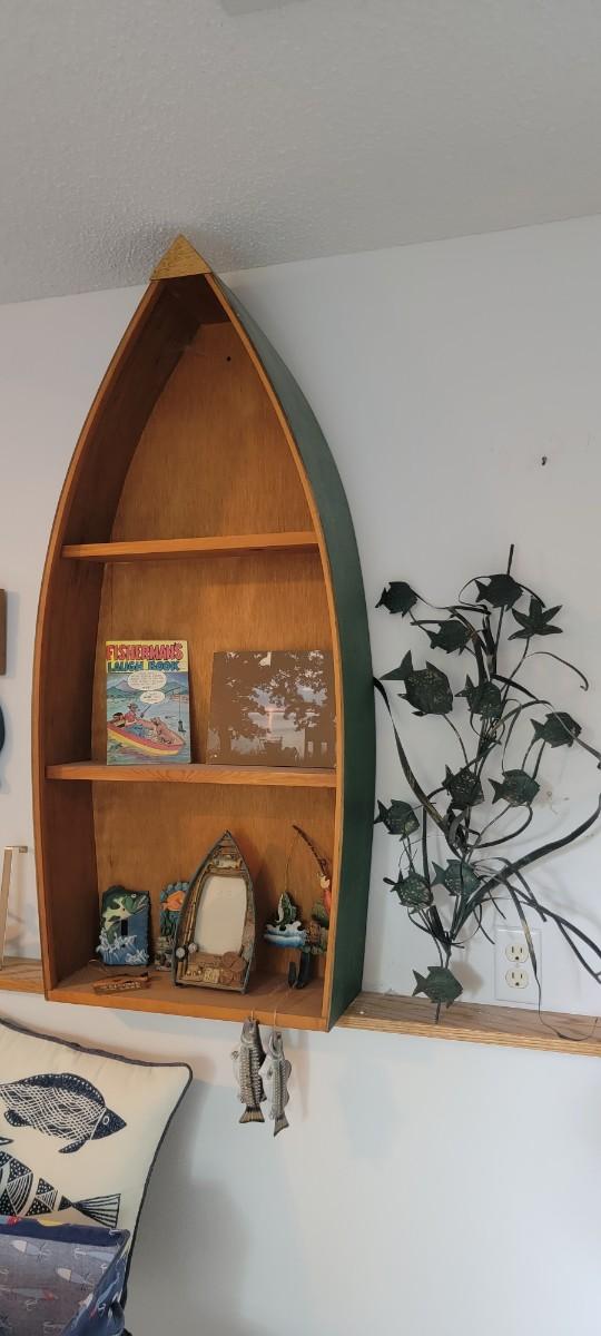 Canoe bookshelf 46" H 20" W 7" D, Fishermans Laugh book, pillows, and more!! Table excluded.