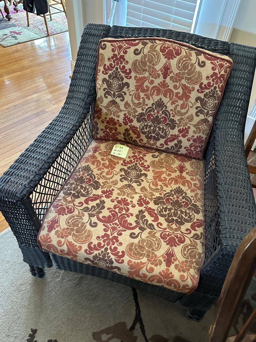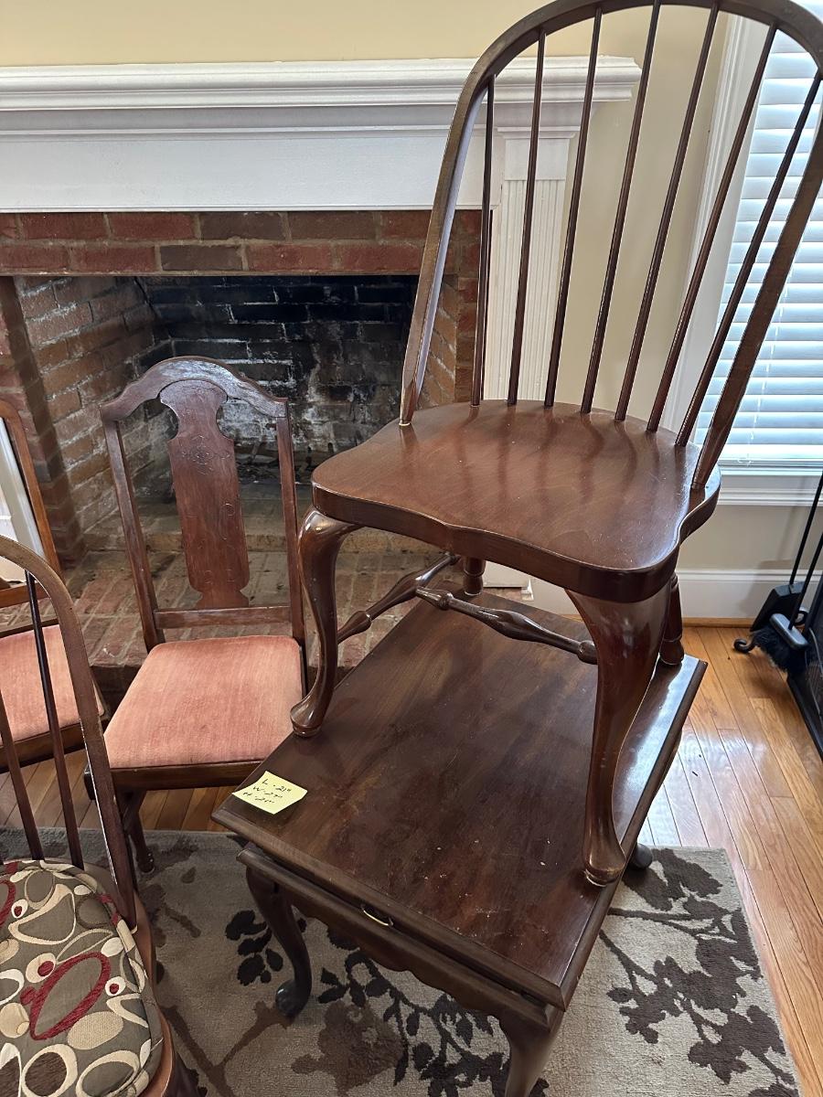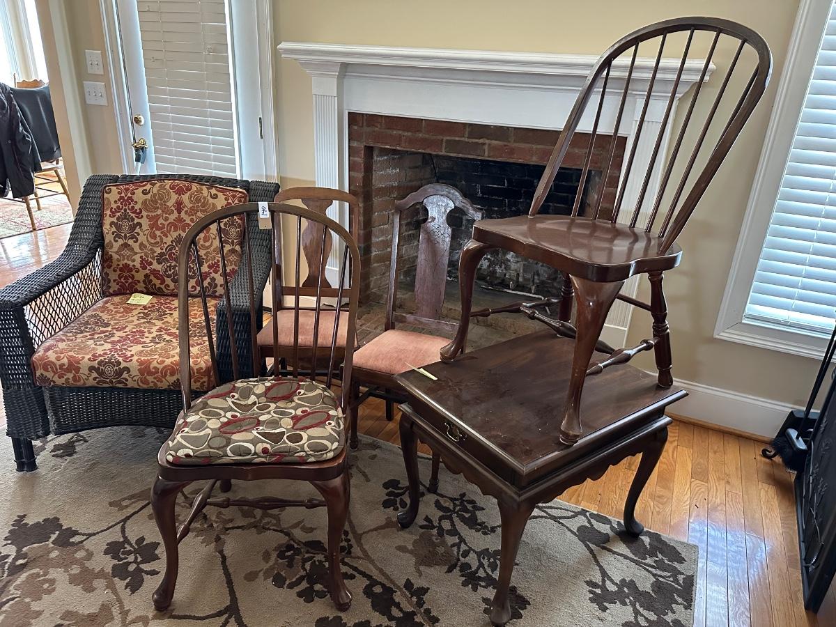 MISC FURNITURE LOT 4 DINING CHAIRS, NIGHTSTAND, WICKER CHAIR (FAIR CONDITIONS) AS PICTURED