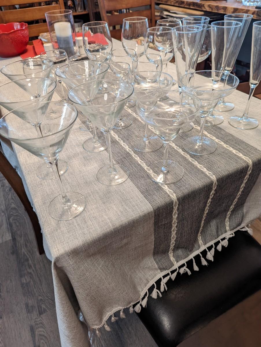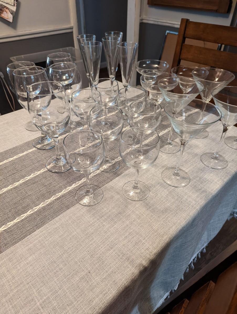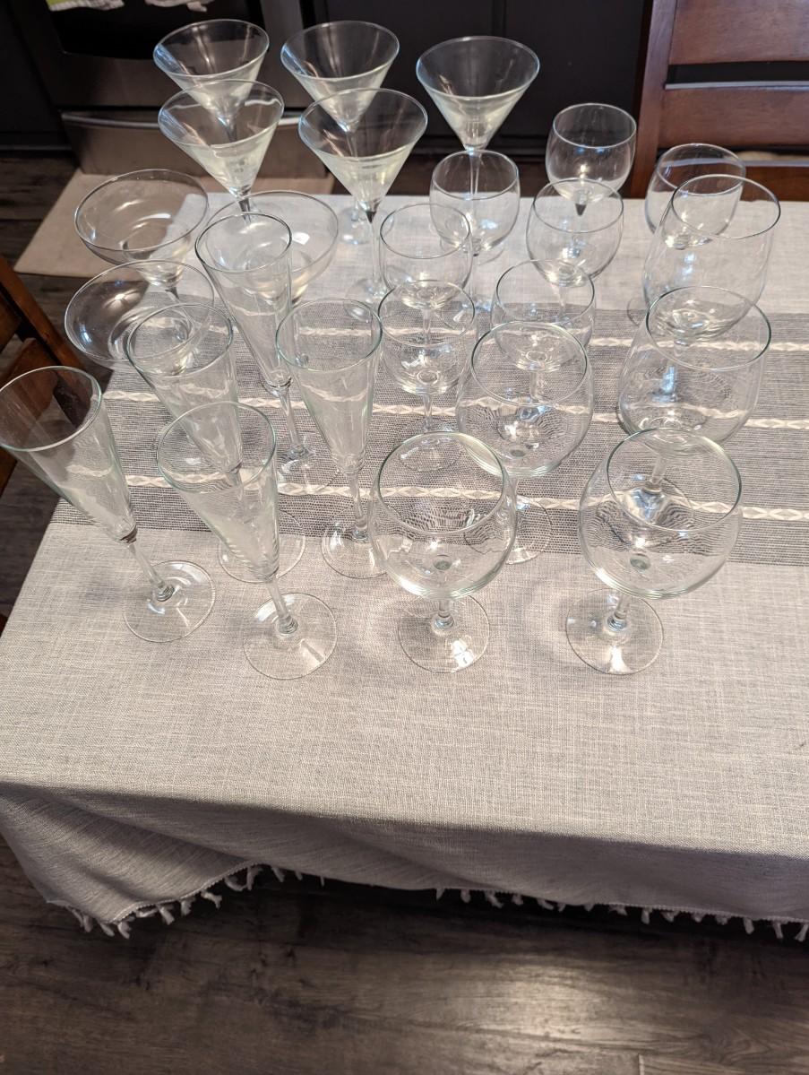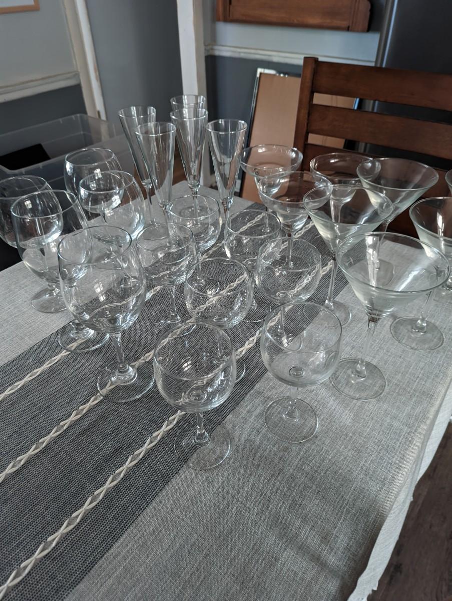 REd and White wine glasses, champagna glasses, martini glasses and margaritat glasses.