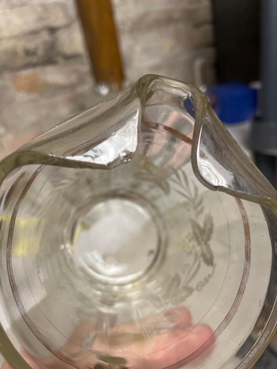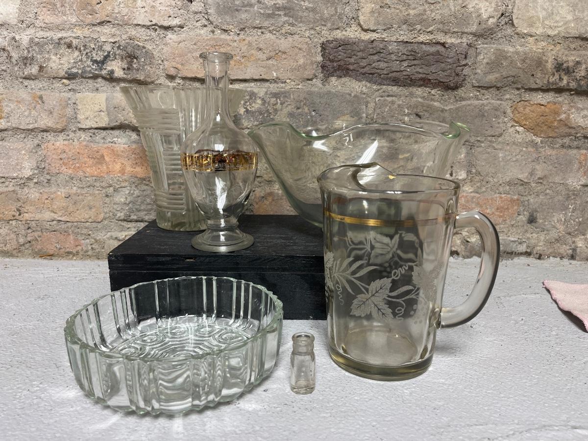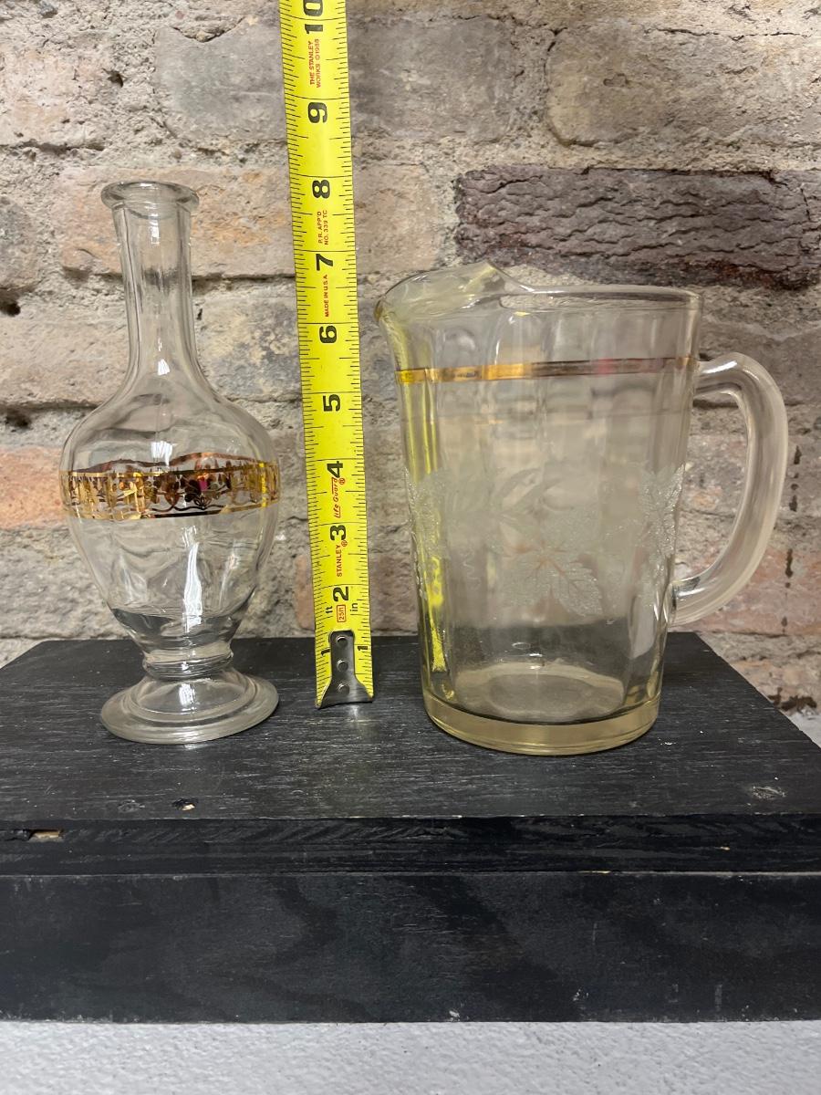 Scalloped glass serving bowl, Anchor Hocking basket weave vase, Bartlett and Collins “Golden Grape” pitcher with wear and chips at spout, vintage genie bottle decanter w/o stopper, , Anchor Hocking candy dish, and teeny tiny ampule