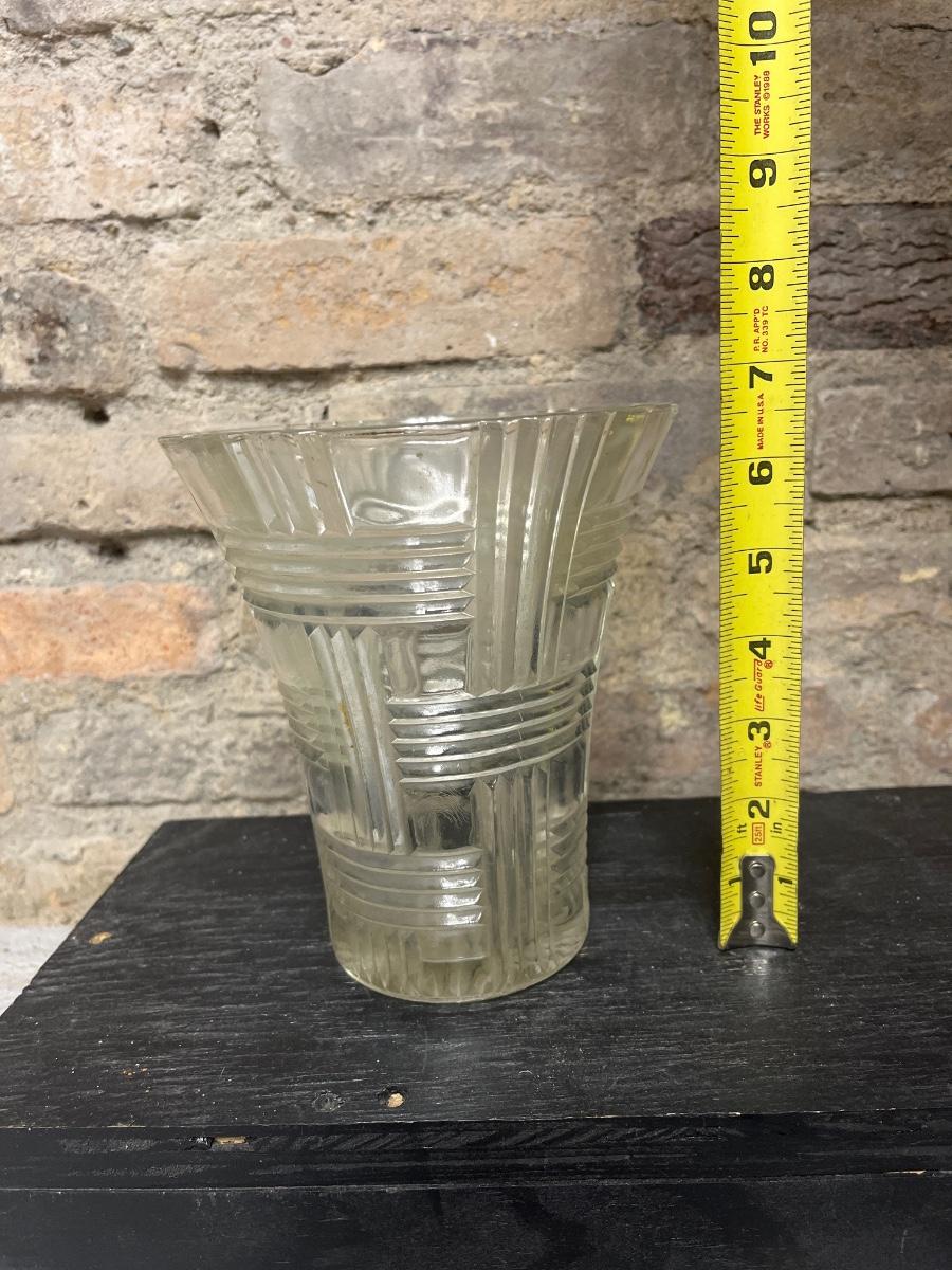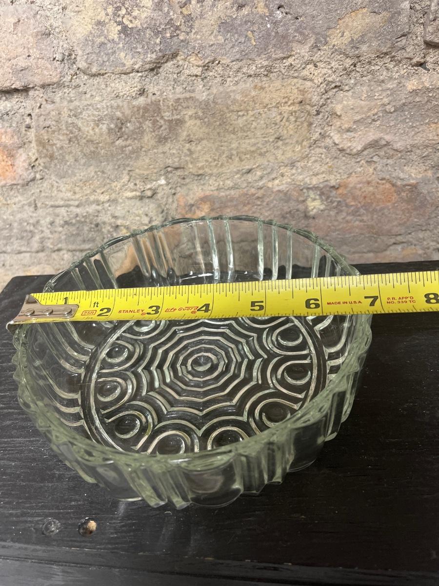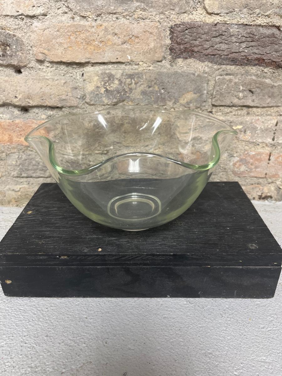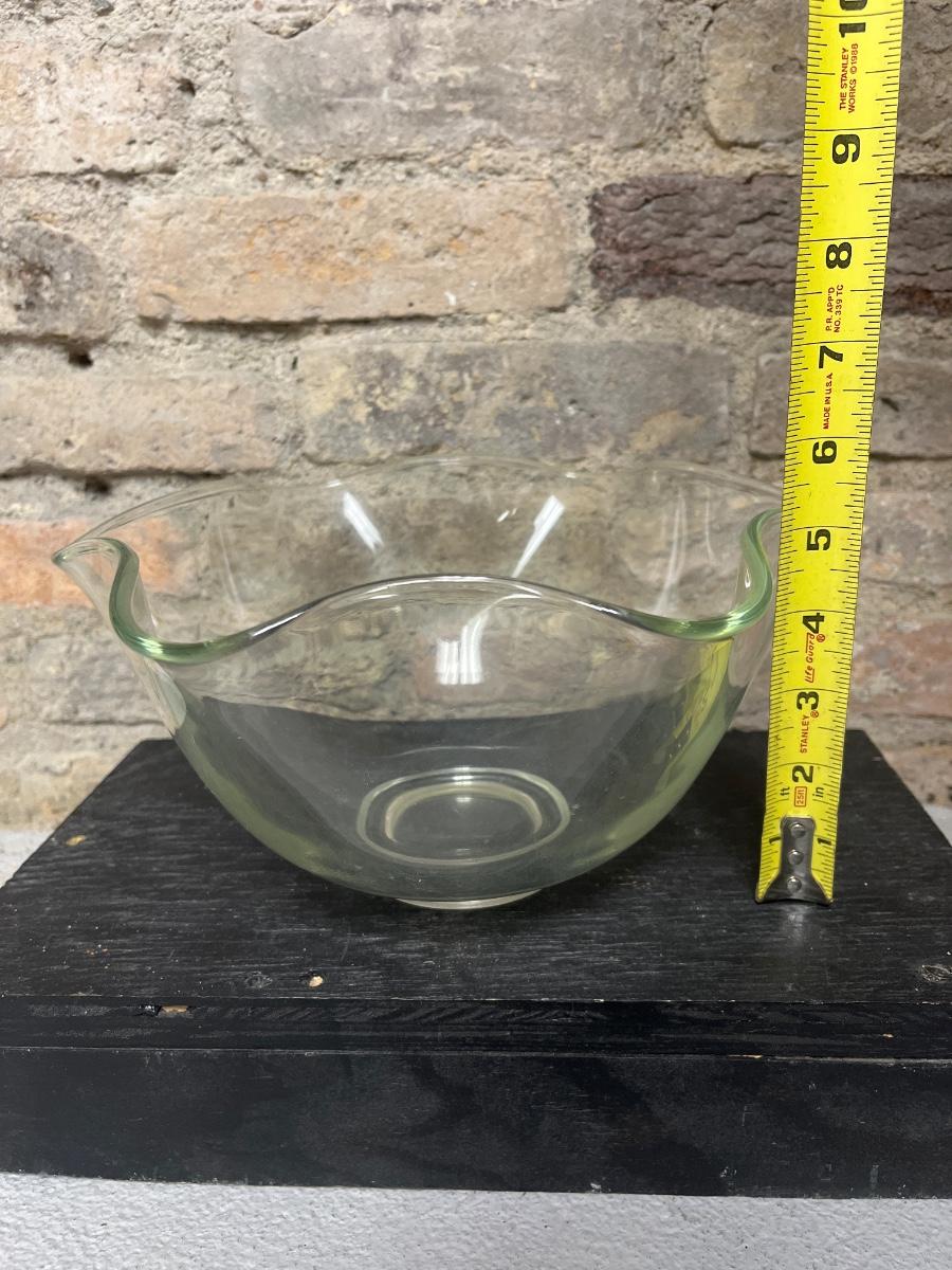 Scalloped glass serving bowl, Anchor Hocking basket weave vase, Bartlett and Collins “Golden Grape” pitcher with wear and chips at spout, vintage genie bottle decanter w/o stopper, , Anchor Hocking candy dish, and teeny tiny ampule