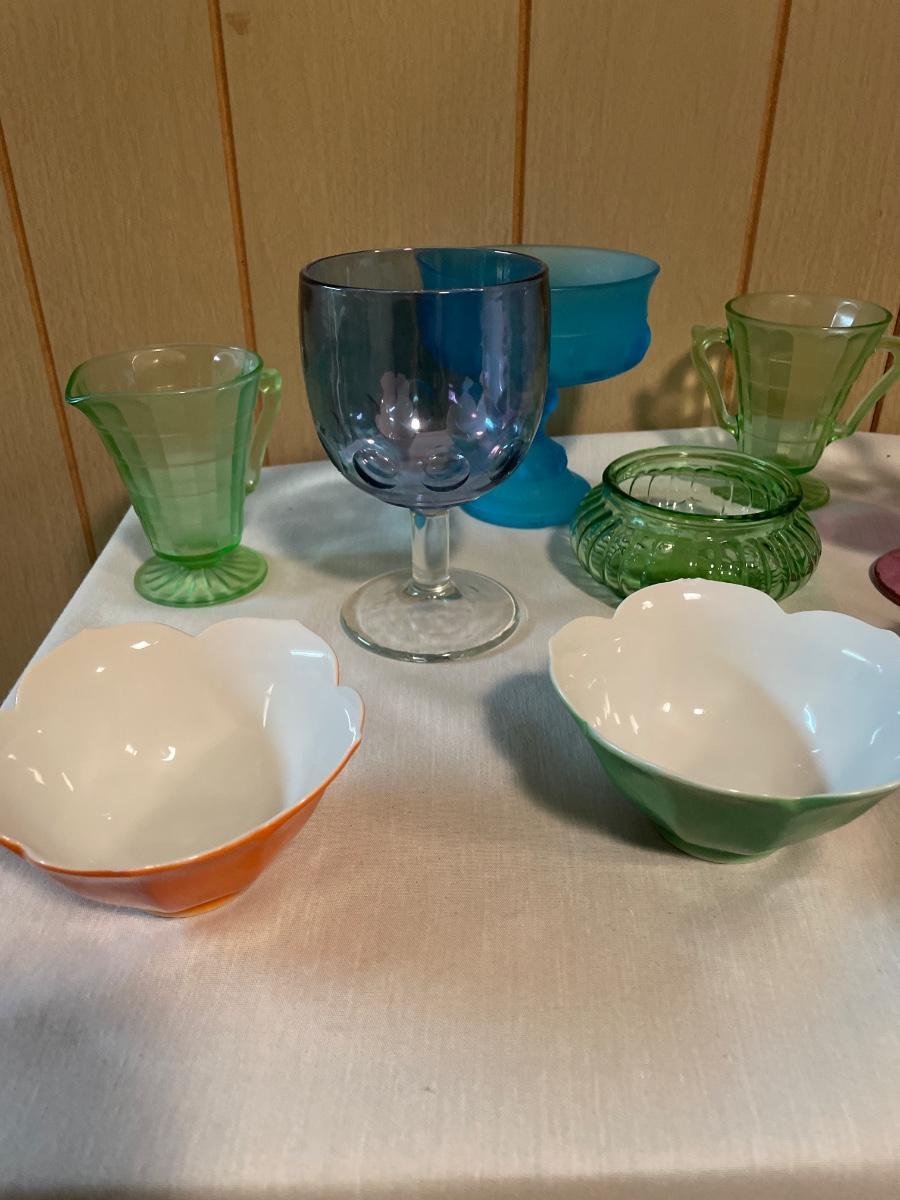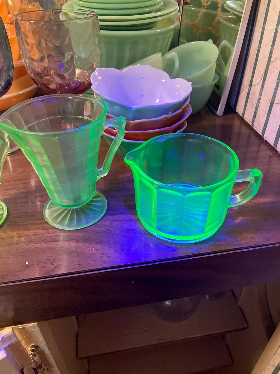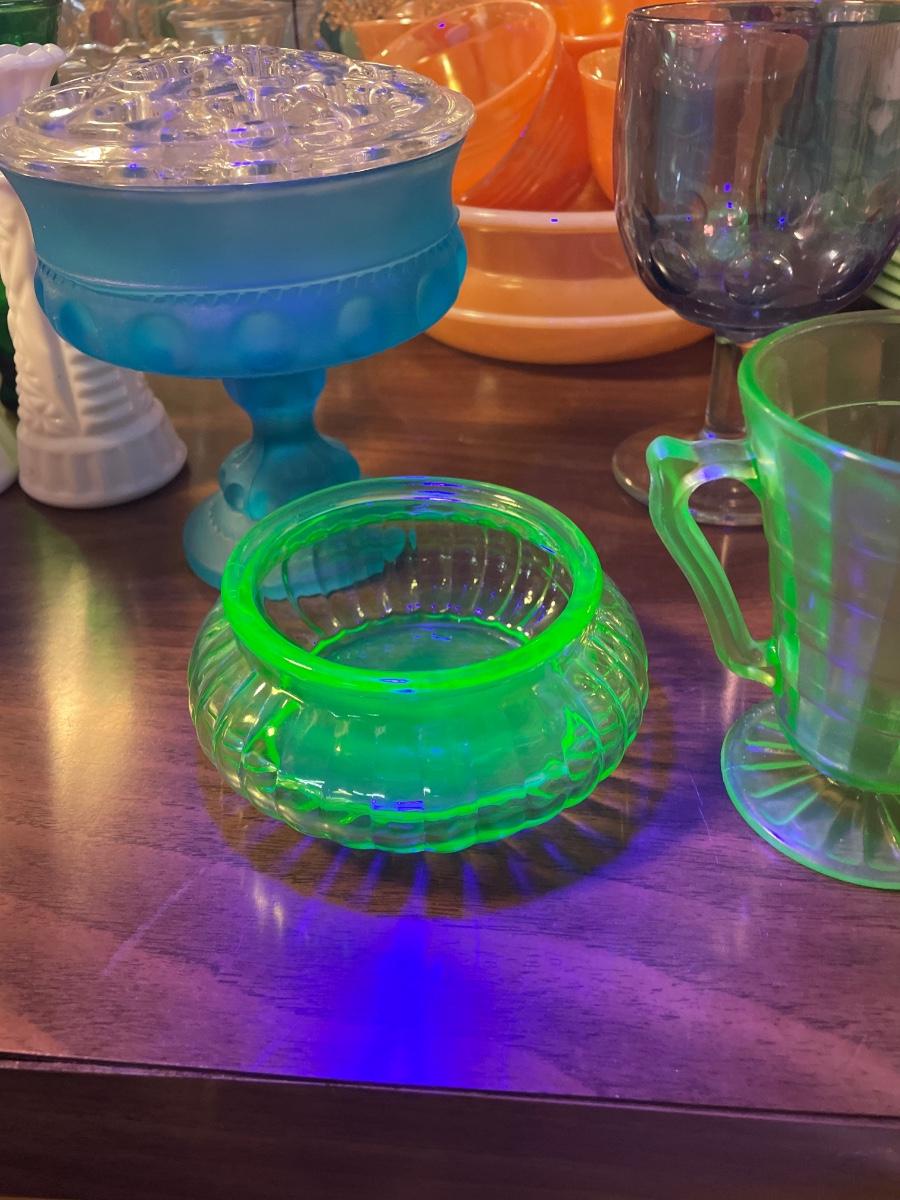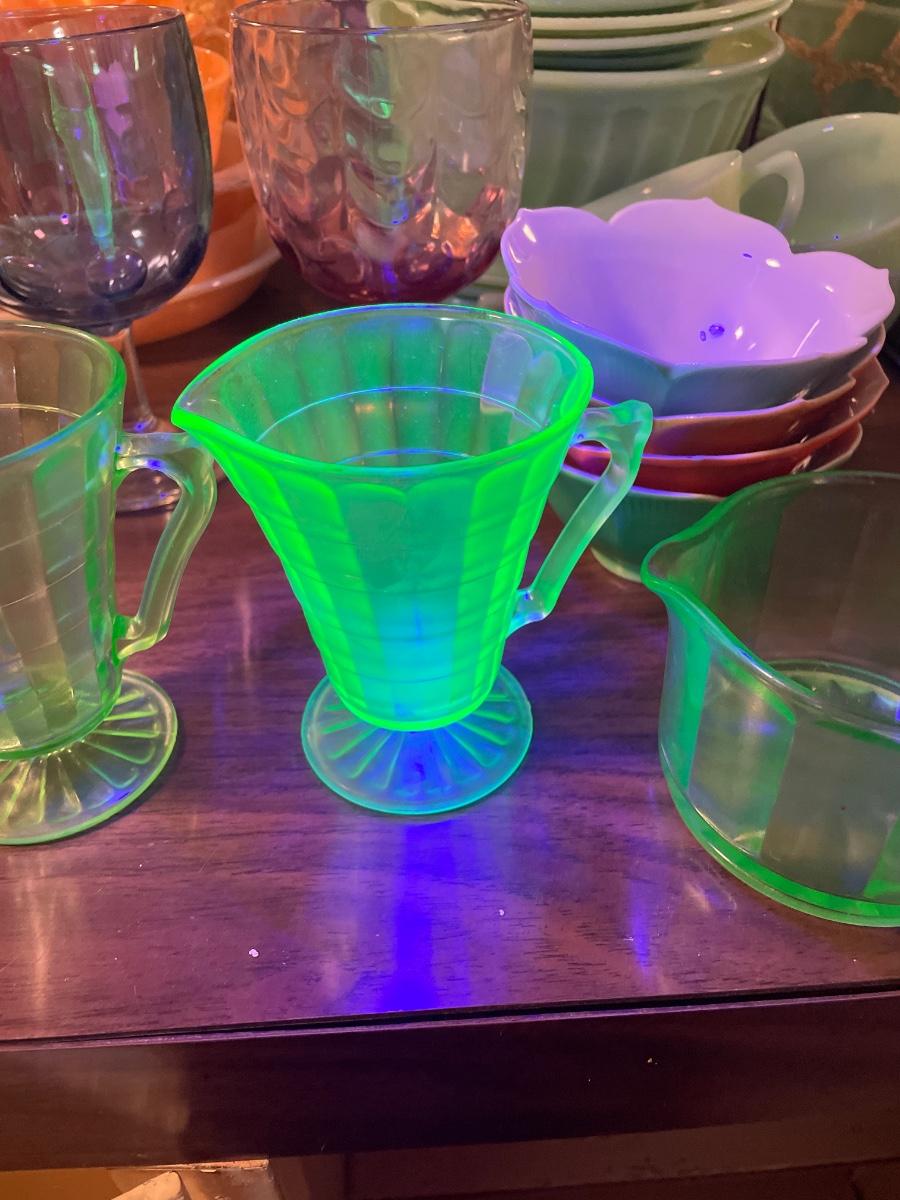 Misc glassware and ceramics the green glass is Uranium see pics under the black light.