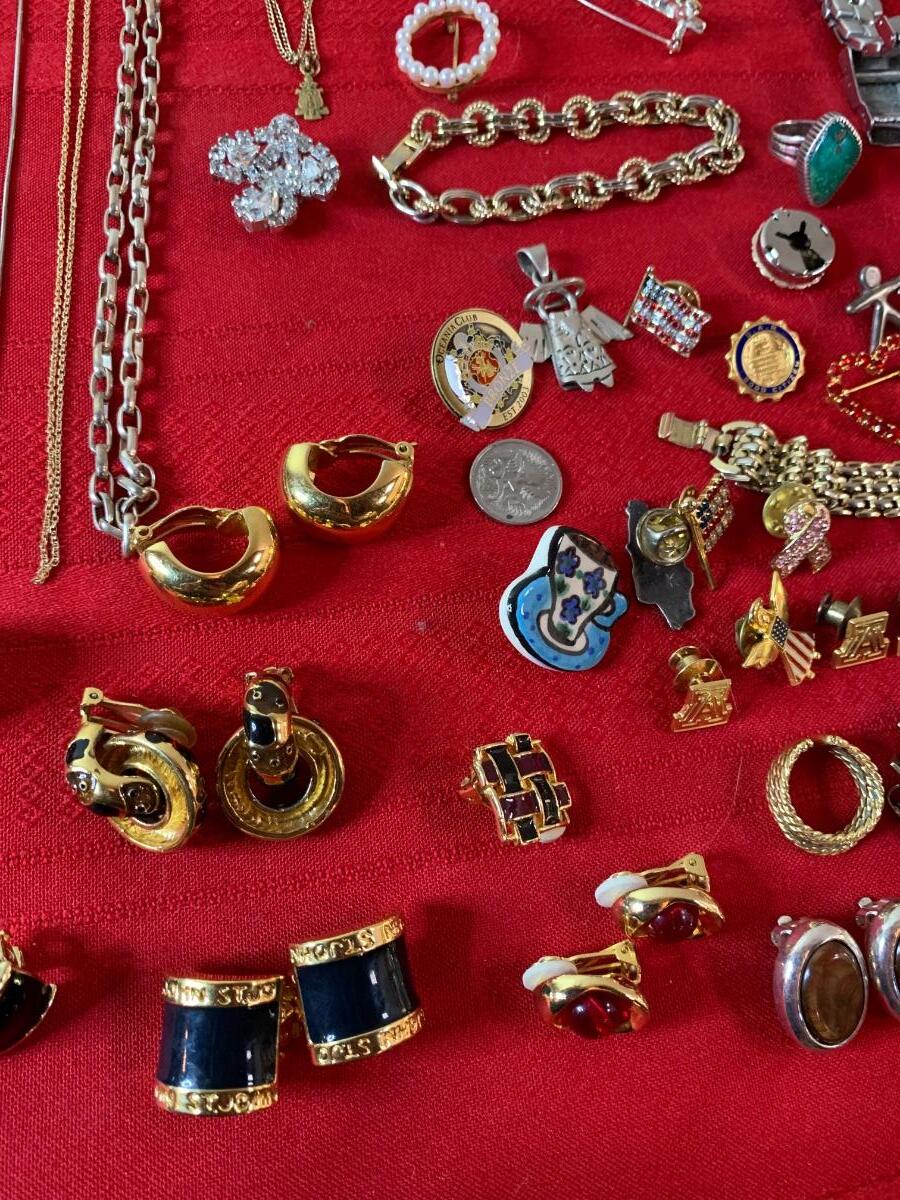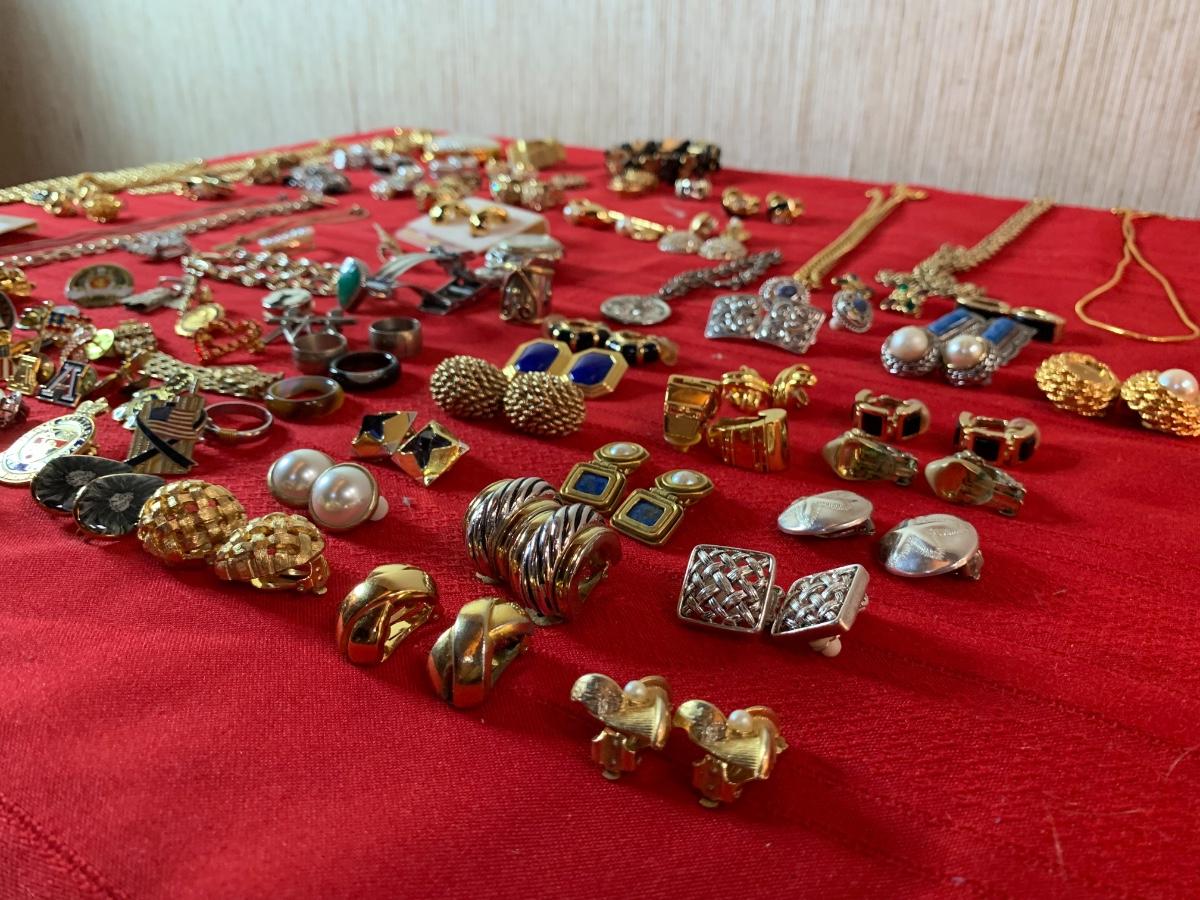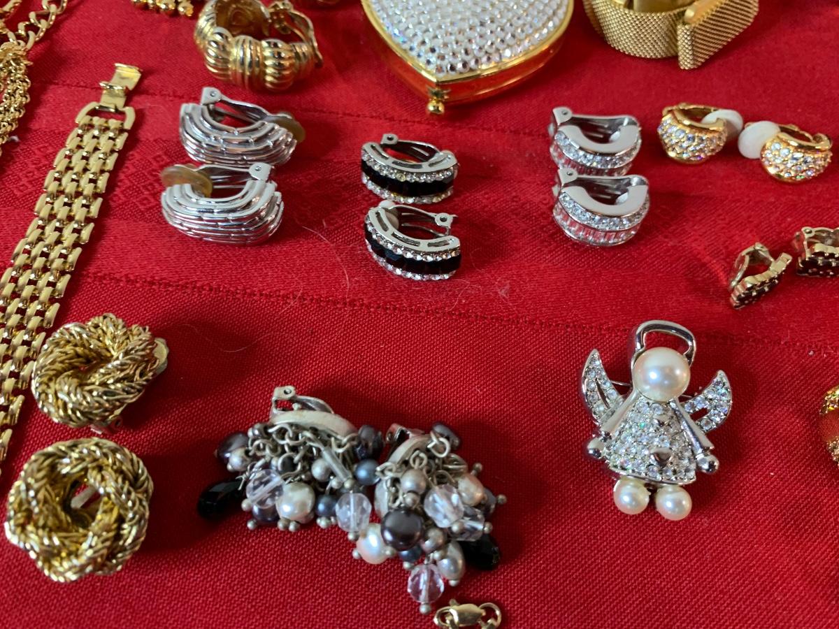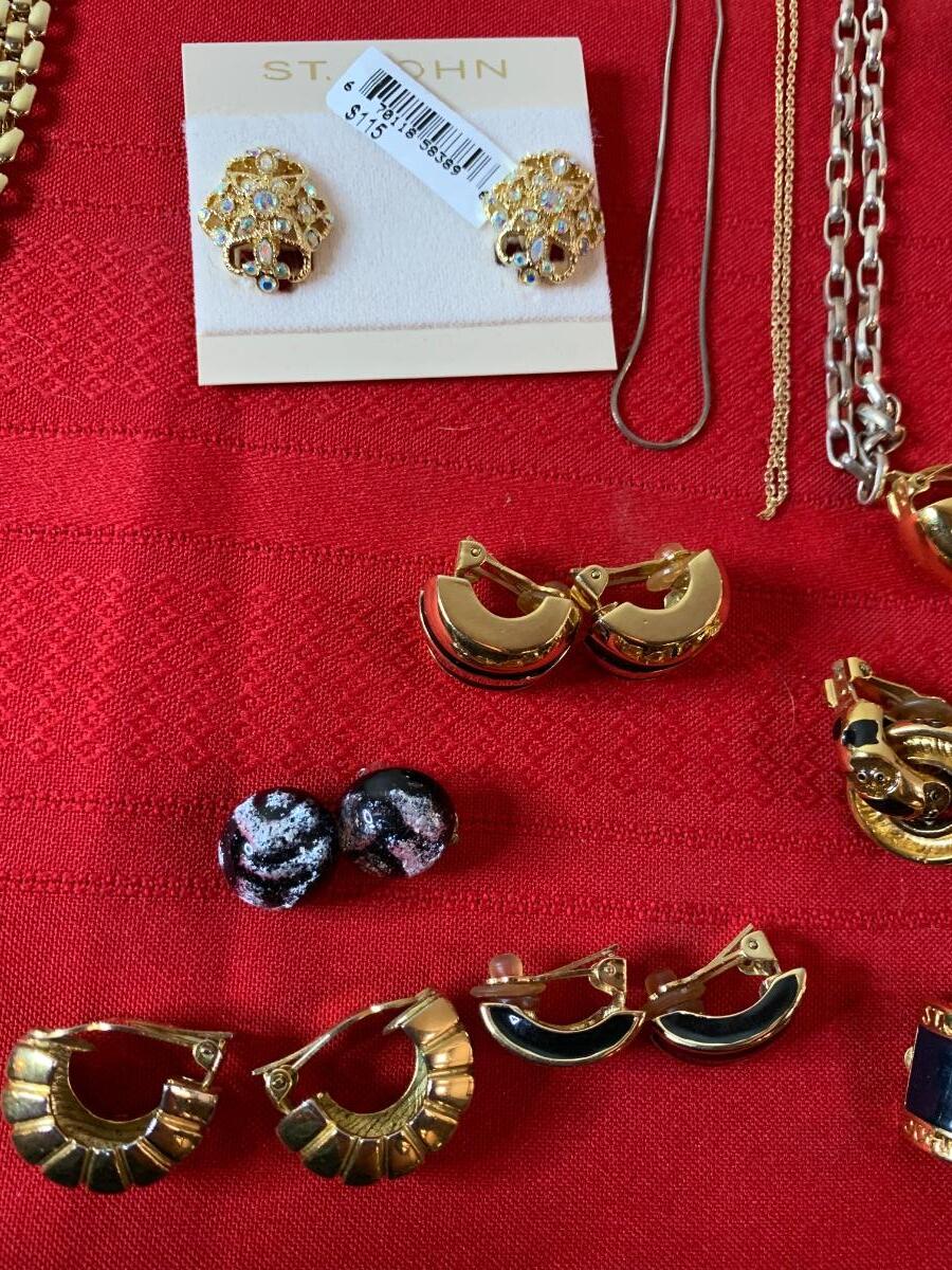 Misc jewelry including a mix of costume and high end. Many clip on earrings, necklaces including one 925 silver and one 14k gold chain necklace, bracelets and more