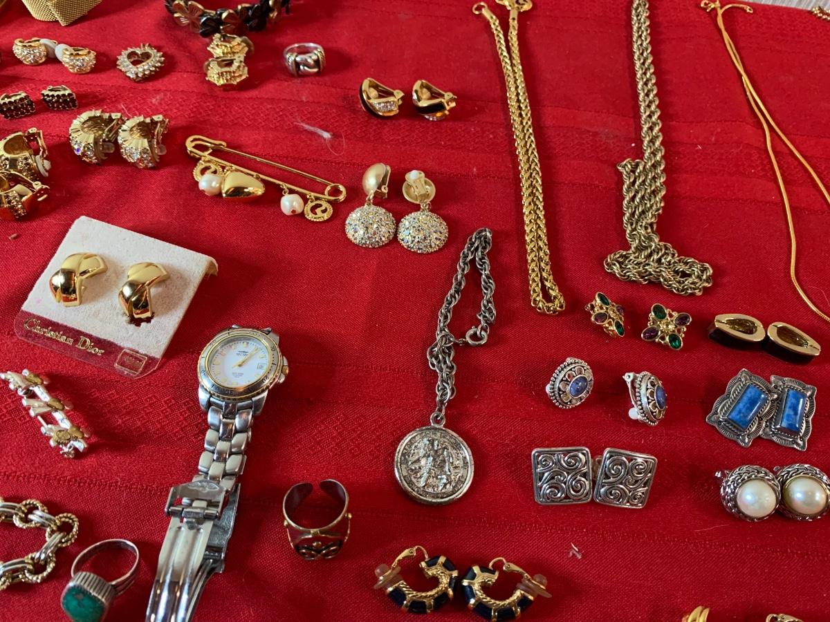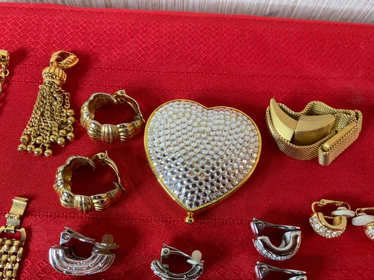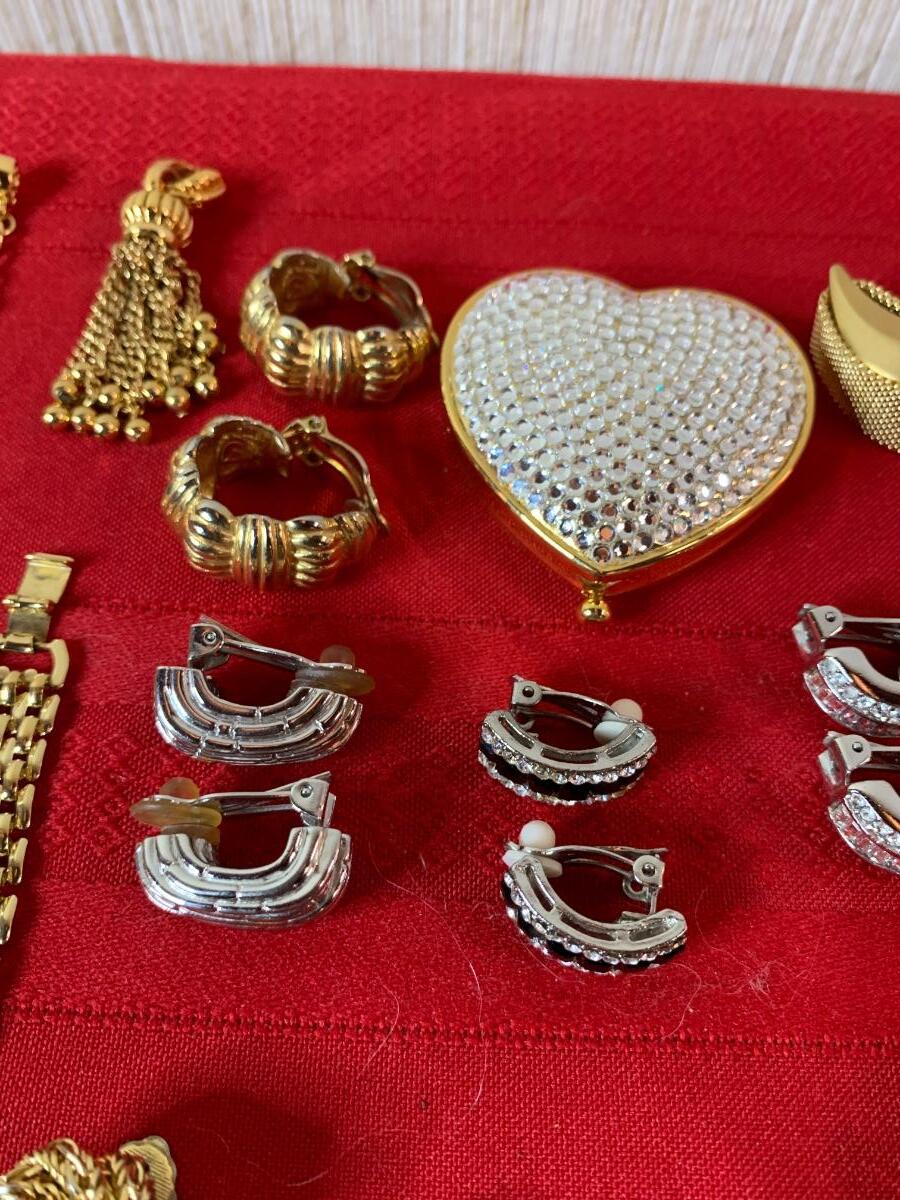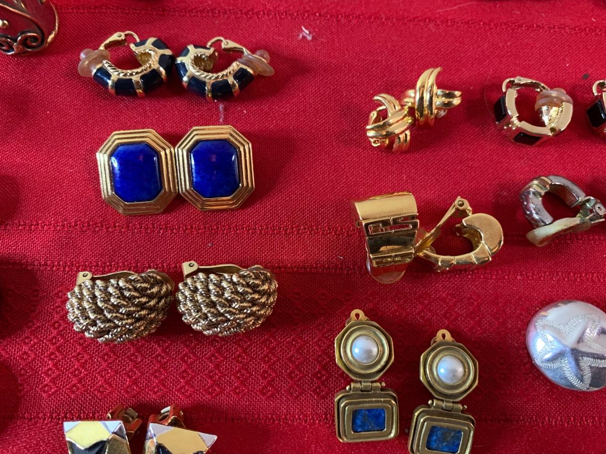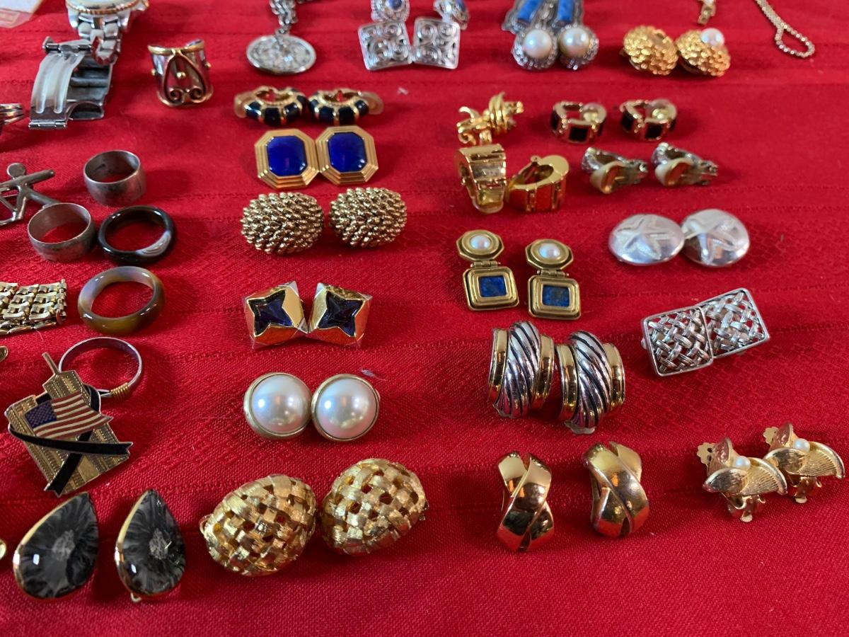 Misc jewelry including a mix of costume and high end. Many clip on earrings, necklaces including one 925 silver and one 14k gold chain necklace, bracelets and more