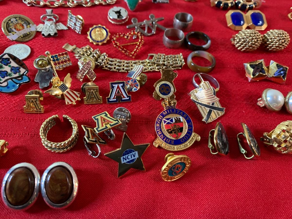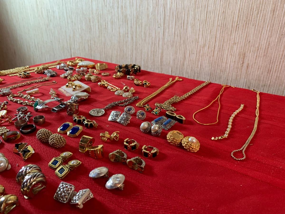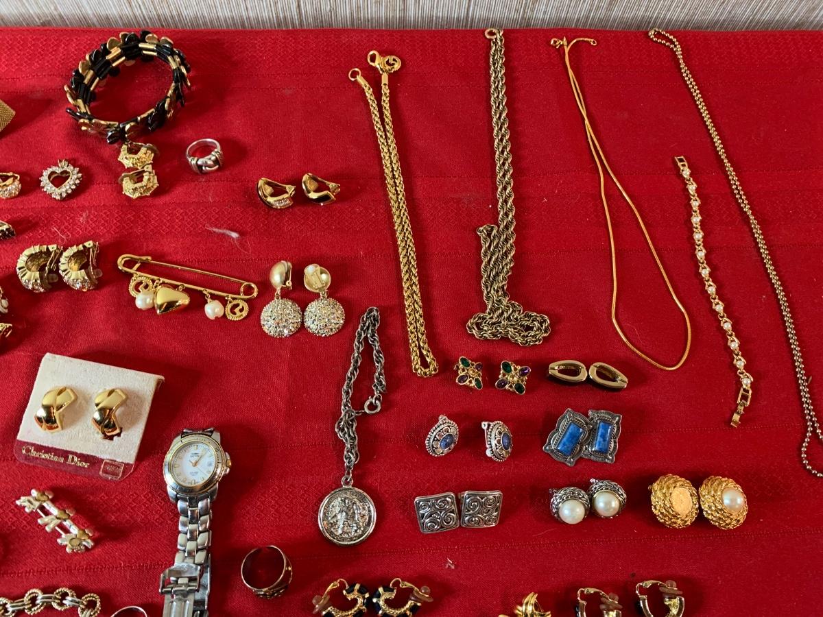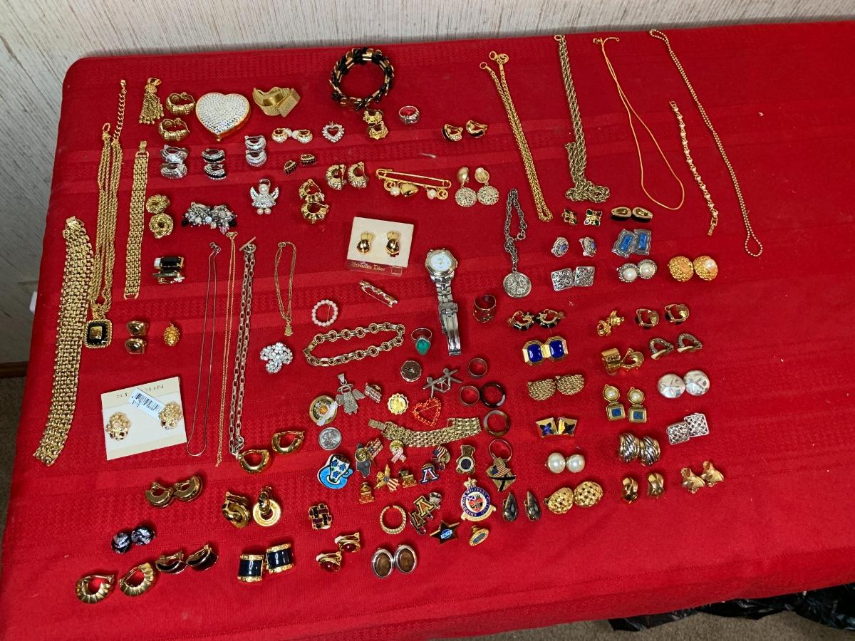 Misc jewelry including a mix of costume and high end. Many clip on earrings, necklaces including one 925 silver and one 14k gold chain necklace, bracelets and more