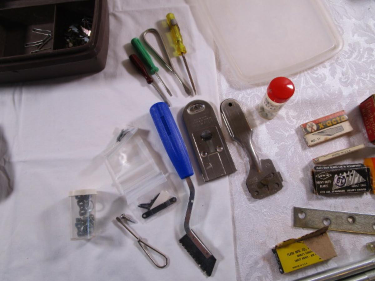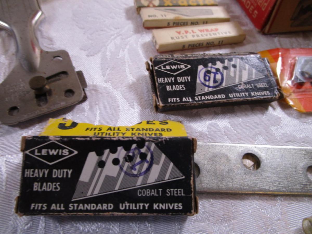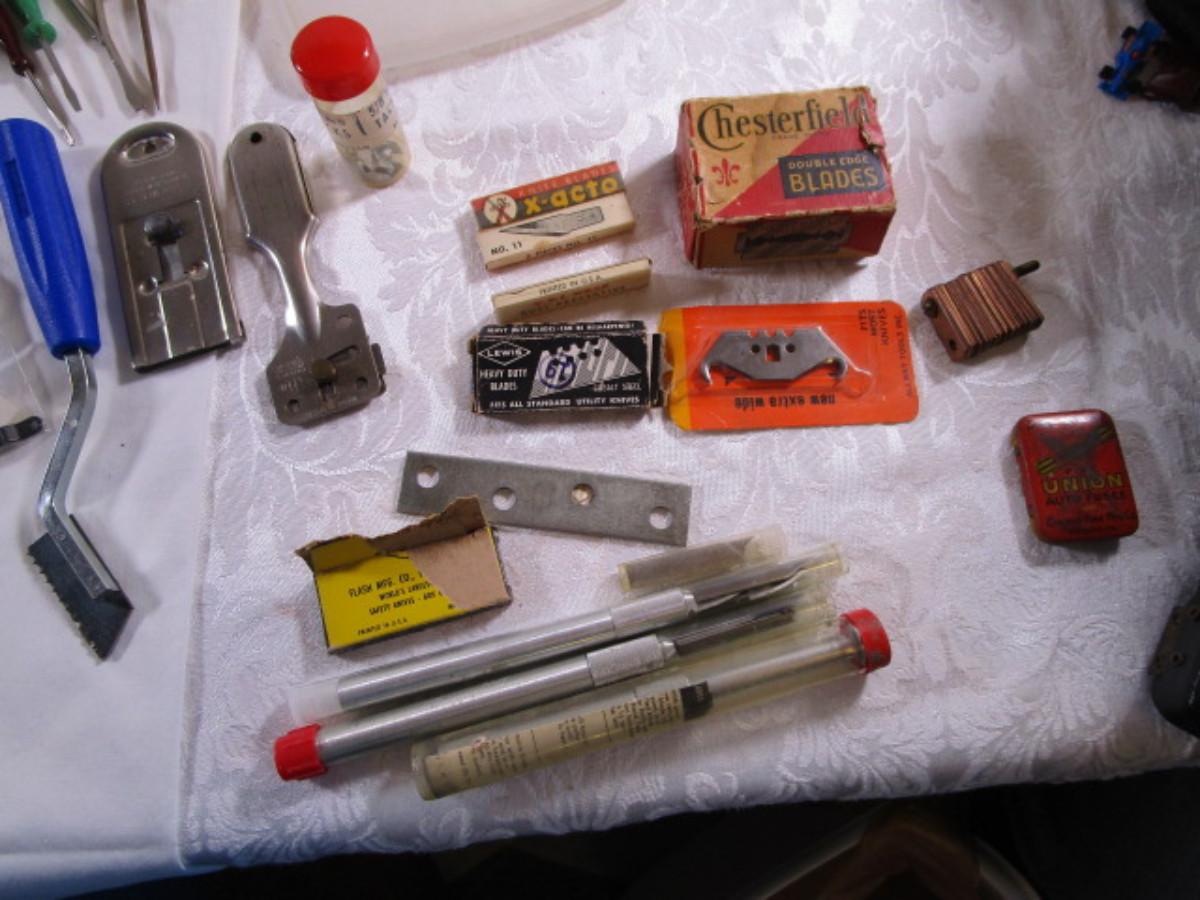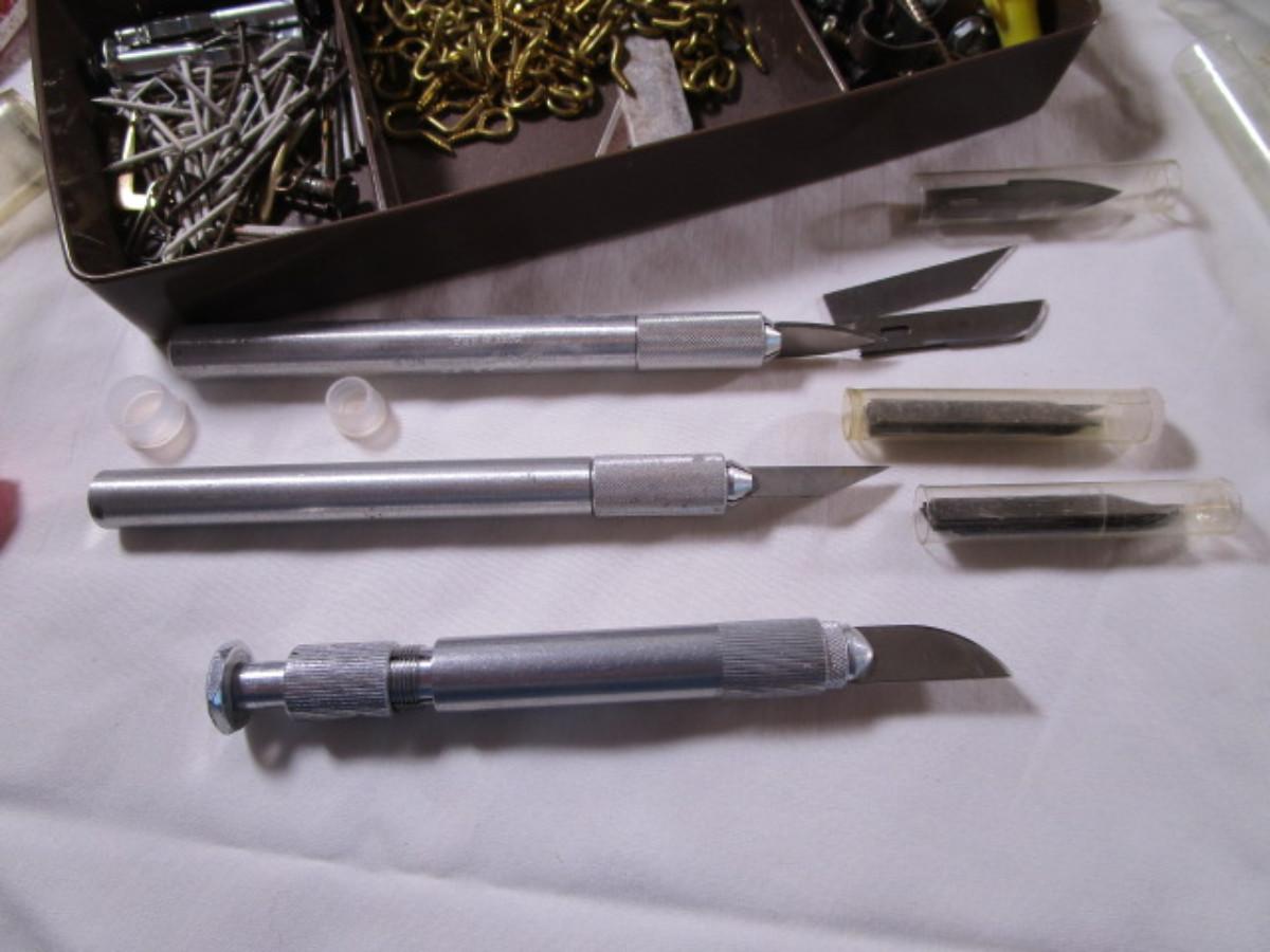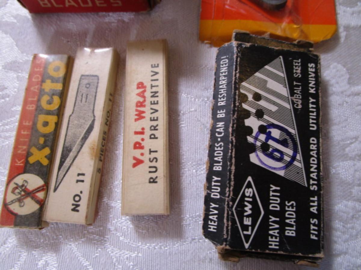 Razor blades, Exacto knives & blades, mini screwdriver, etc. in Tupperware container 9-3/8" x 6-1/2" x 2-1/2" tall, See pictures