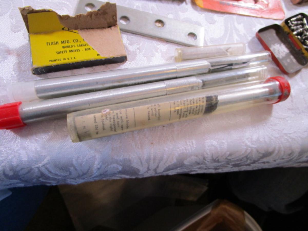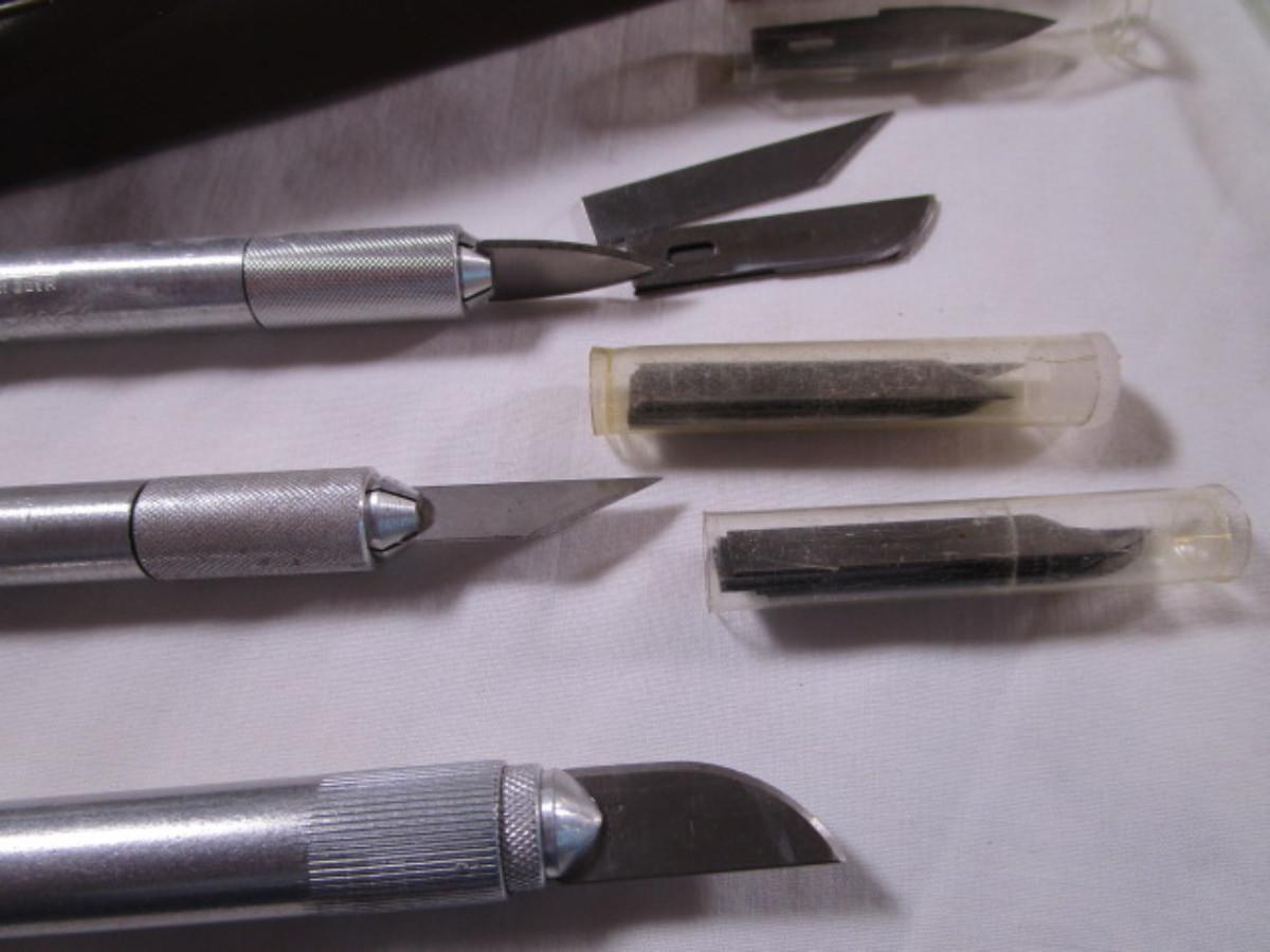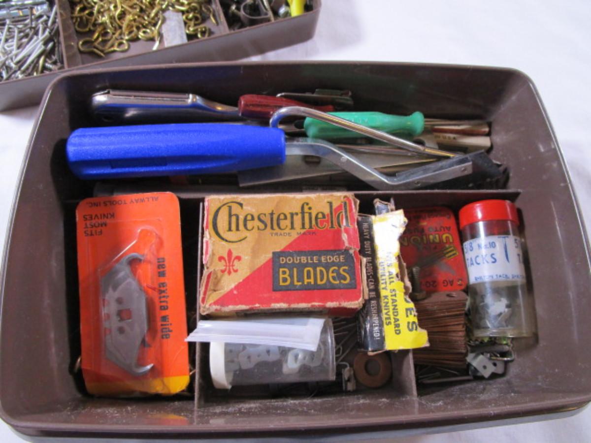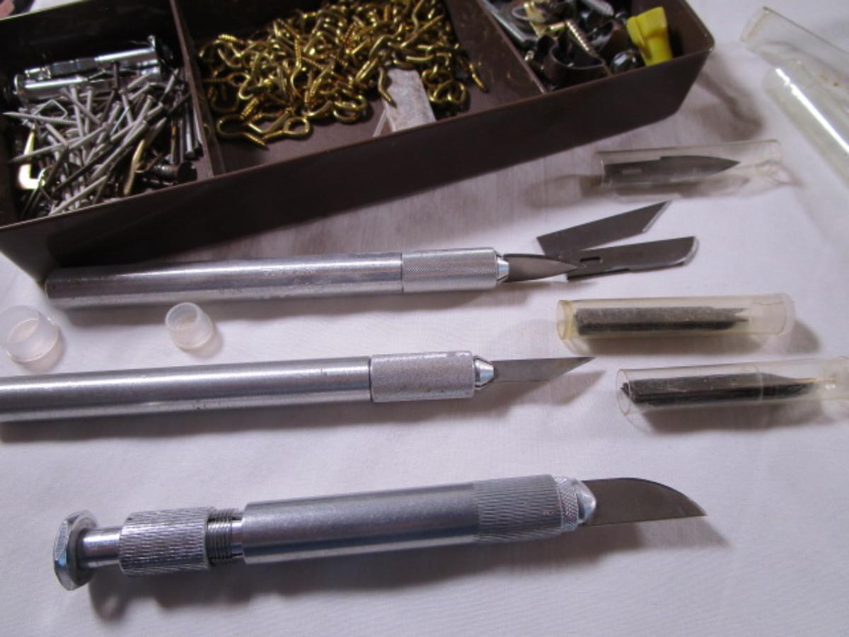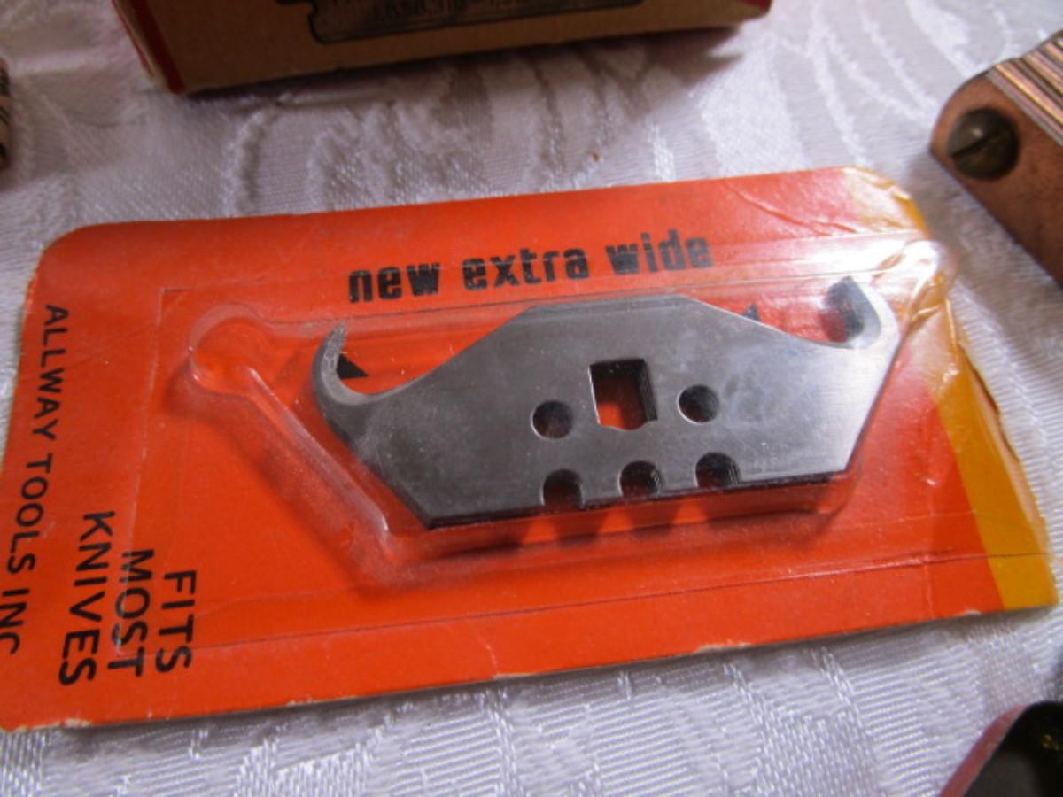 Razor blades, Exacto knives & blades, mini screwdriver, etc. in Tupperware container 9-3/8" x 6-1/2" x 2-1/2" tall, See pictures