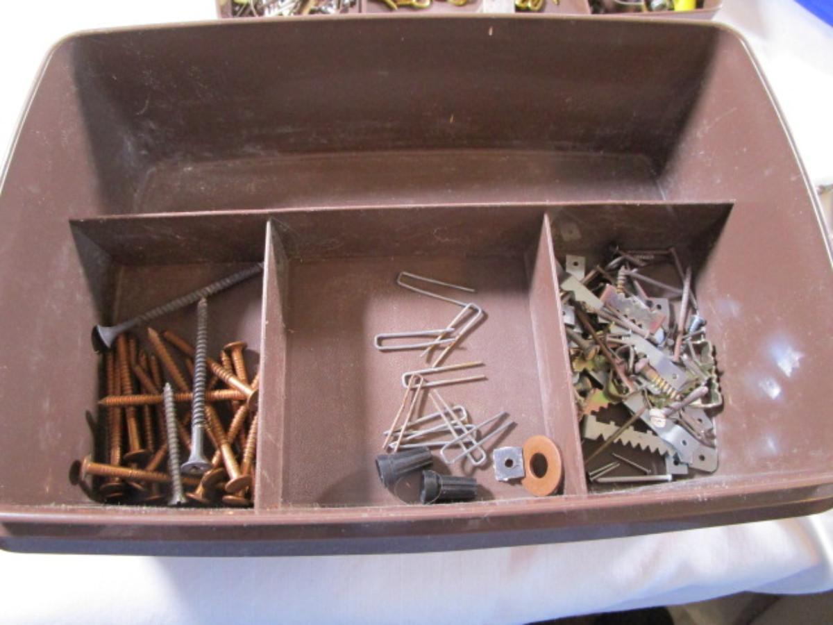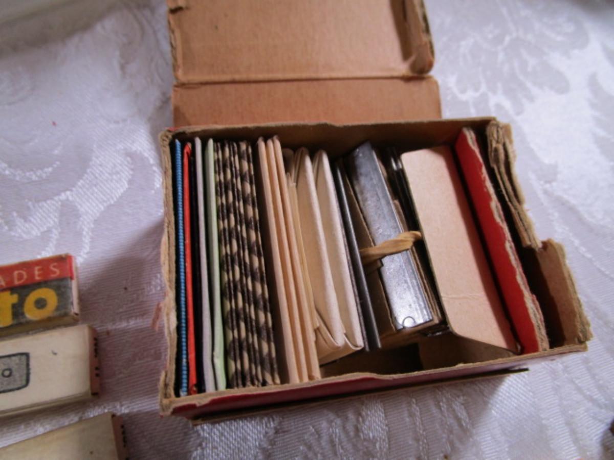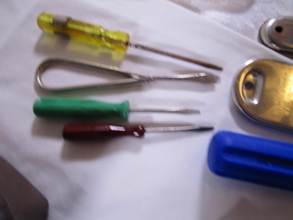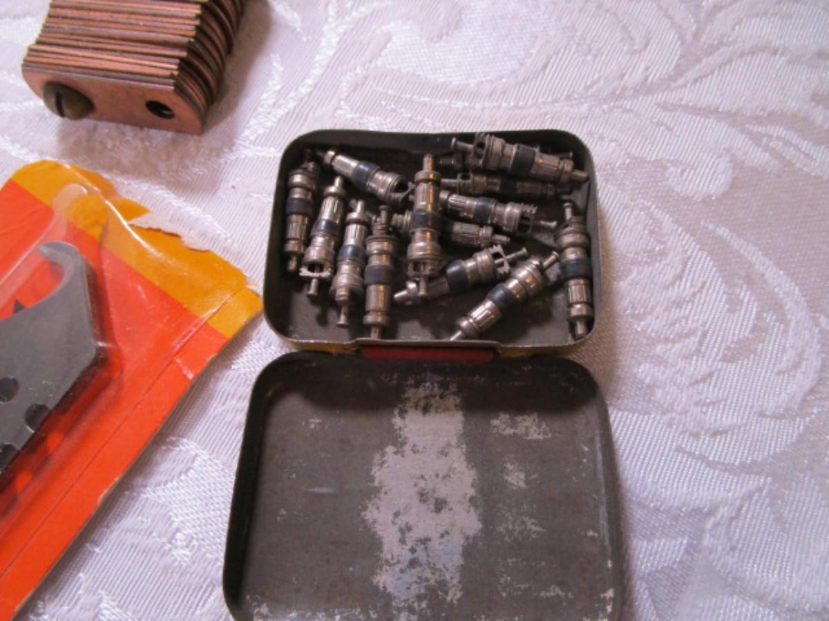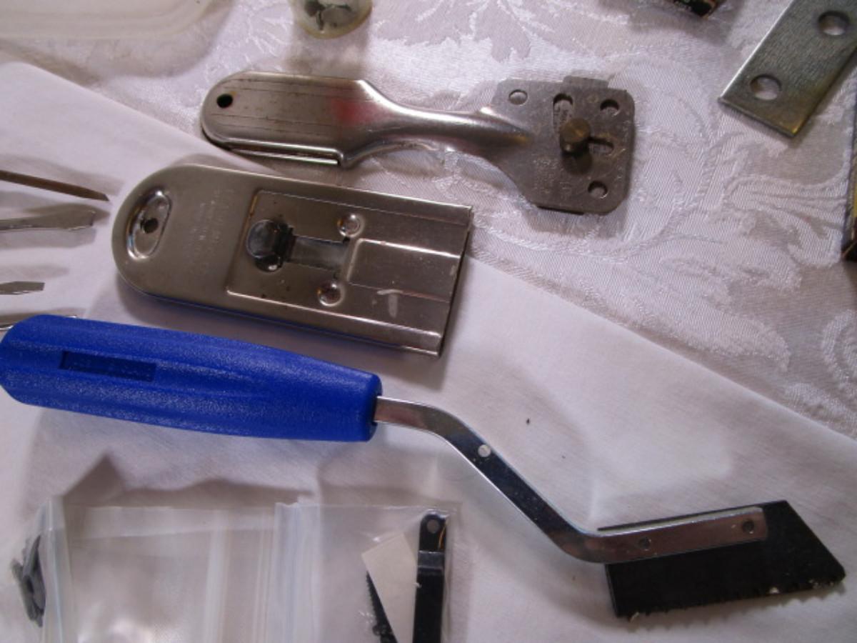 Razor blades, Exacto knives & blades, mini screwdriver, etc. in Tupperware container 9-3/8" x 6-1/2" x 2-1/2" tall, See pictures